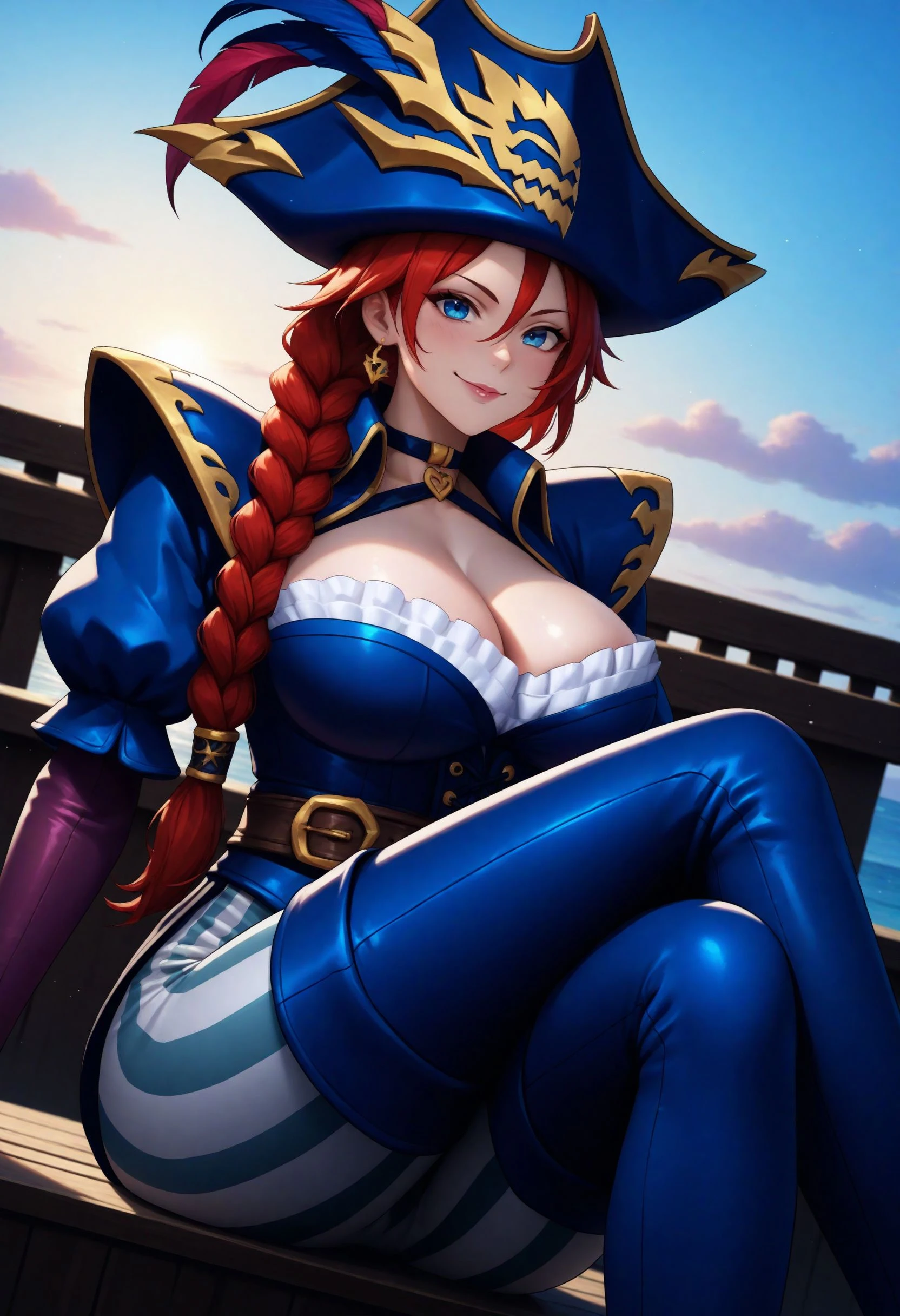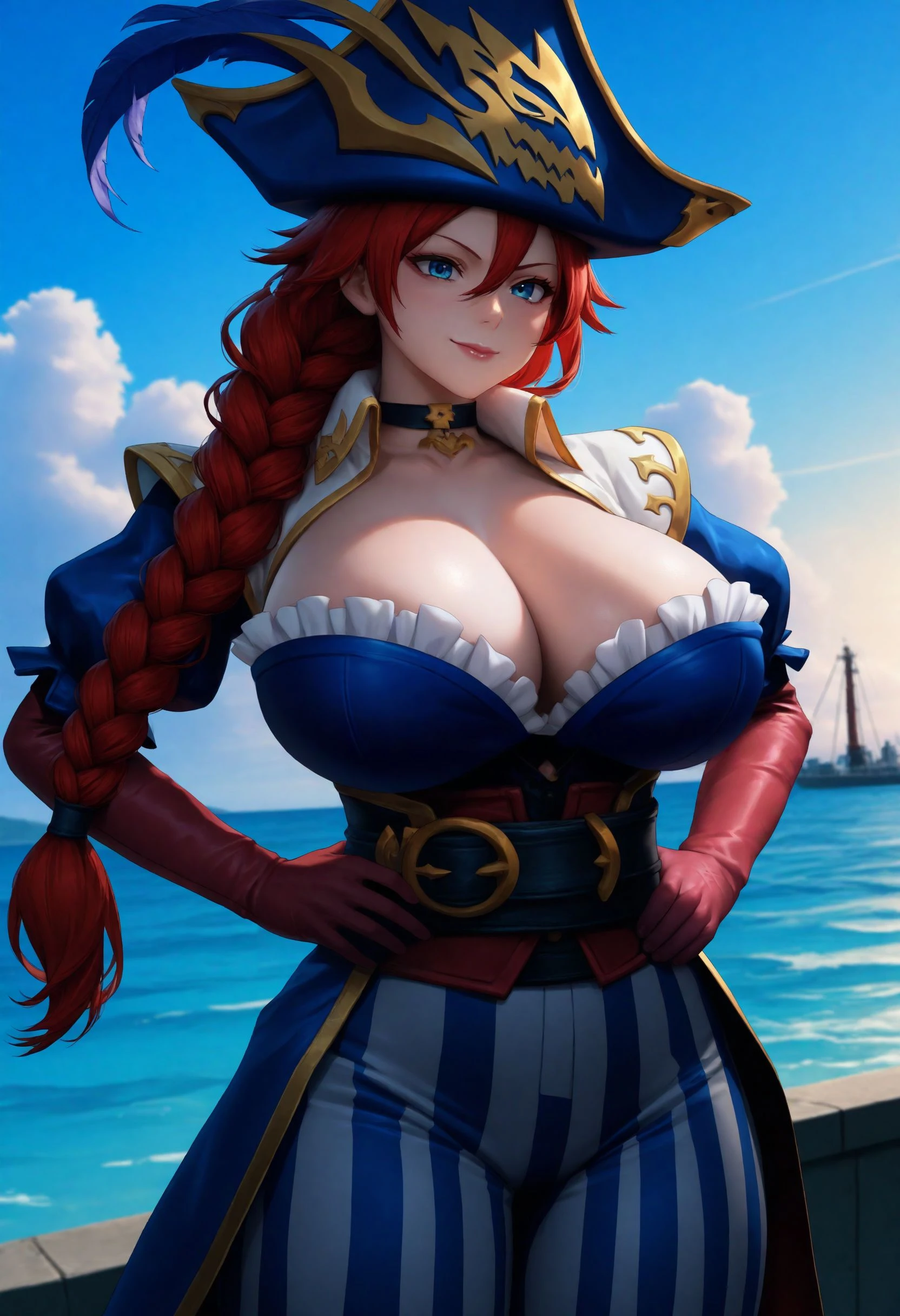 • Captain Outfit: captain_fortune, red hair, hair between eyes, single braid, braided ponytail, ponytail over shoulder, blue eyes, pirate hat, hat feather, choker, black corset, cleavage, puffy sleeves, purple elbow gloves, grey pants, vertical striped pants, dark blue footwear, thigh boots,