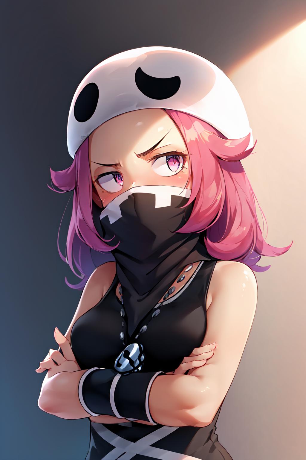 Default Outfit: covered mouth, bandana, hat, tank top, short shorts, wristband, jewelry, necklace