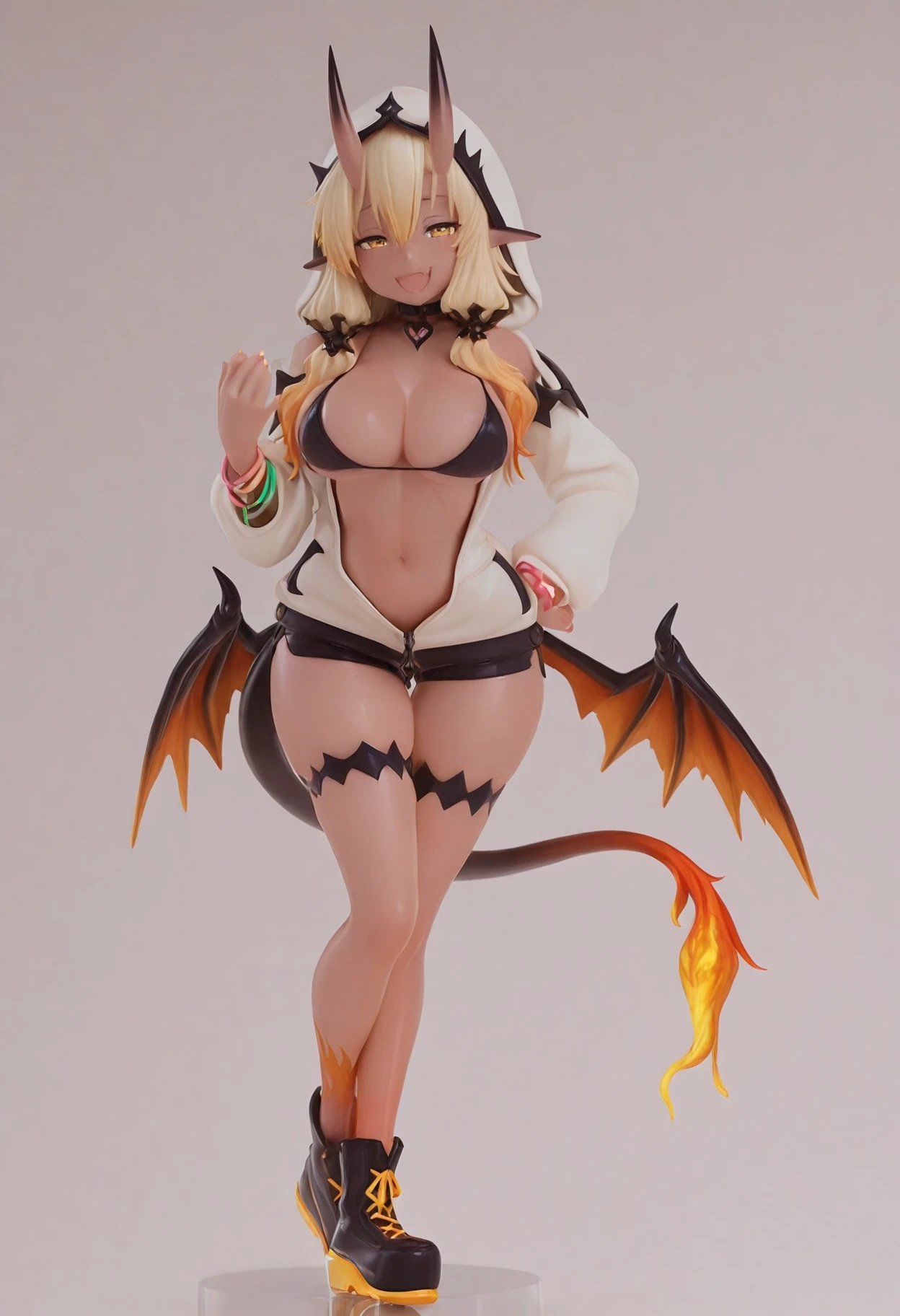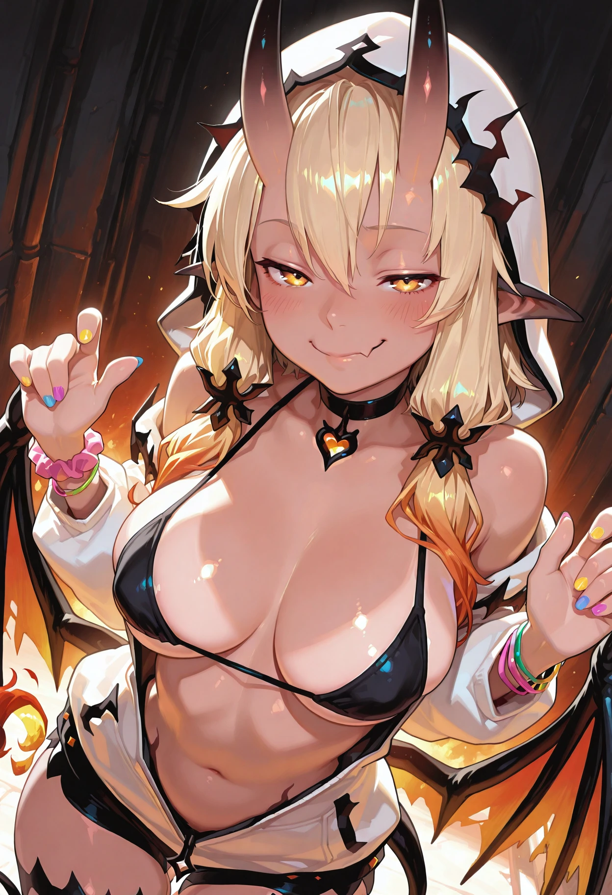reddish skin, blonde hair, multicolored hair, orange hair tips, long hair, twintails, low twintails, yellow eyes, orange eyes, medium breasts, navel, nail polish, multicolored nails, black tattoos, leg tattoo