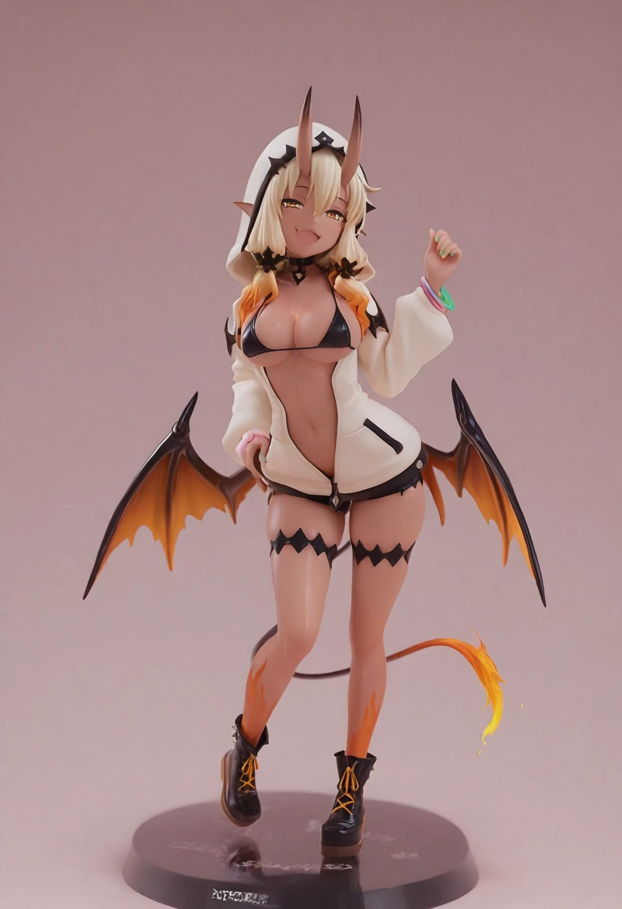 pyrowmge, demon girl, demon tail, flame-tipped tail, black tail, demon wings, multicolored wings, low wings, oni horns, straight horns, skin horns, pointy ears, animal ears, black ears, fire