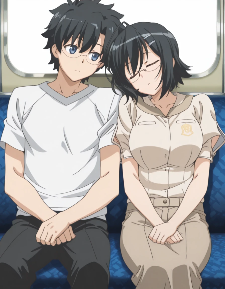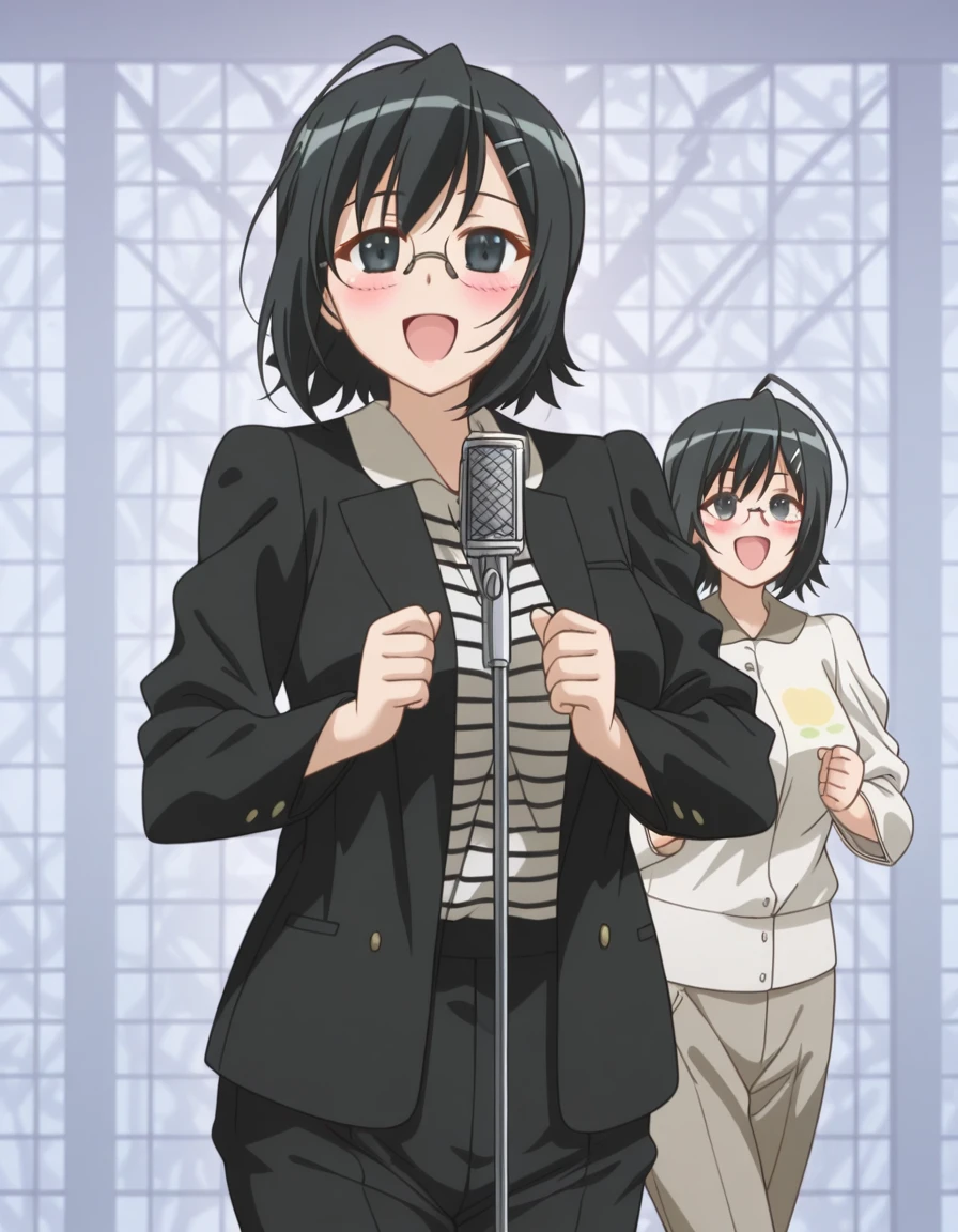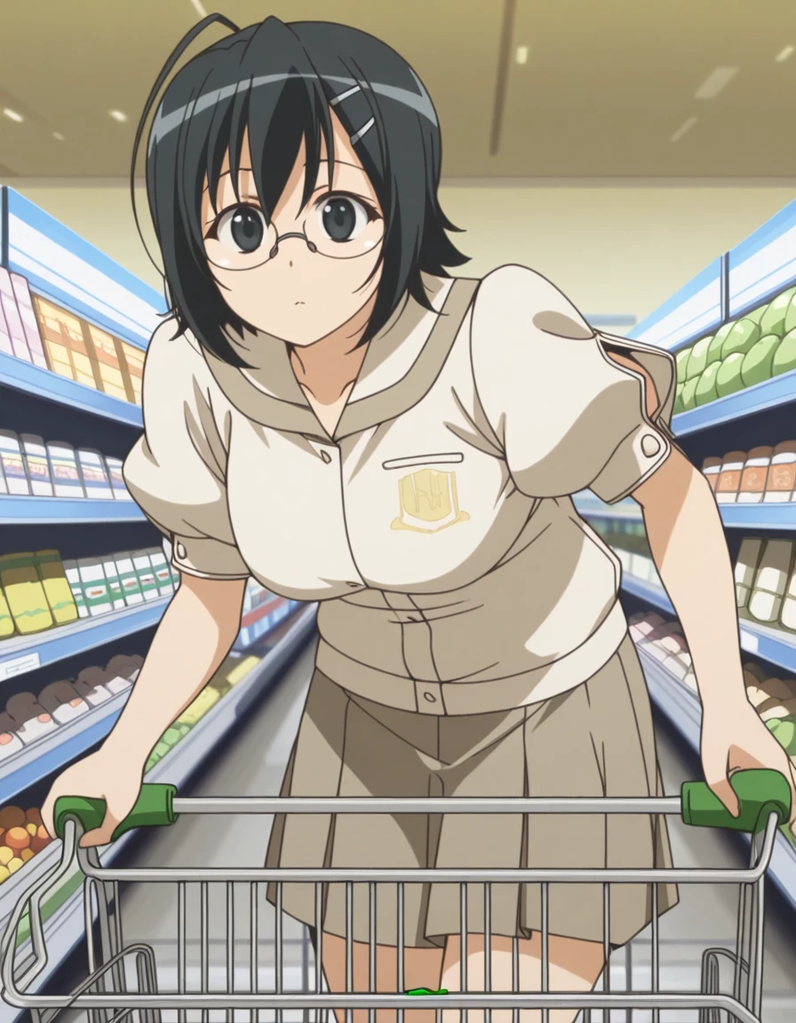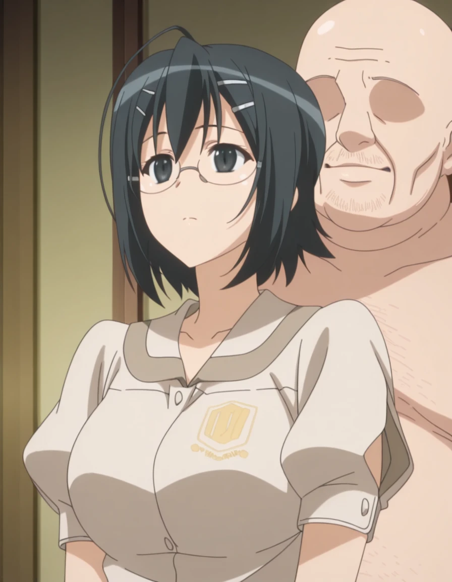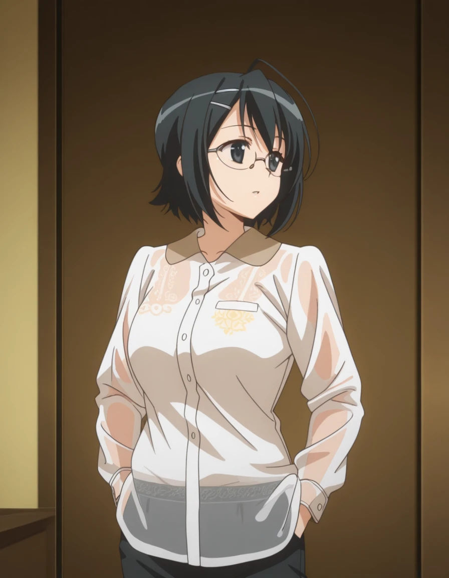 nao yorihime, short hair, black hair, hair ornament, ahoge, glasses, hairclip, black eyes, mature female, breasts, anime screencap