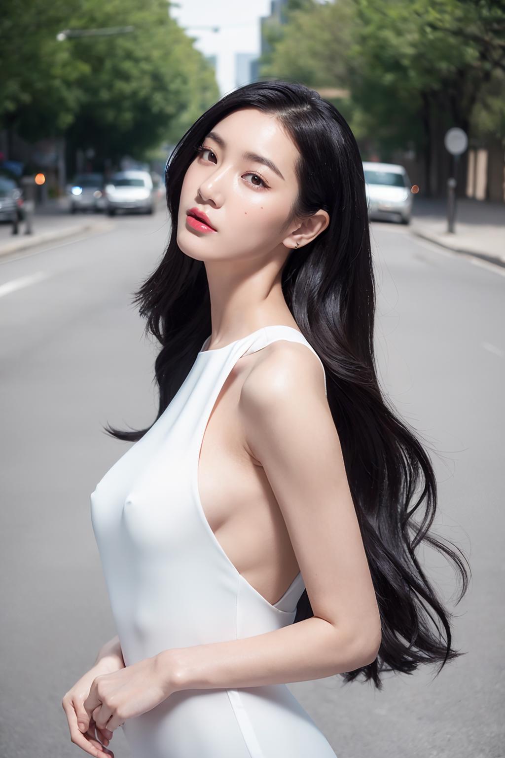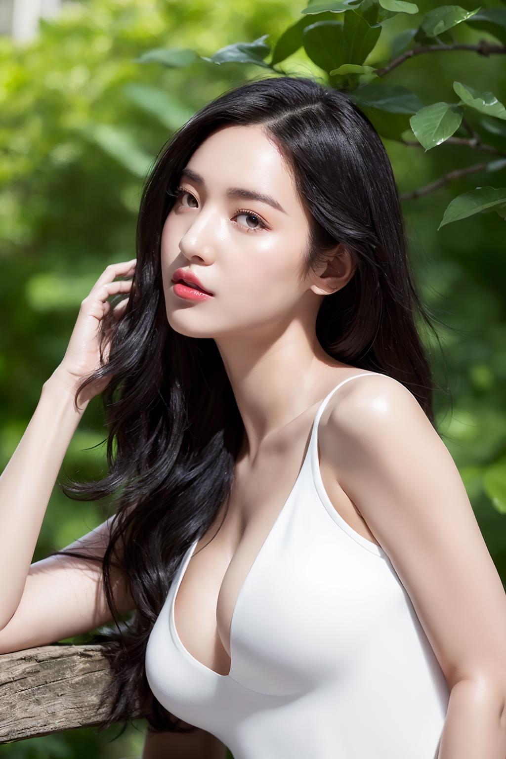 正面提示词Positive prompt:best quality,masterpiece,(photorealistic:1.4),raw photo,(Authentic skin texture_1.3),1girl,solo,black eyes,long hair,black hair,(half body:1.4),(medium breasts:1.2),(slender:1.2),outdoors,