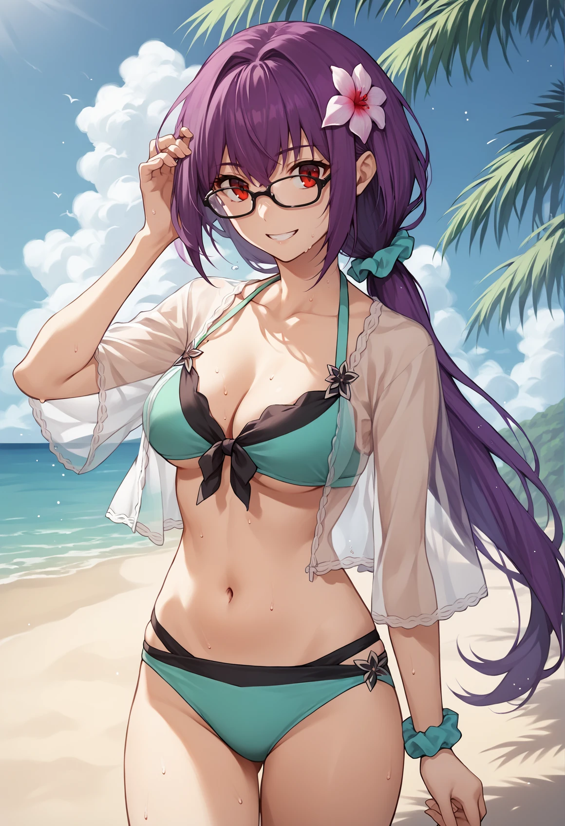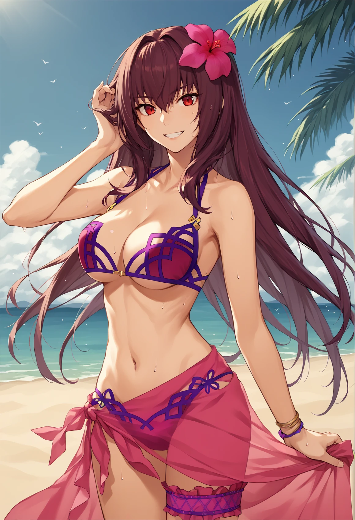 Scathach Swimsuit: long hair, red hair, red eyes, purple bikini, hibiscus, bridal garter, sarong