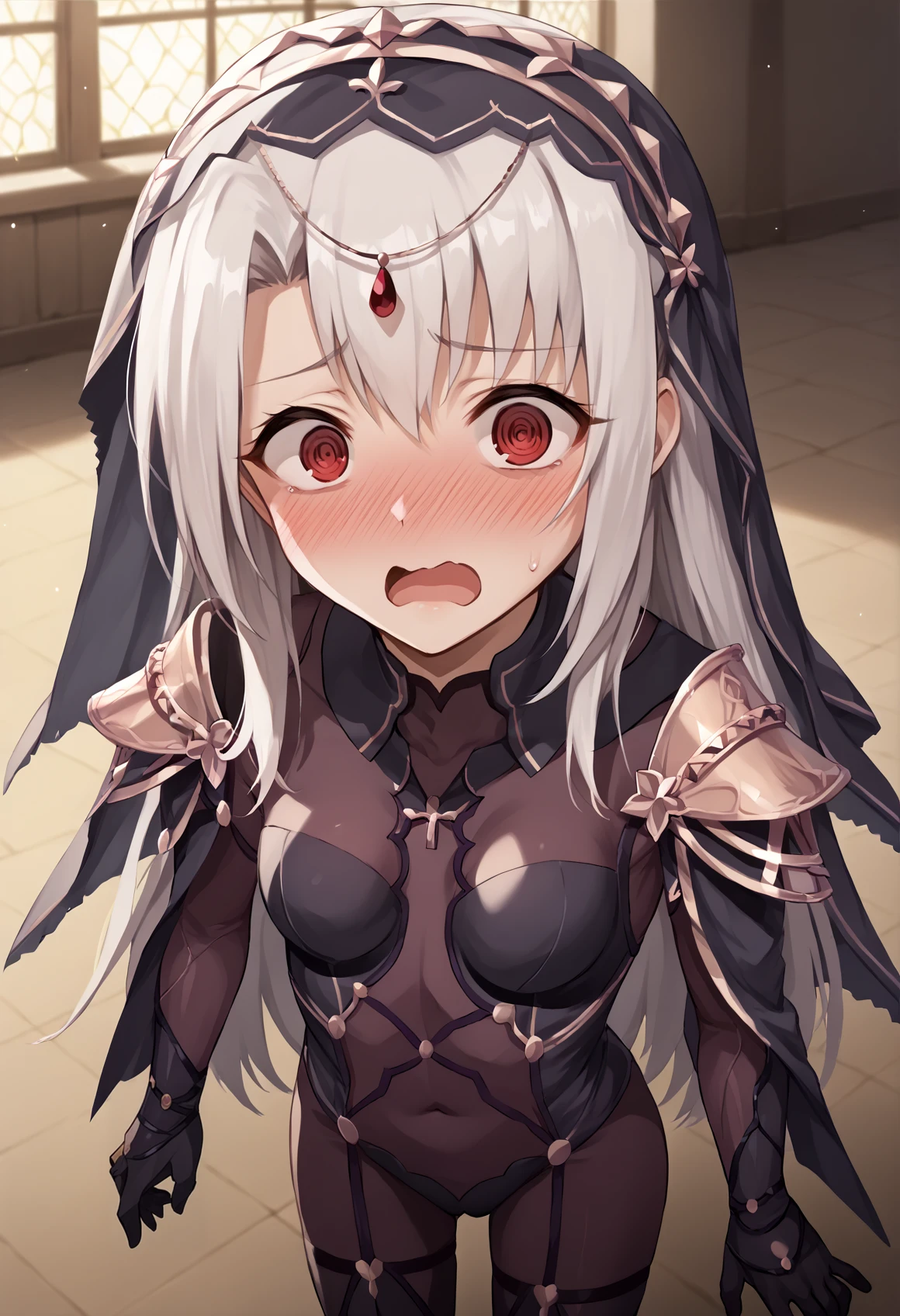 Scathach 2: long hair, red hair, red eyes, bodysuit, gold shoulder pads,veil