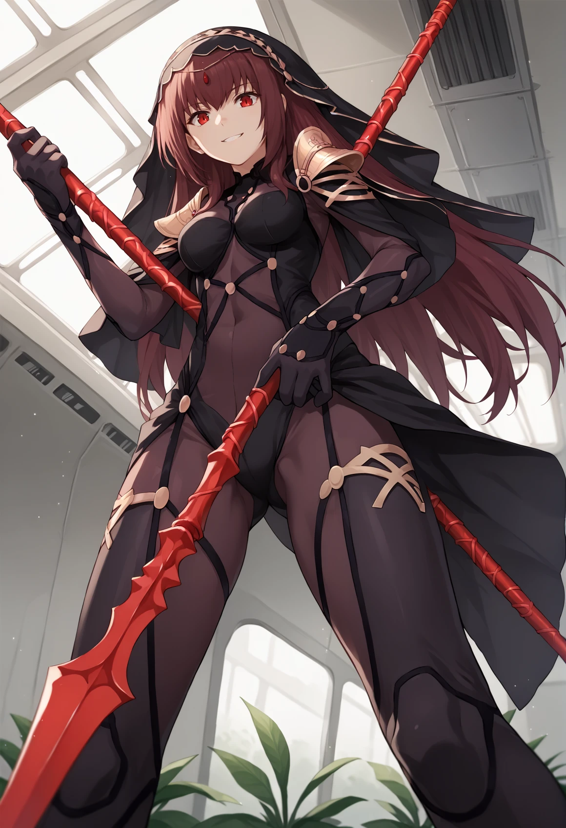 Scathach 1: long hair, red hair, red eyes, bodysuit, silver shoulder pads,