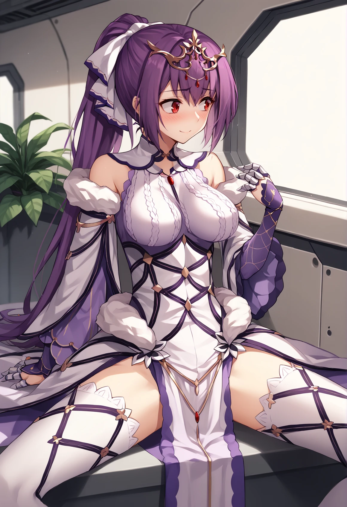 Skadi 2: long hair, purple hair, red eyes, hair ribbon, ponytail, white dress, gold tiara, detached sleeves, see-through, bridal gauntlets, finger cots, pelvic curtain, capelet, fur trim, Thighhighs