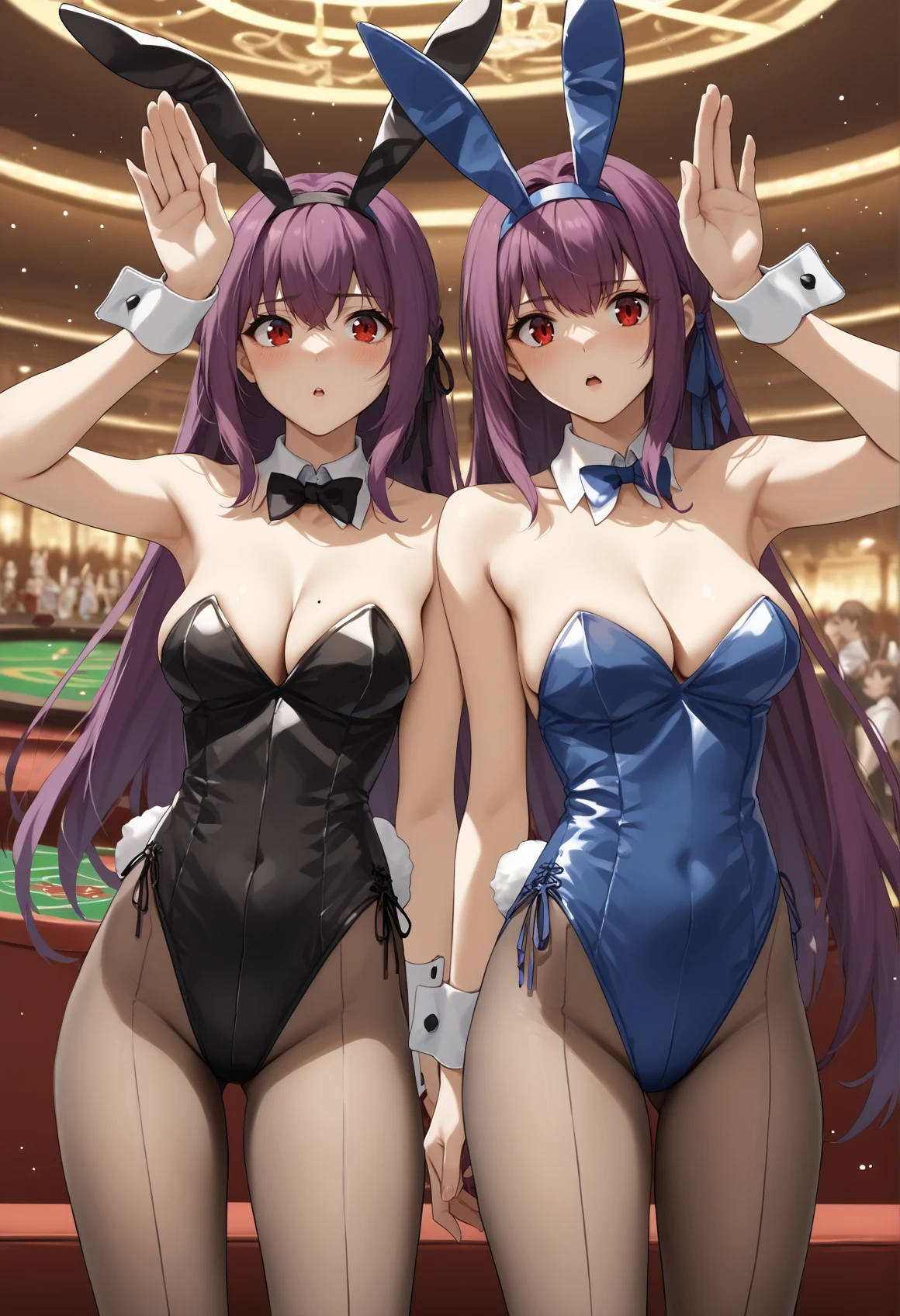 Together: 2girls, long hair, red hair, purple hair, red eyes, sisters, height difference,