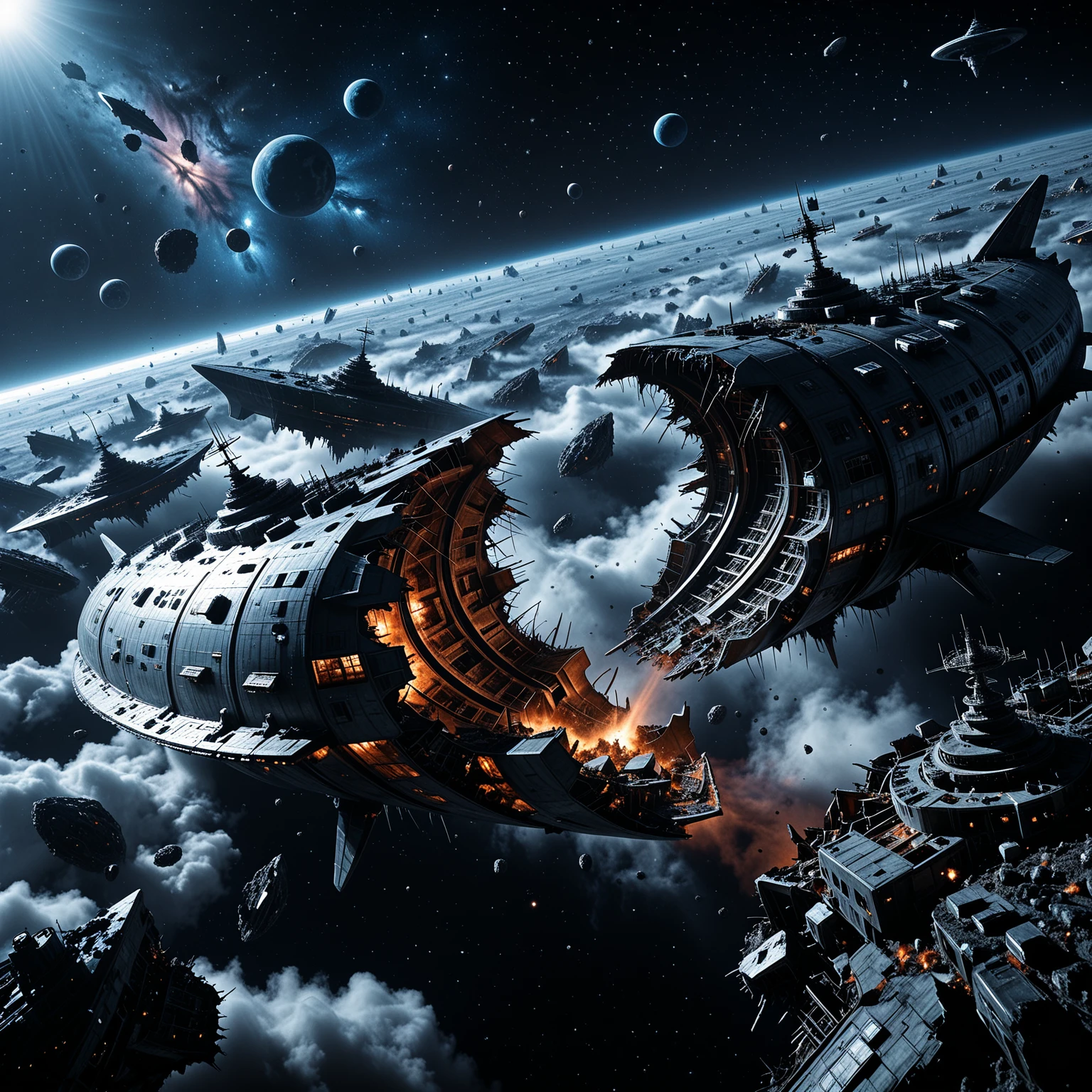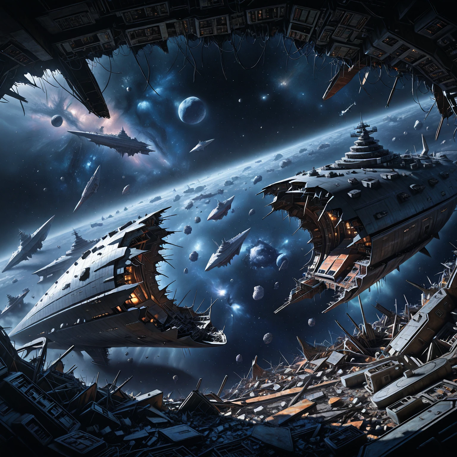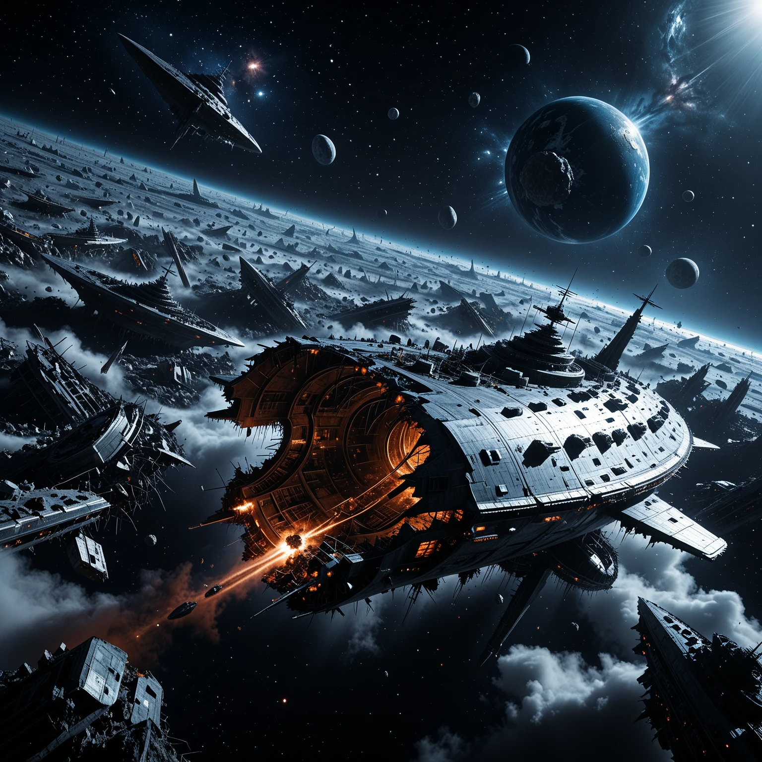 starship_graveyard, deep space, spacecraft, science fiction, planet, debris, ruins, star