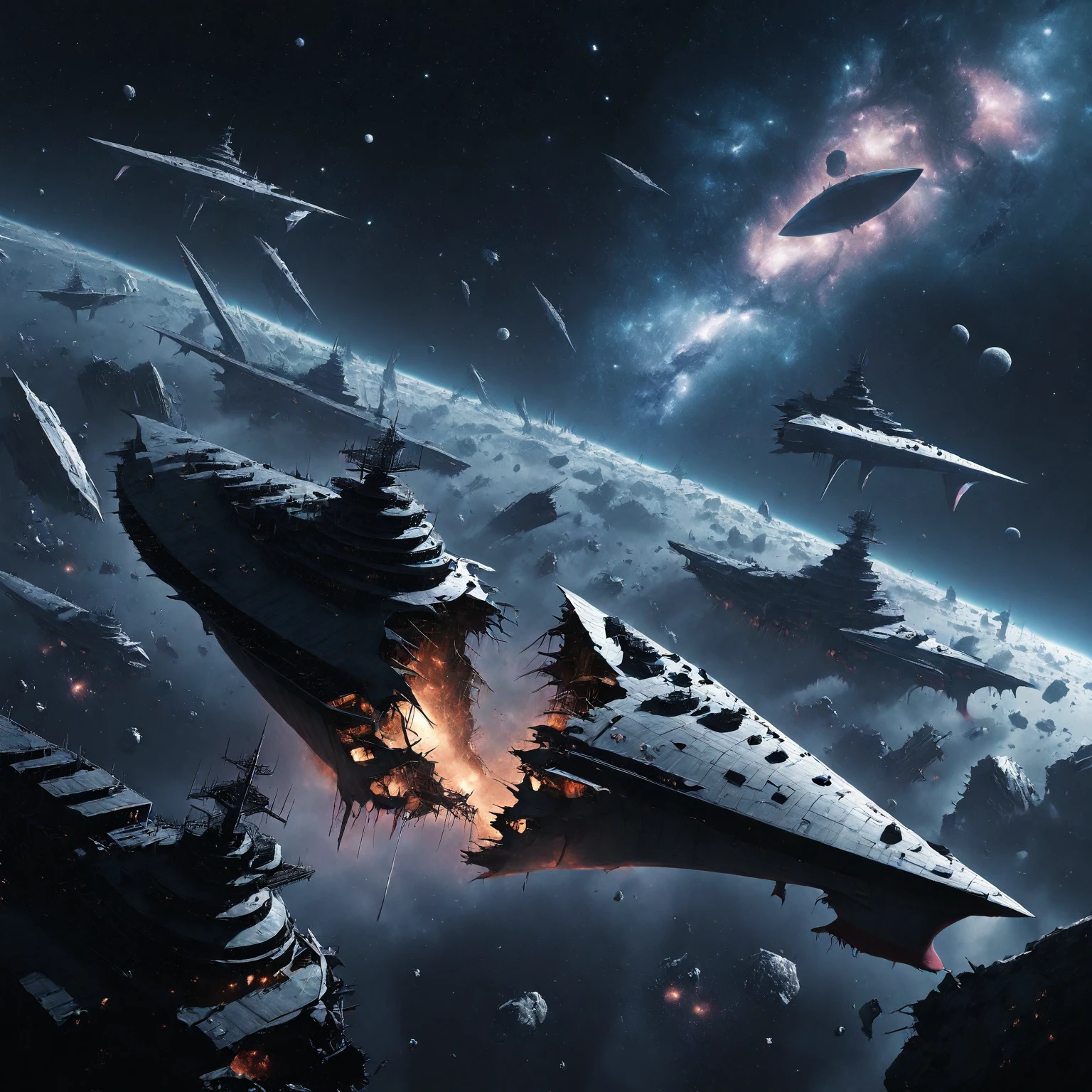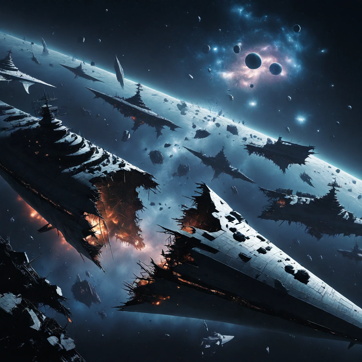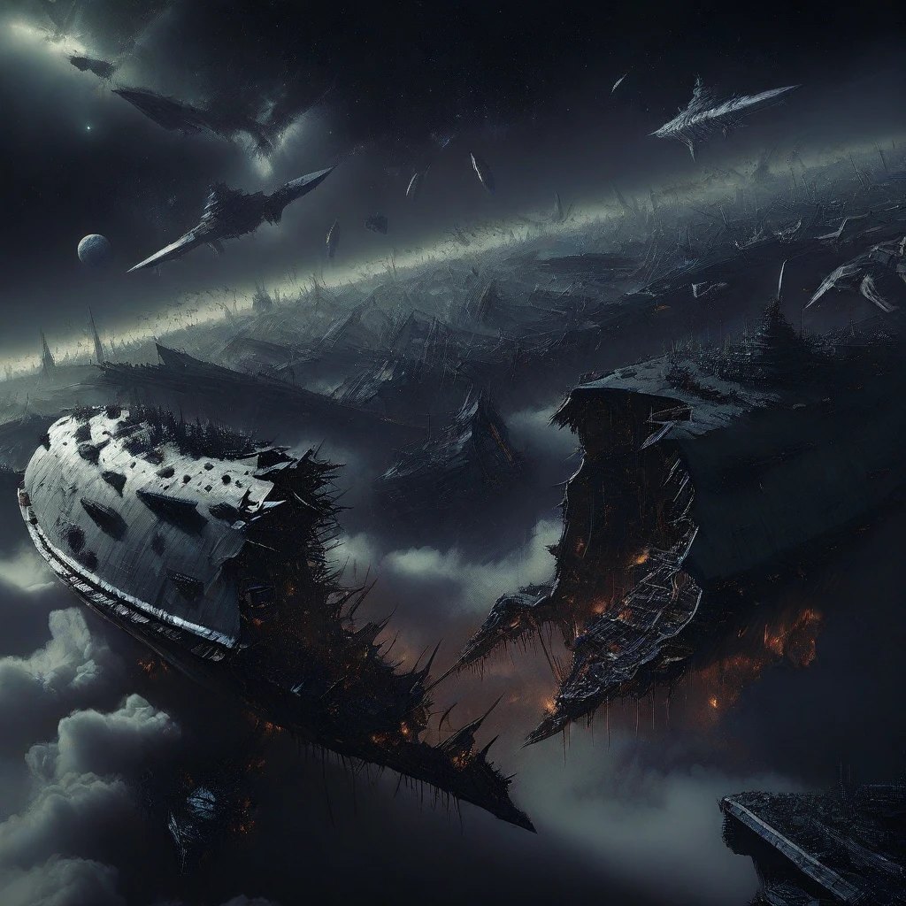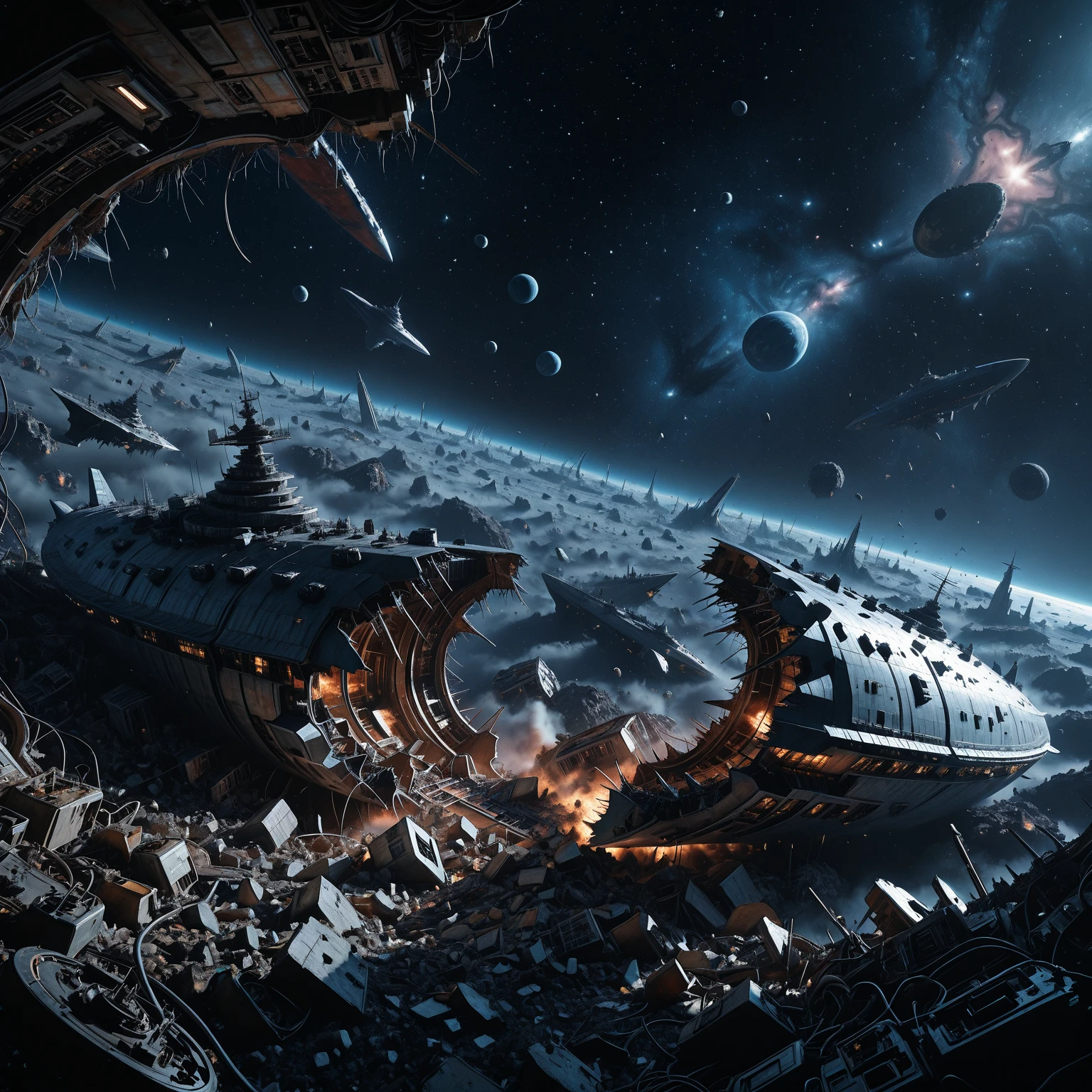 starship_graveyard, deep space, spacecraft, science fiction, planet, debris, ruins, star
