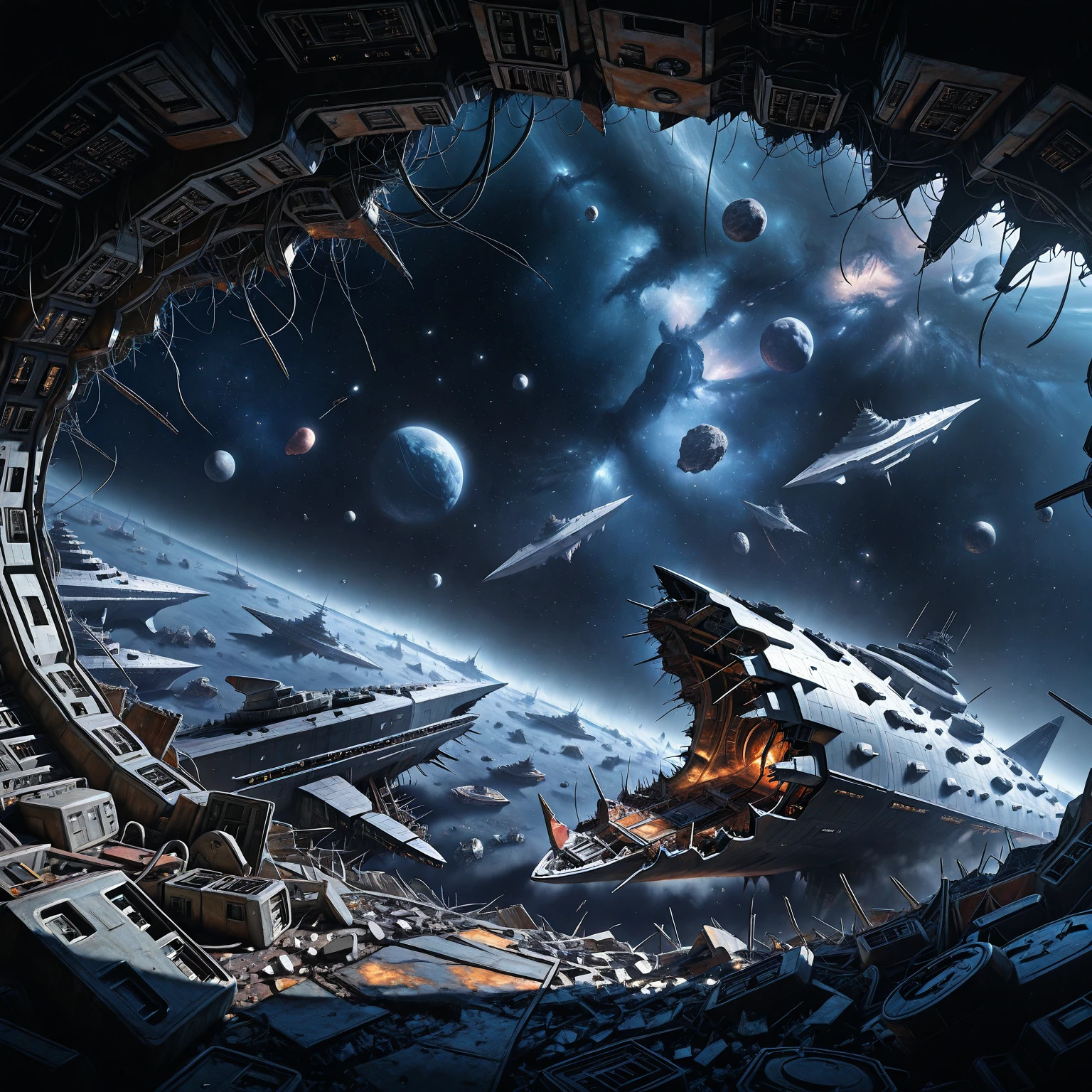 defeated_starship_interior, cable, deep space, spacecraft, science fiction, planet, debris, ruins, star