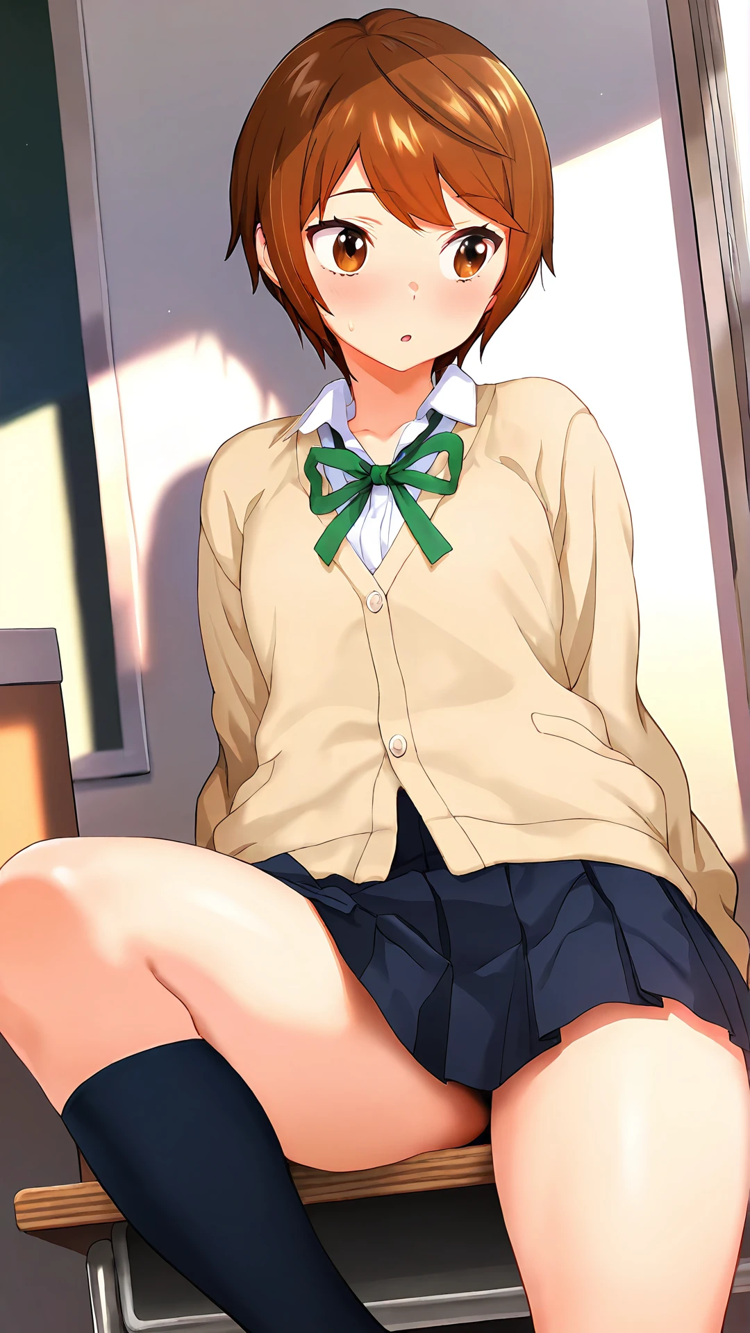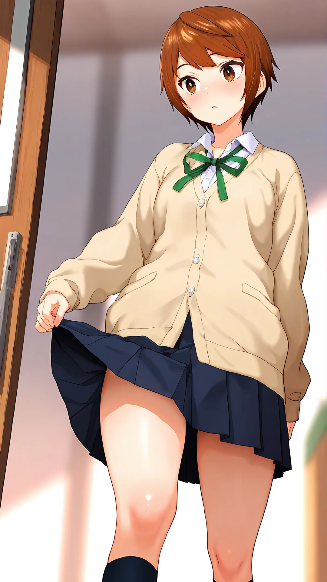 Onosato Mina,1girl,solo,brown hair,skirt,short hair,brown eyes,school uniform,socks,cardigan,pleated skirt,kneehighs,ribbon,shirt,long sleeves,