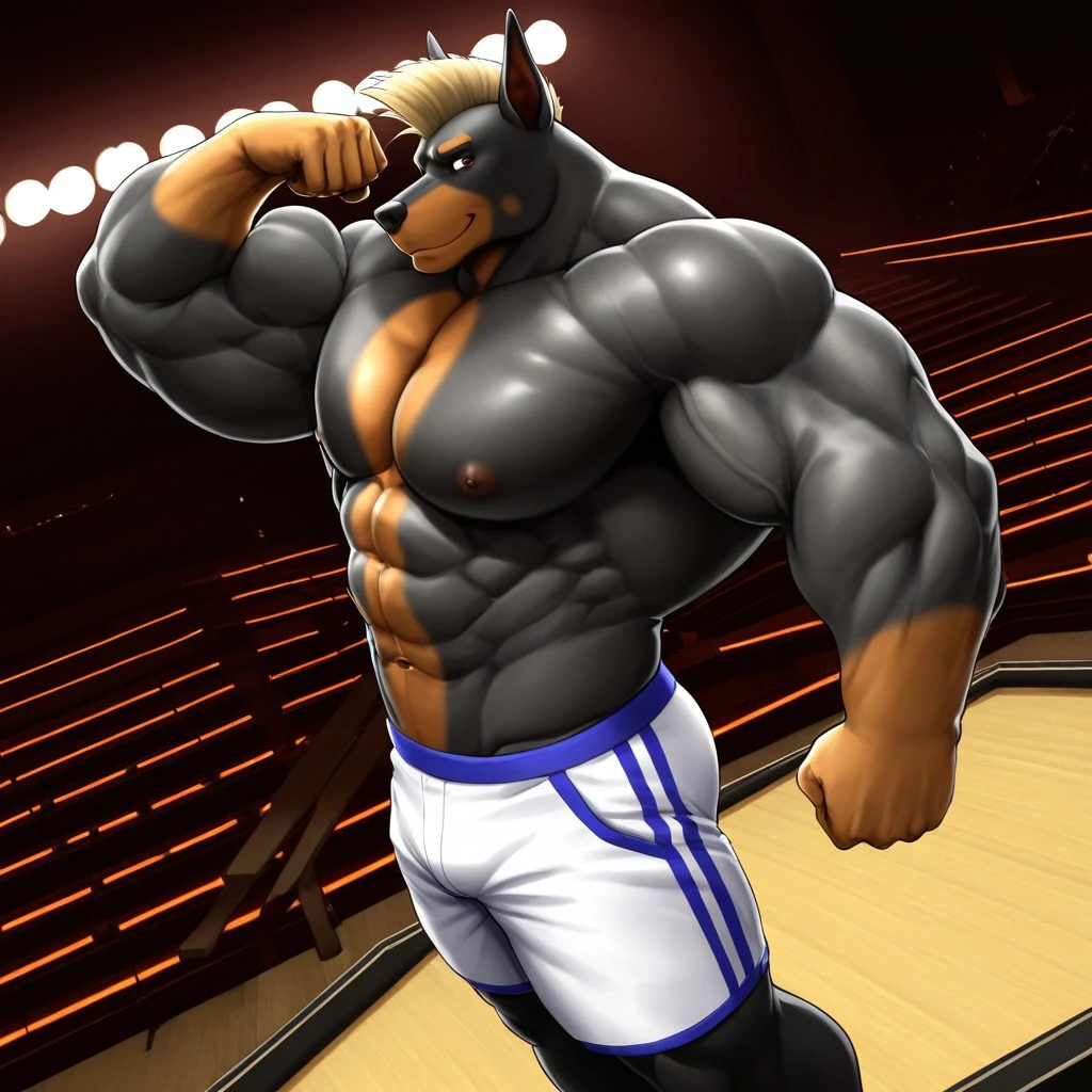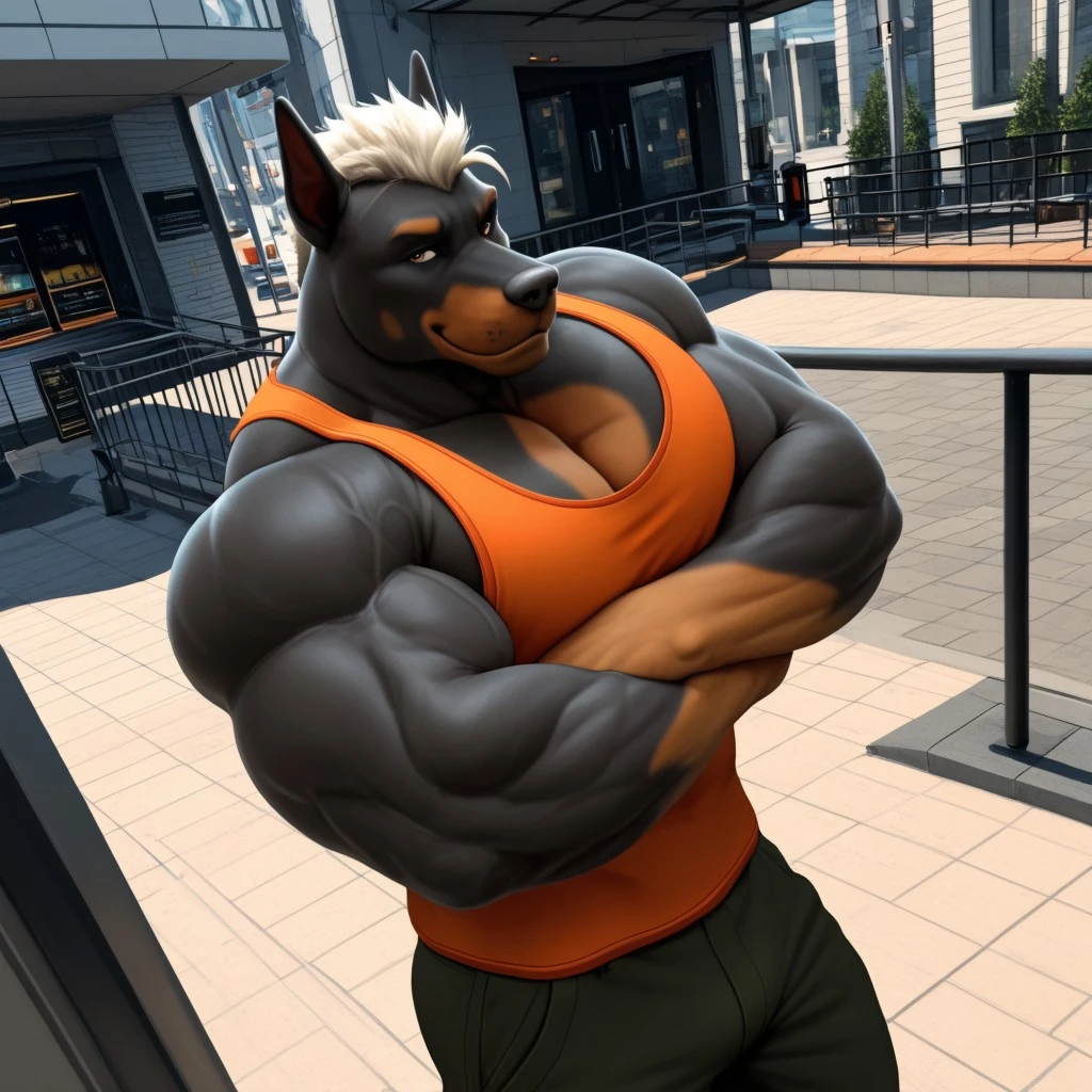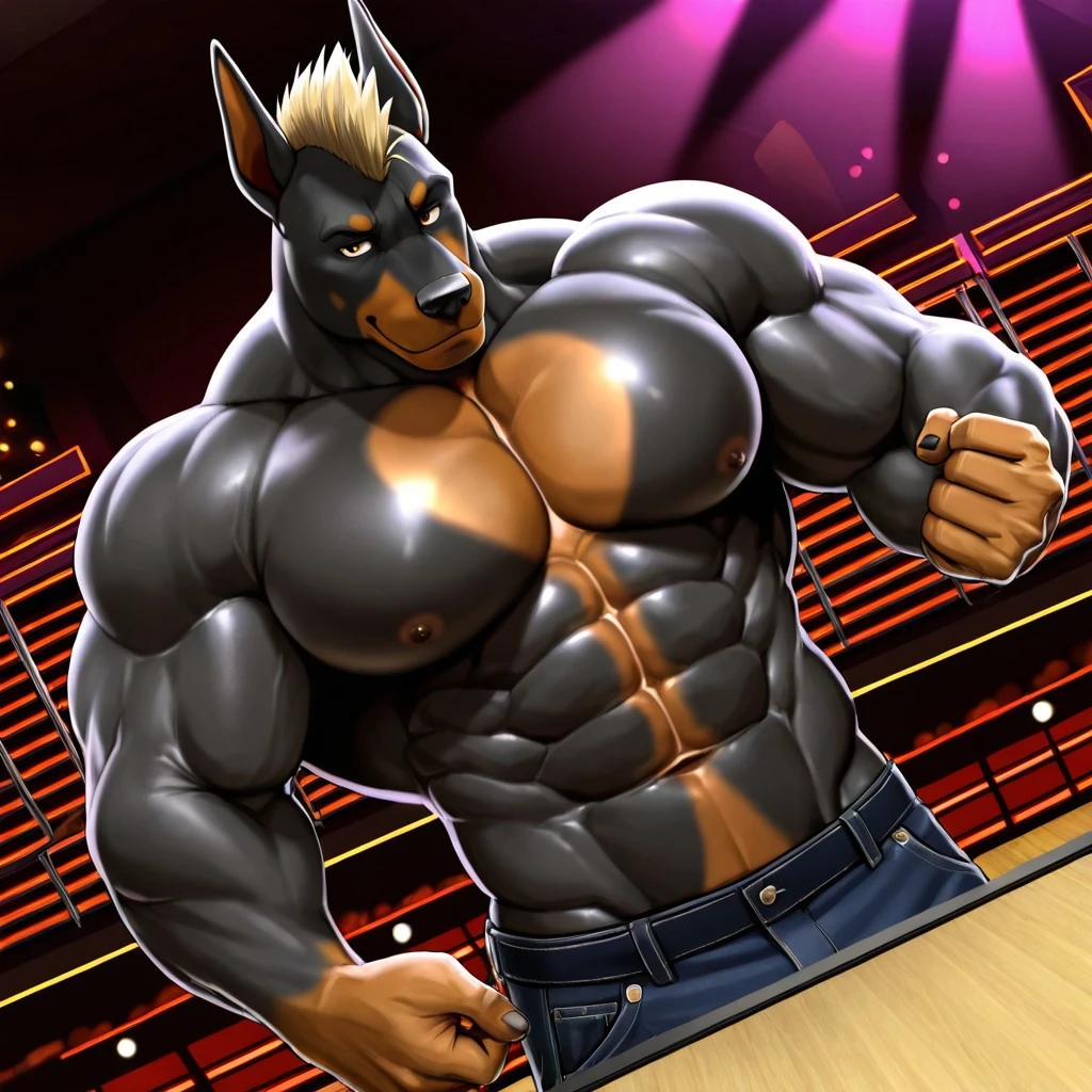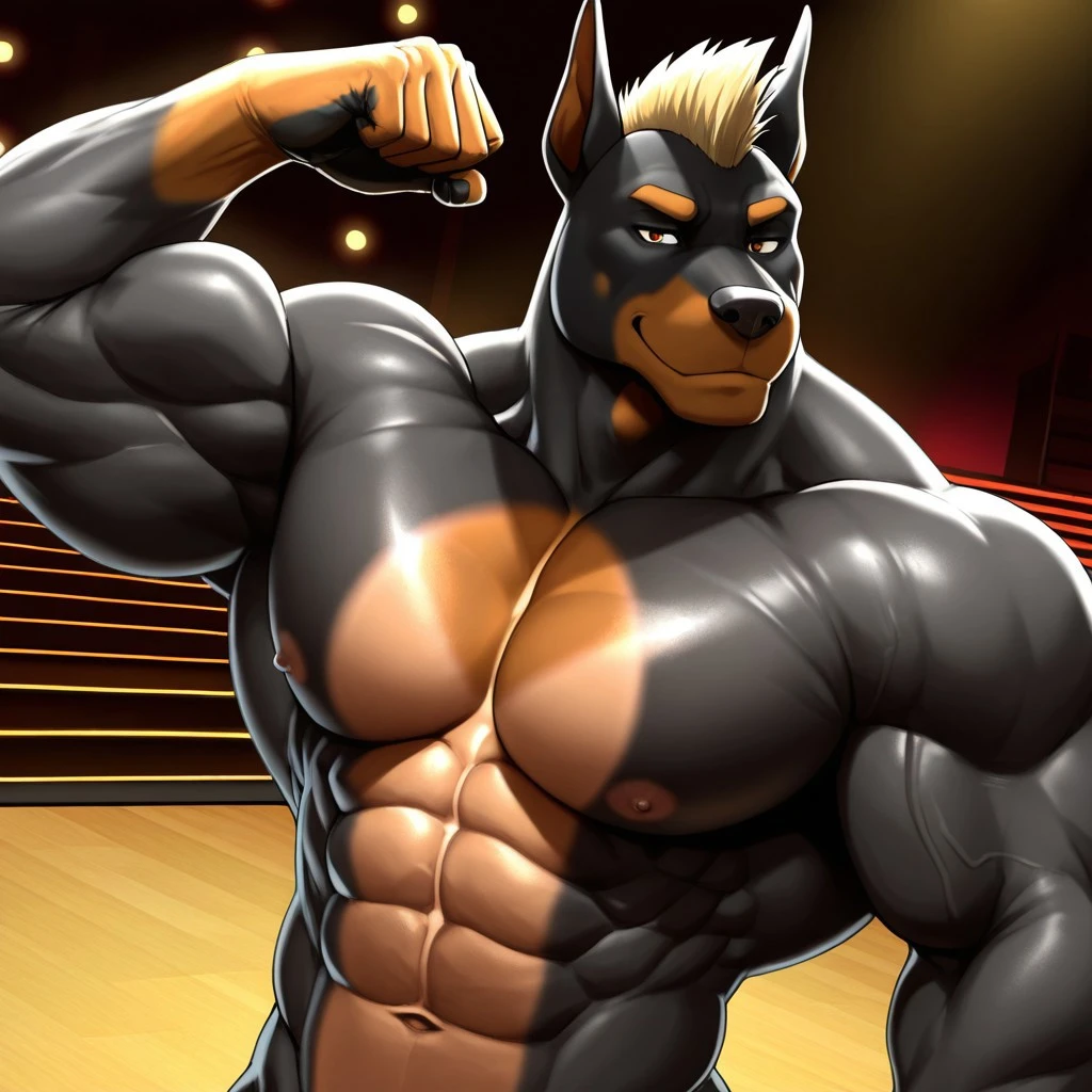 Key words: Gunther, anthro, furry, dobermann, big body, blonde white crew cut mohawk hair, six pack abs, tan cheek mark, muscular chest.