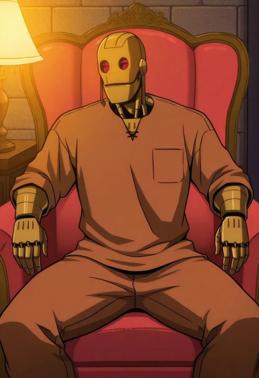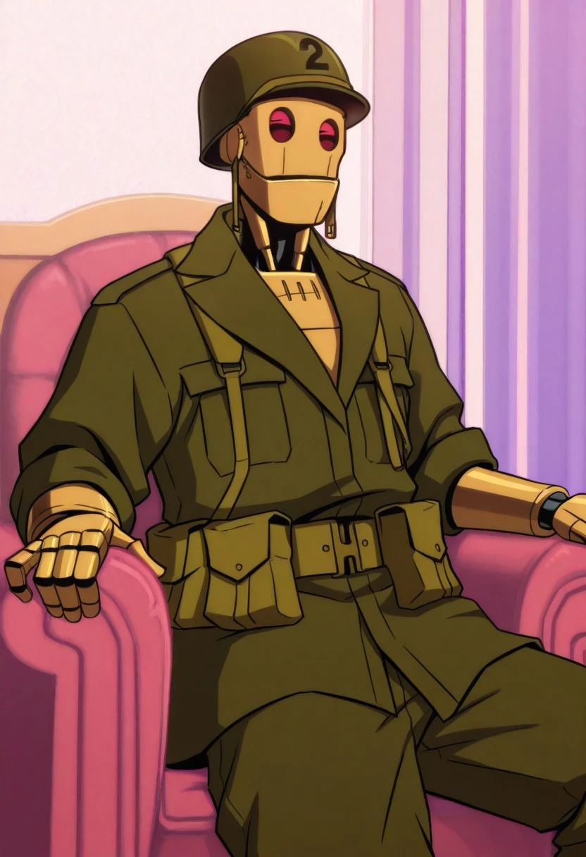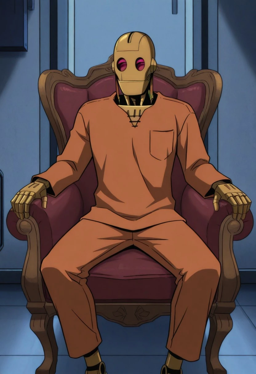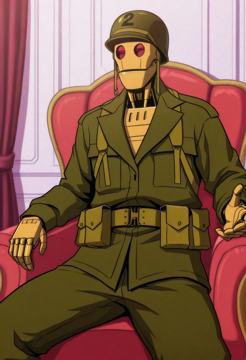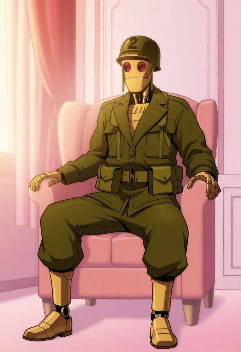 GI Robot, 1boy, male focus, solo, mature male, humanoid robot, robot, dark medium orange skin,
