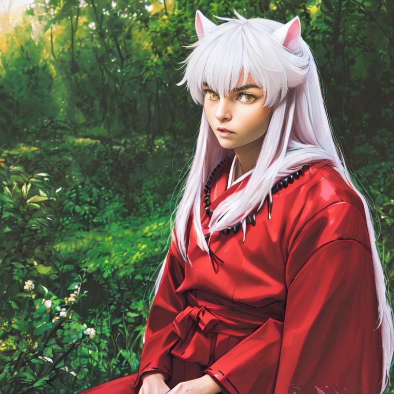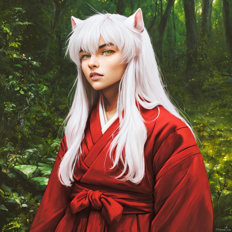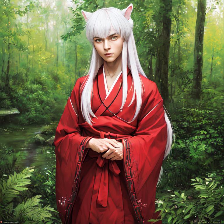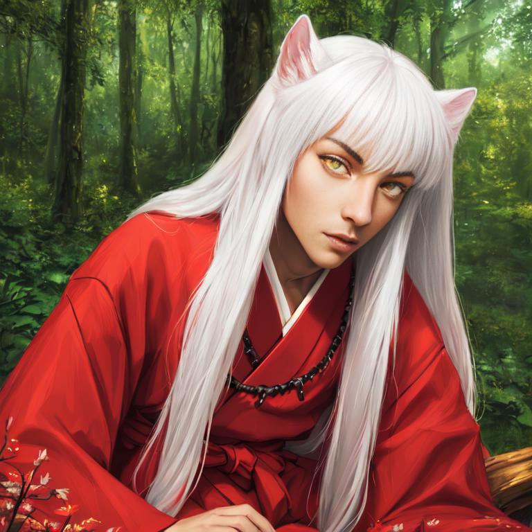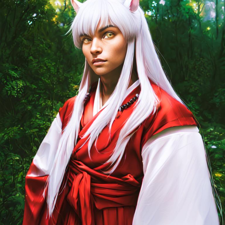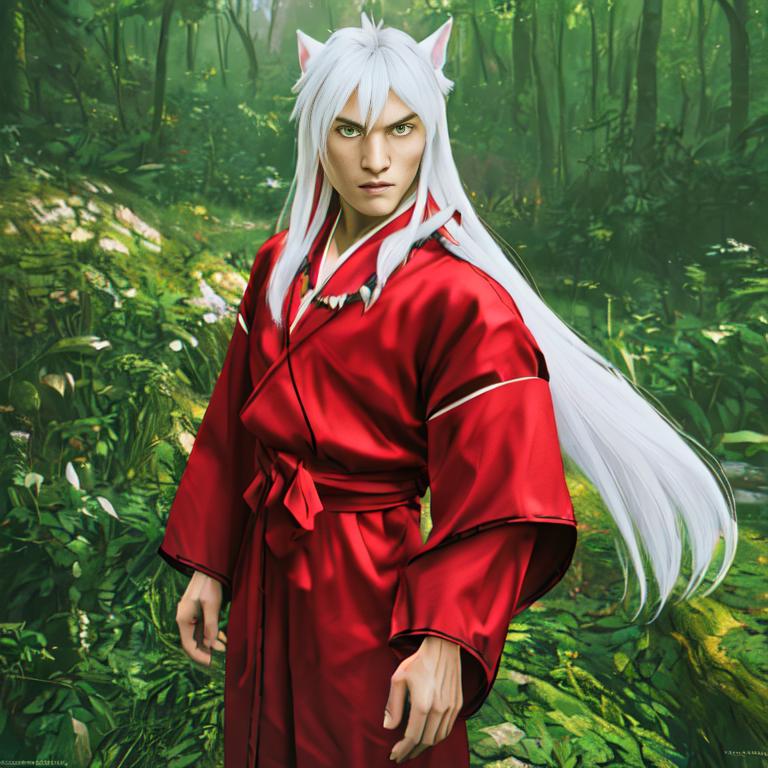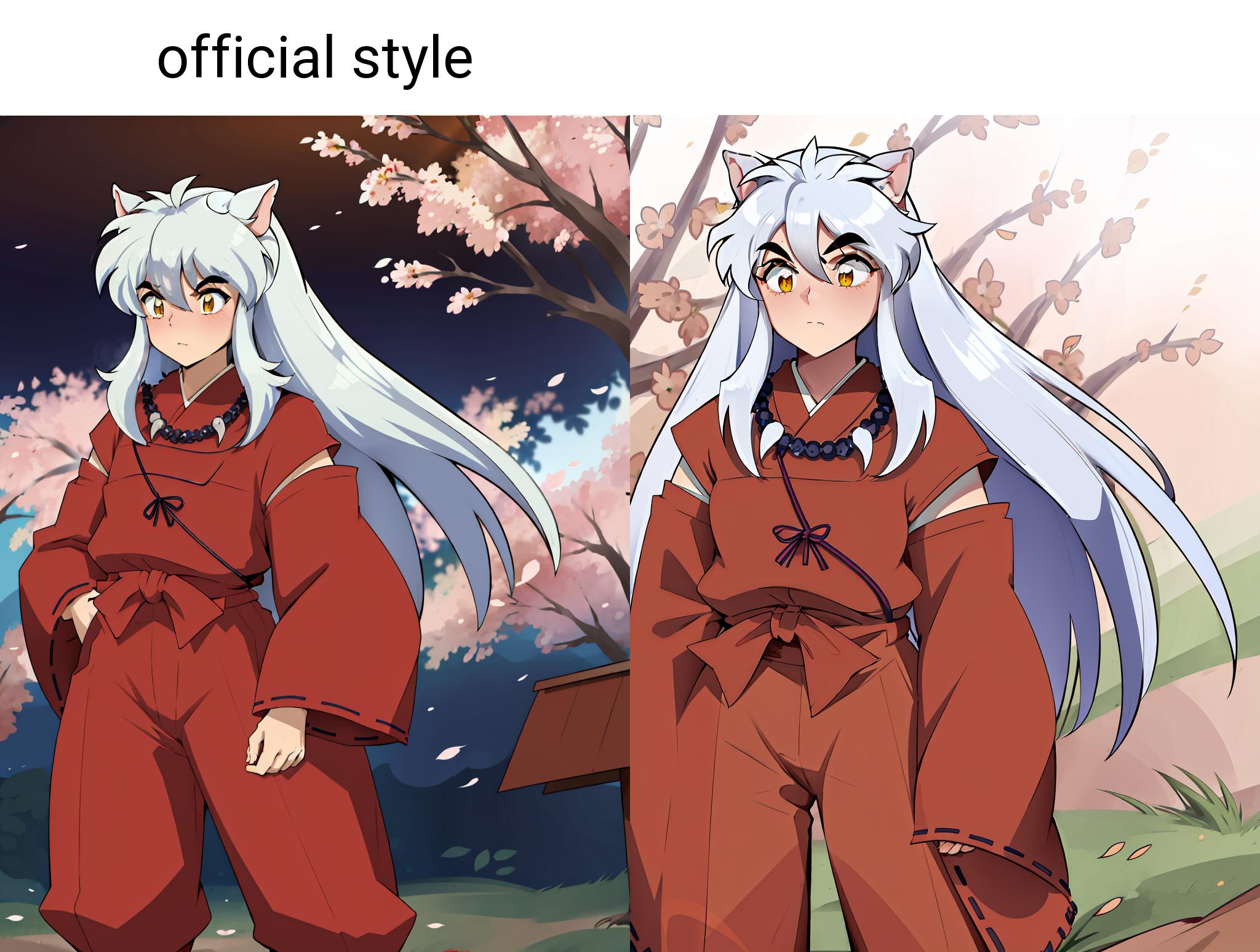 If you would like a more closer to anime look, use official style in your prompts. If he loses any of his characteristics you can help him restore them with: long hair ,white hair,dog ears,yellow eyes,red kimono,etc. I recommend to use him at 0.6~0.8, but 1 is fine although the anime style will take over.