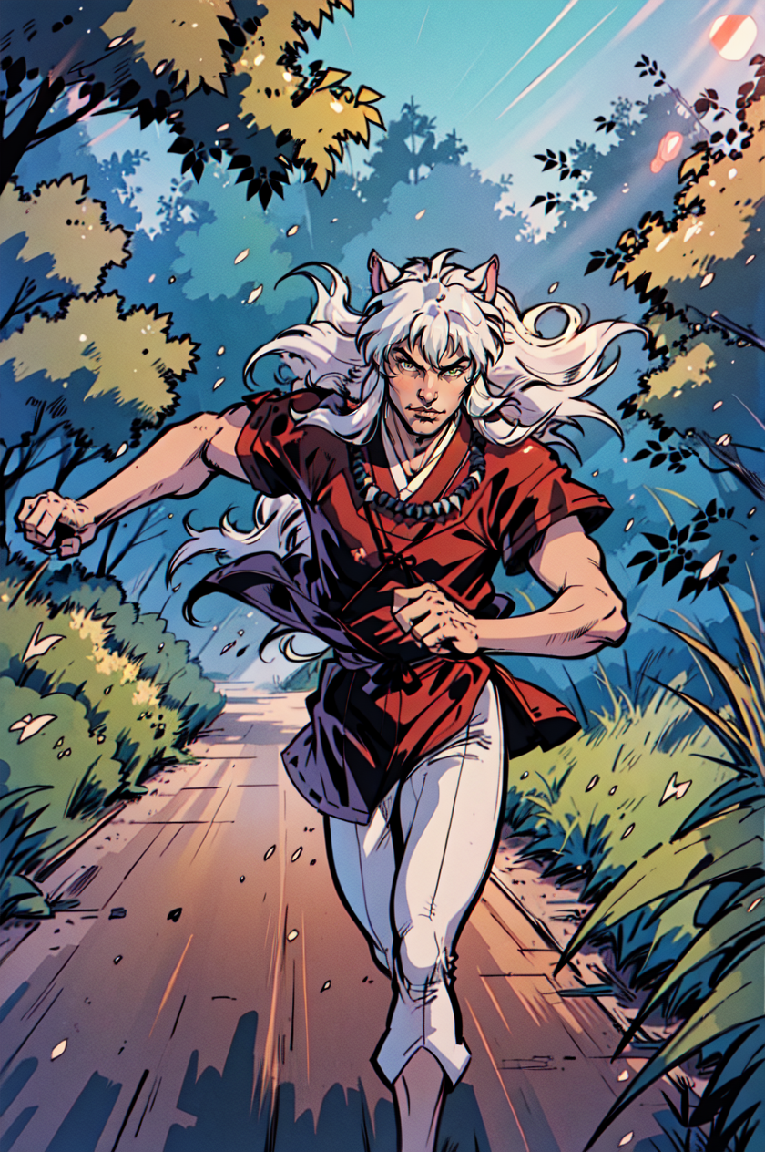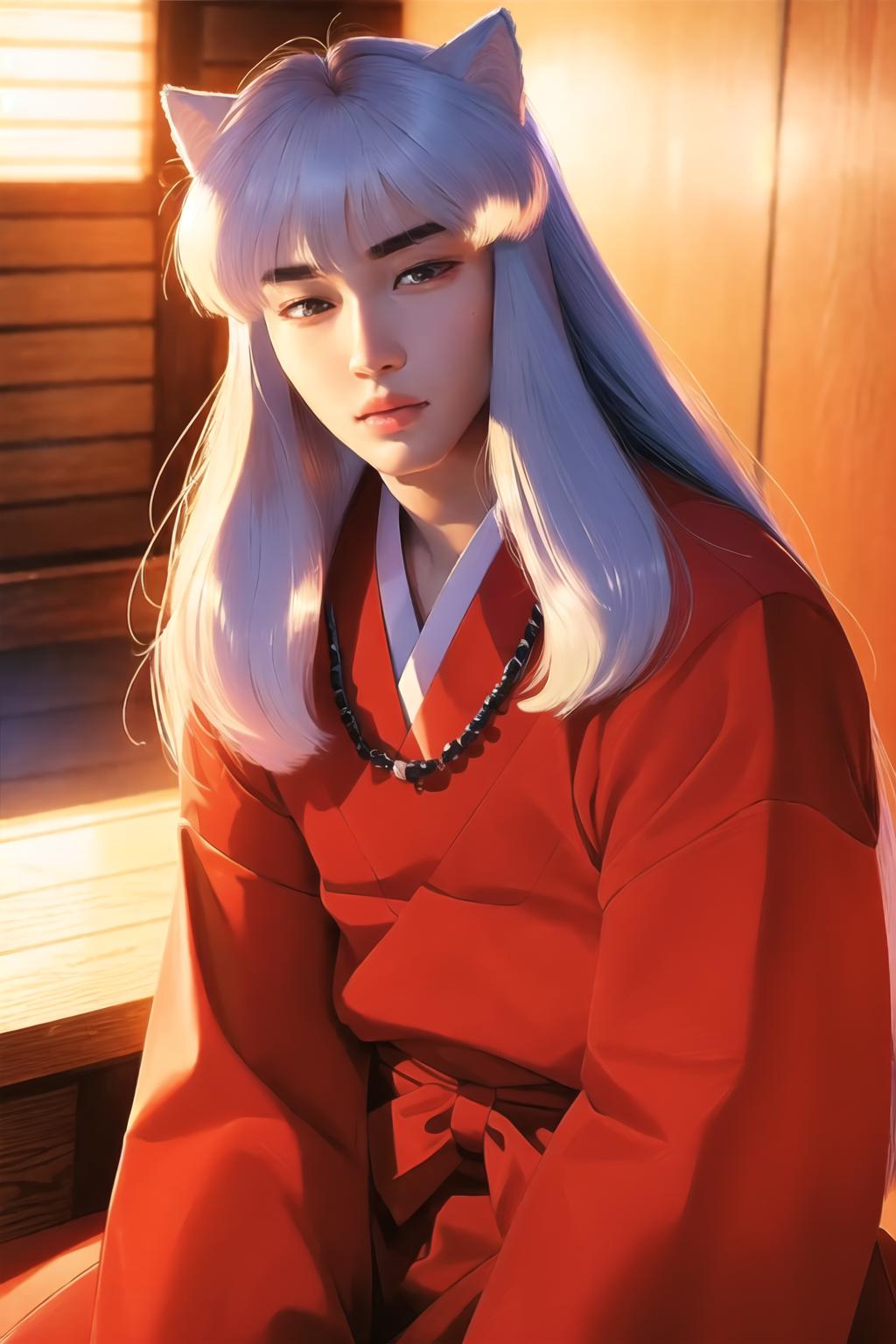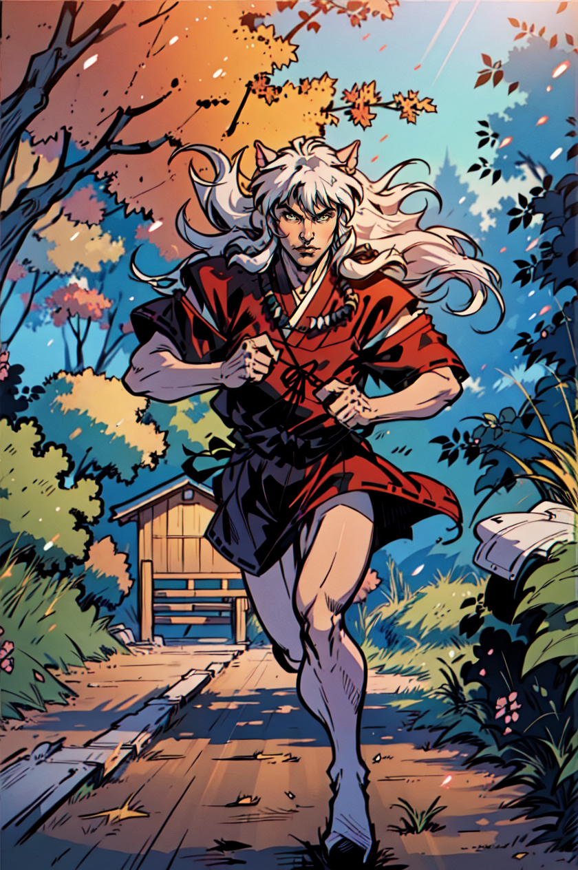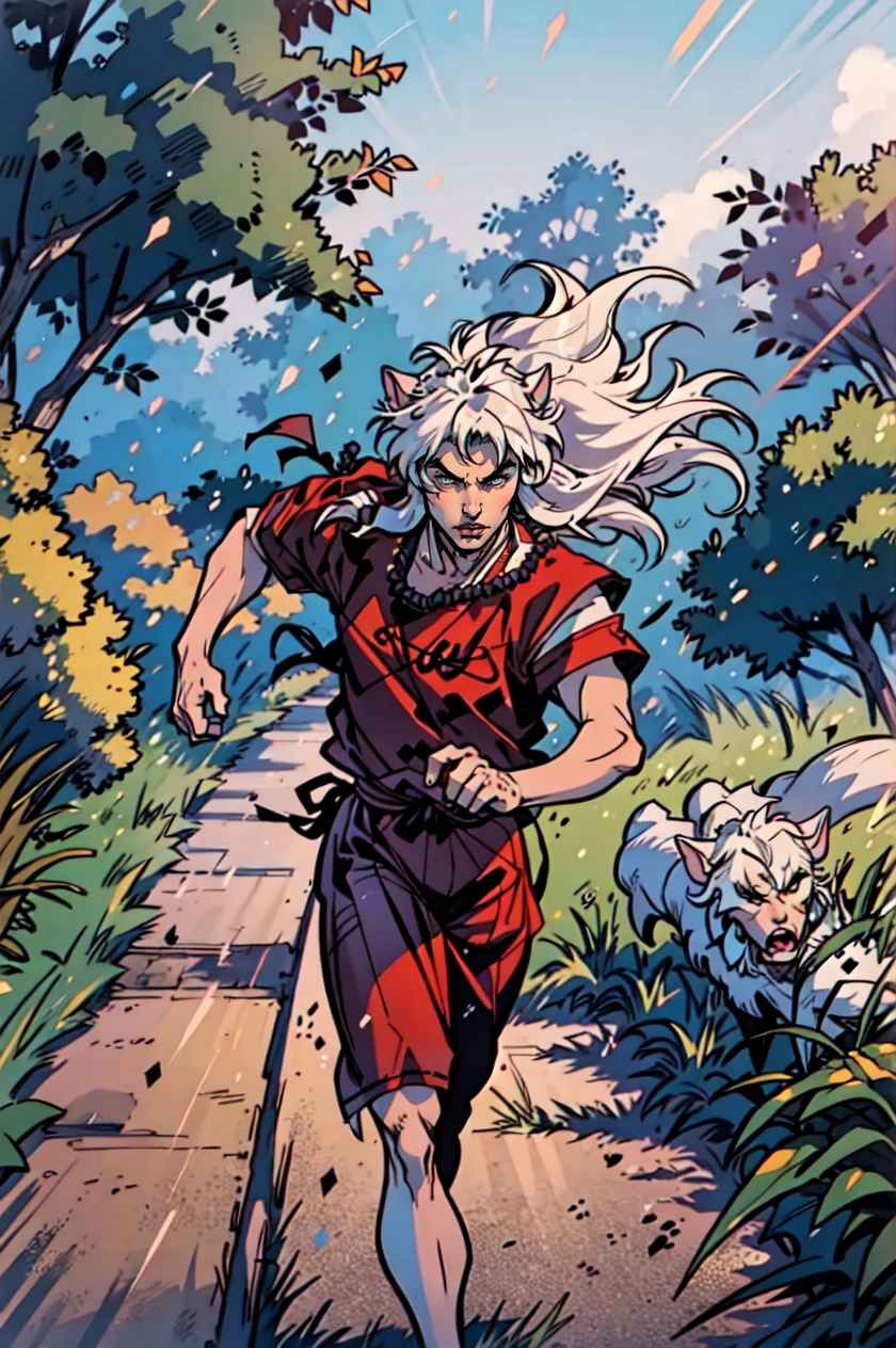 If you would like a more closer to anime look, use official style in your prompts. If he loses any of his characteristics you can help him restore them with: long hair ,white hair,dog ears,yellow eyes,red kimono,etc. I recommend to use him at 0.6~0.8, but 1 is fine although the anime style will take over.