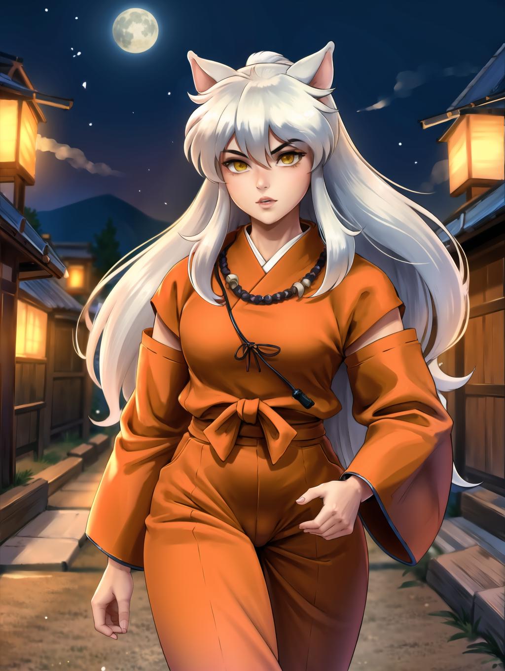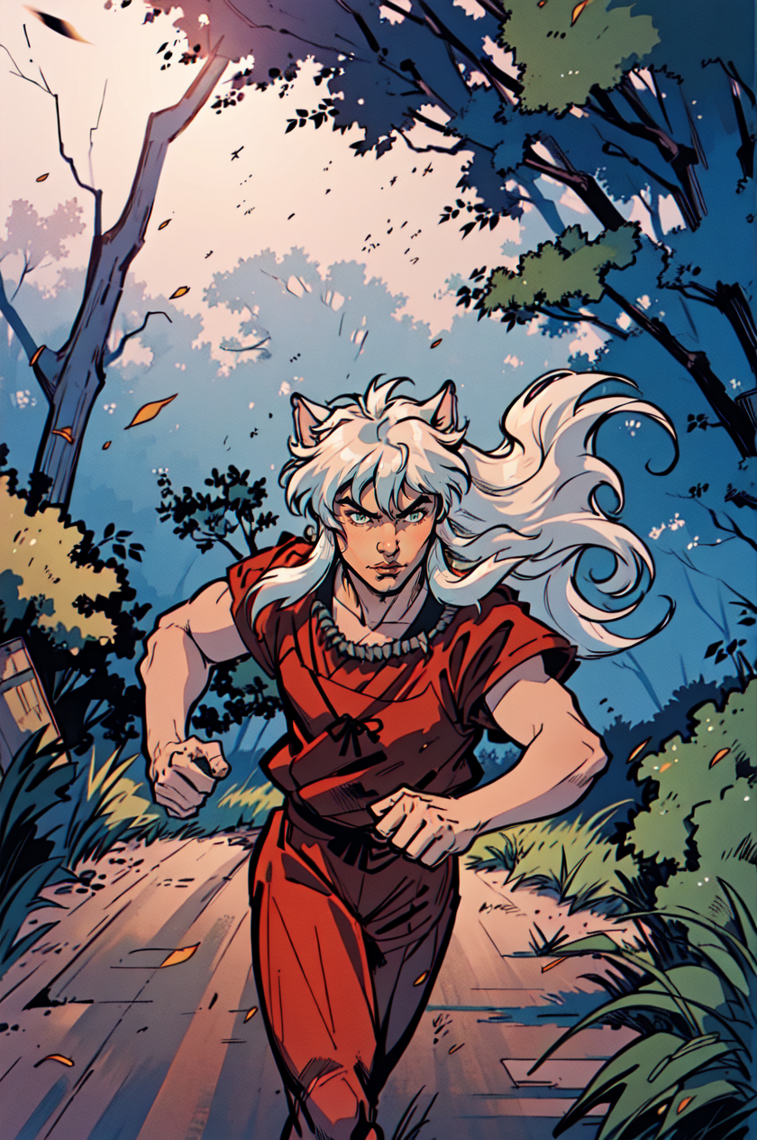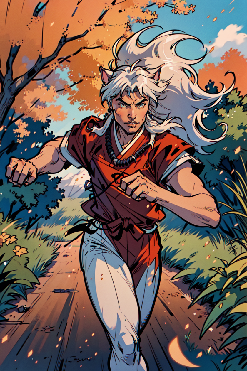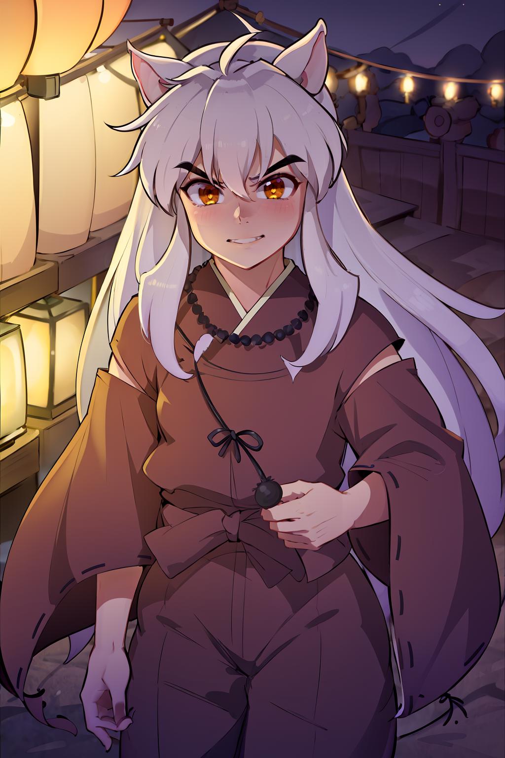 If you would like a more closer to anime look, use official style in your prompts. If he loses any of his characteristics you can help him restore them with: long hair ,white hair,dog ears,yellow eyes,red kimono,etc. I recommend to use him at 0.6~0.8, but 1 is fine although the anime style will take over.