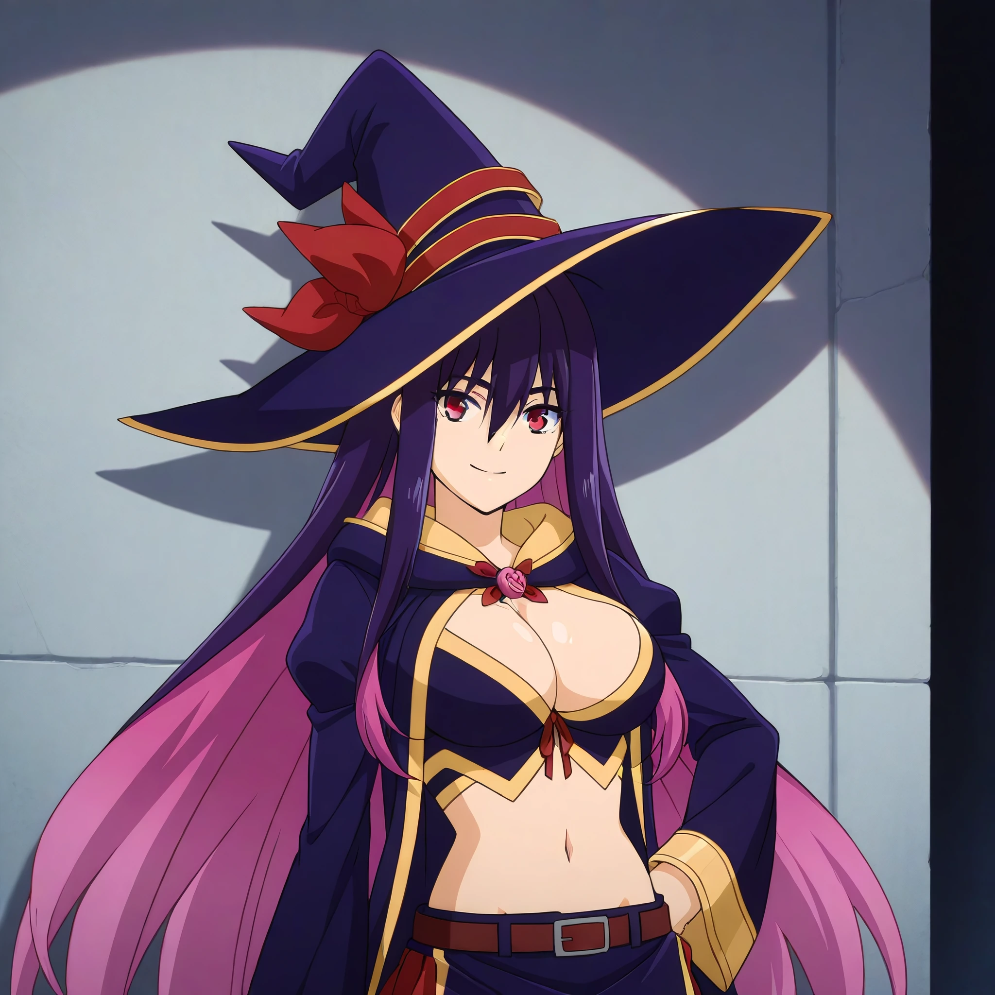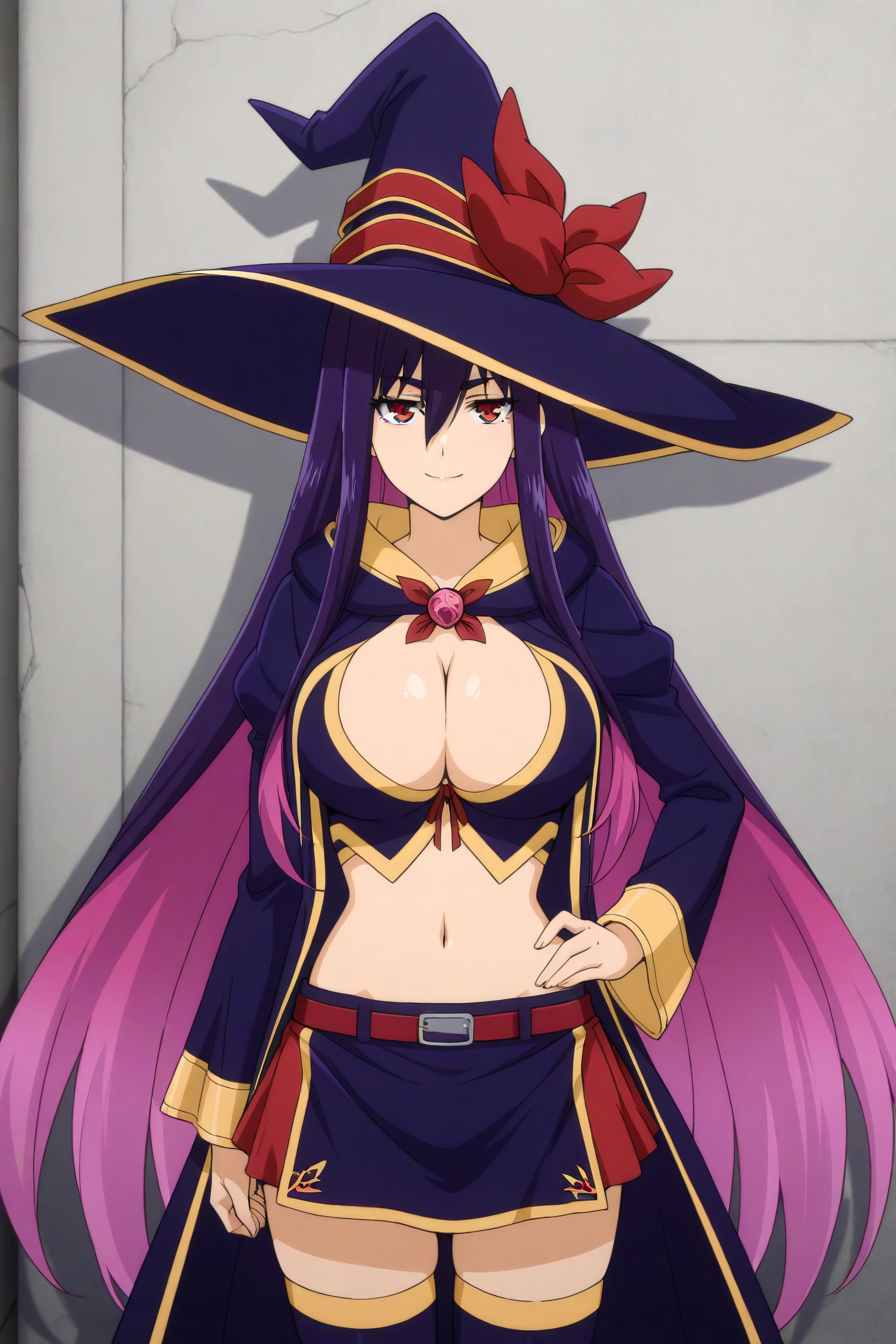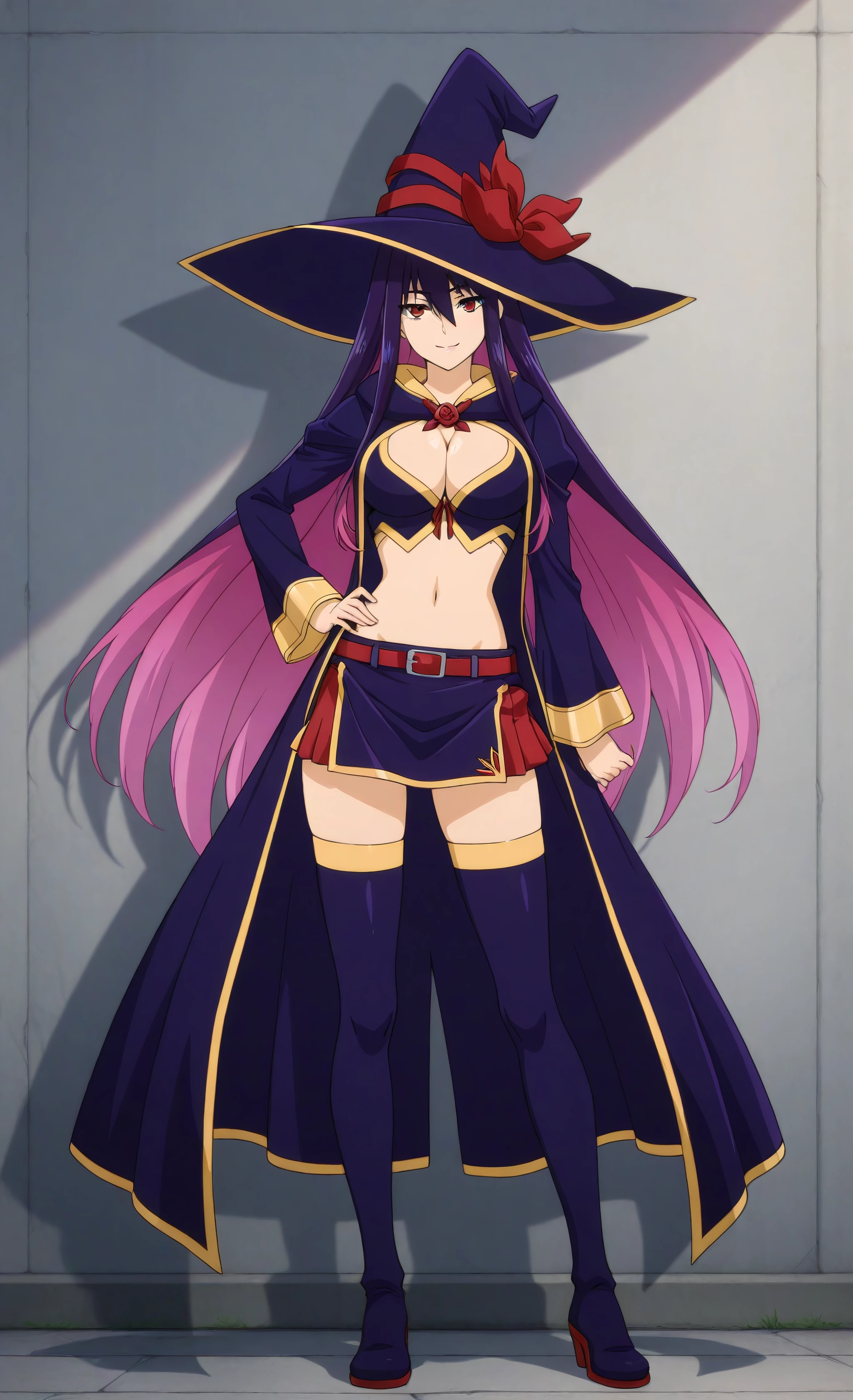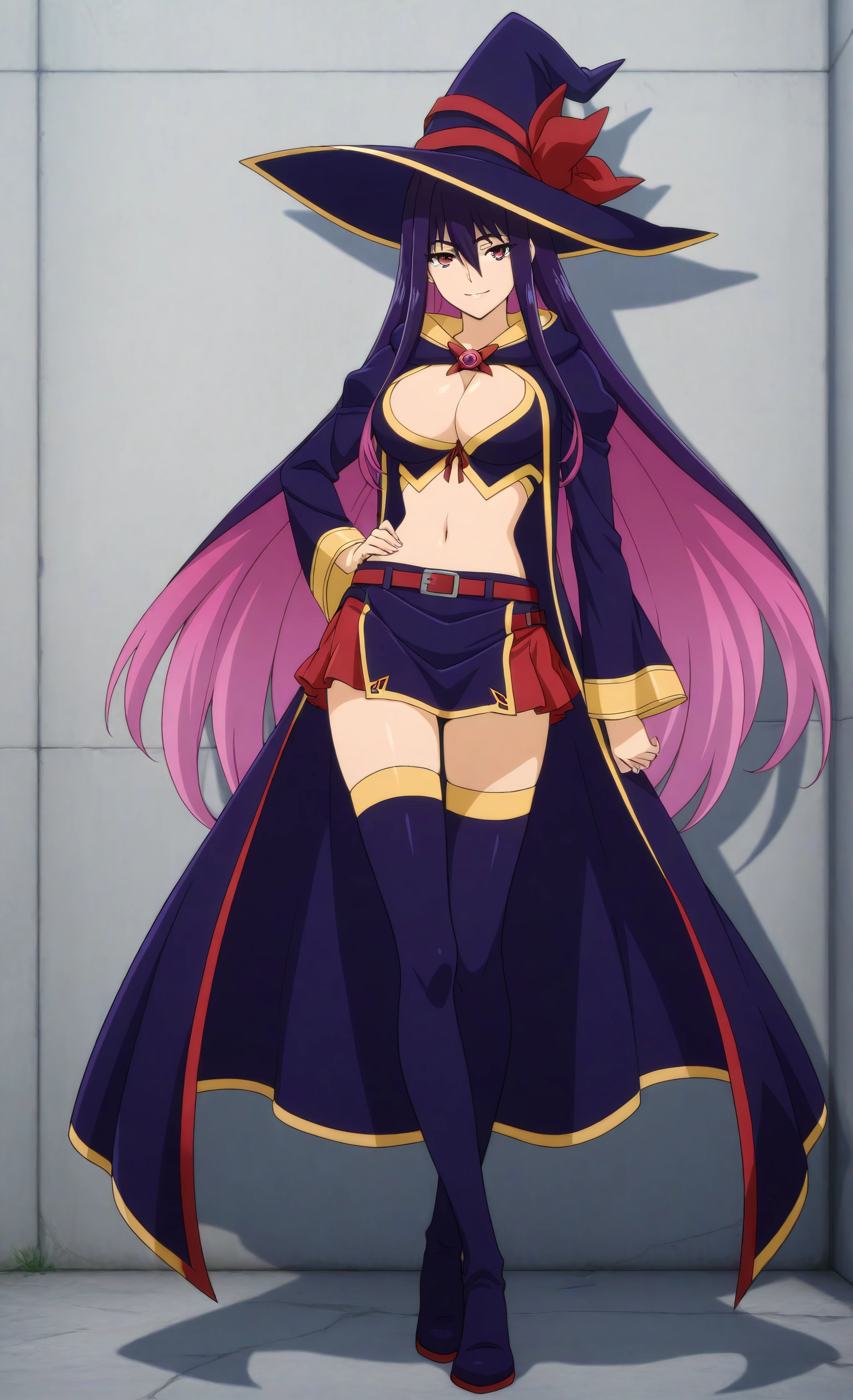 hat, witch hat, thighhighs, navel, skirt, cleavage, thigh boots, midriff, long sleeves, belt
