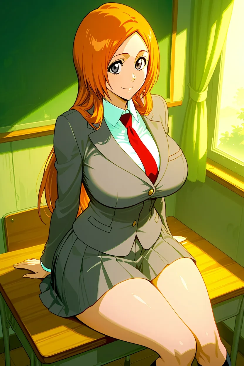 1girl, Orihime Inoue (Bleach), long hair orange hair, grey eyes, sexy body, hot body, massive breasts, sexy waist, curvy, thick thighs wide hips