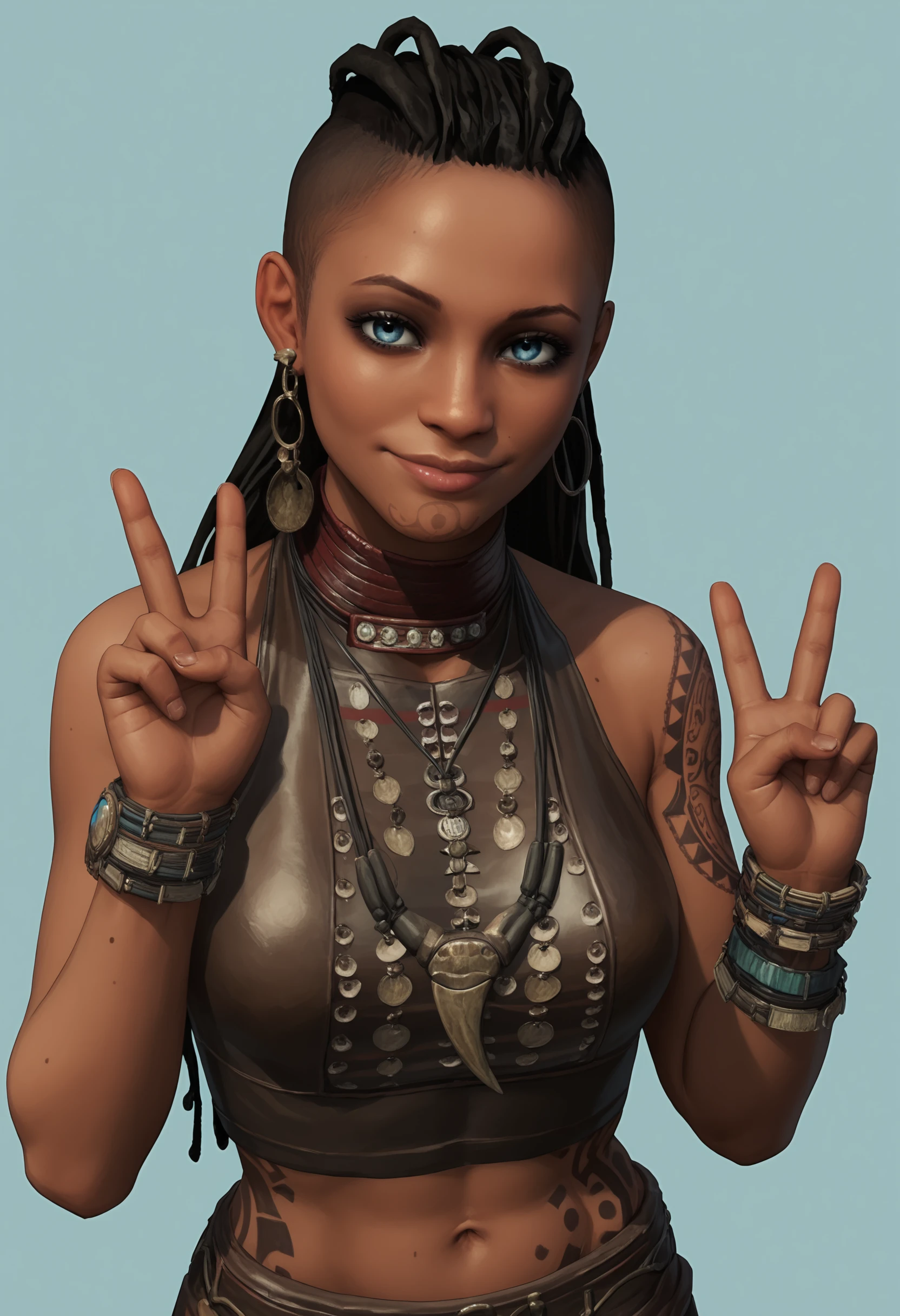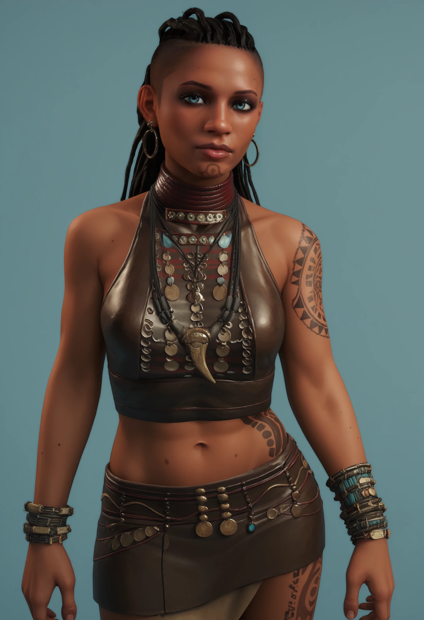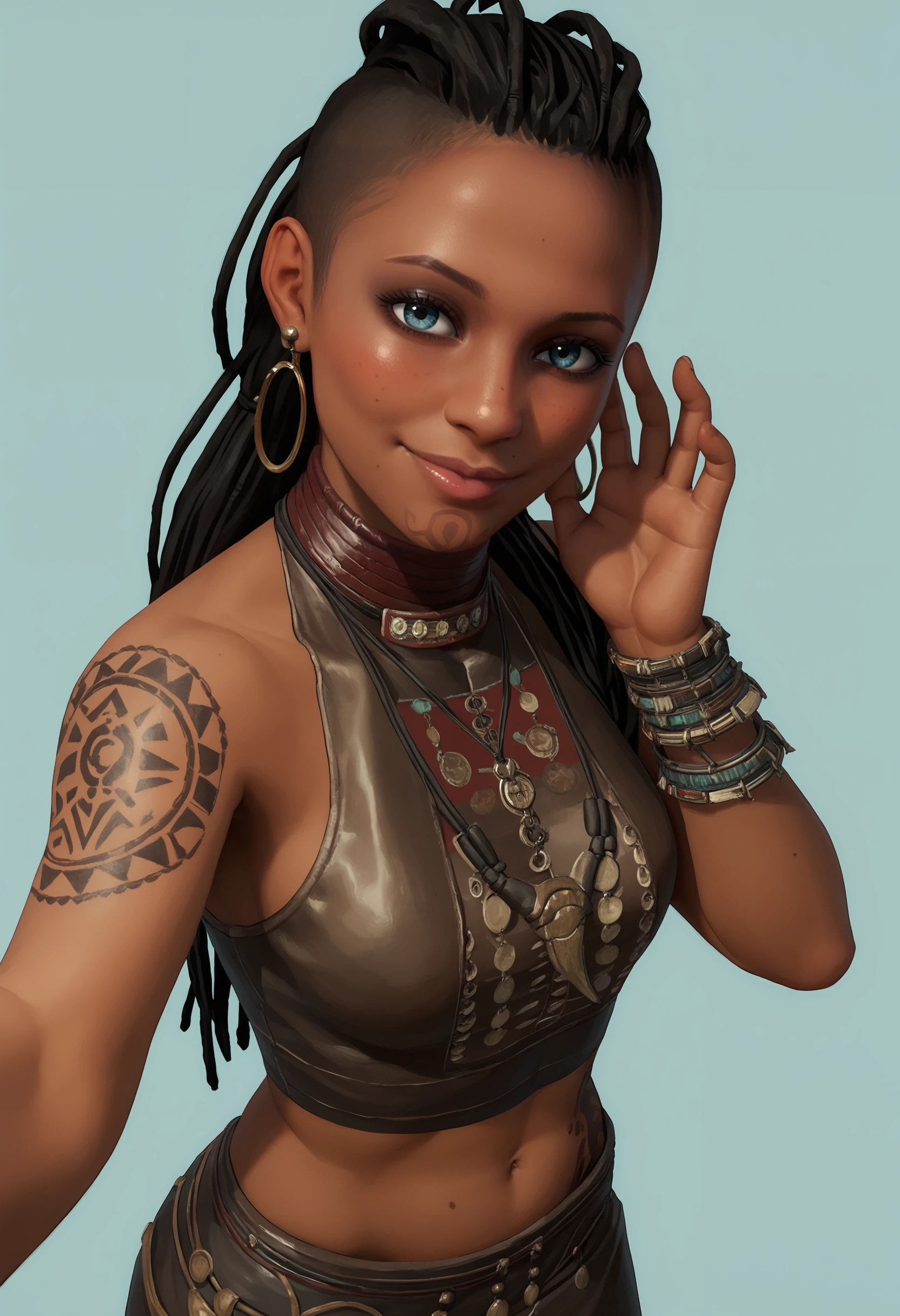 1girl, dark skin, dark-skinned female, black hair, dreadlocks, long hair, breasts, jewelry, earrings, tattoo, bracelet, necklace, midriff, blue eyes, lips, skirt, hoop earrings, tribal
