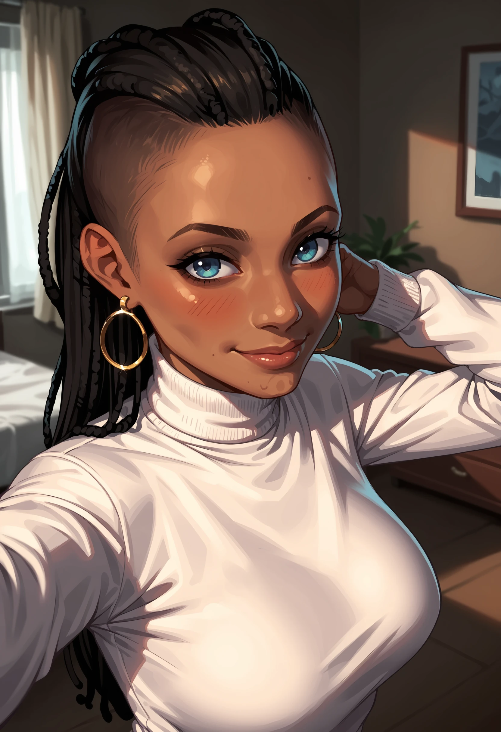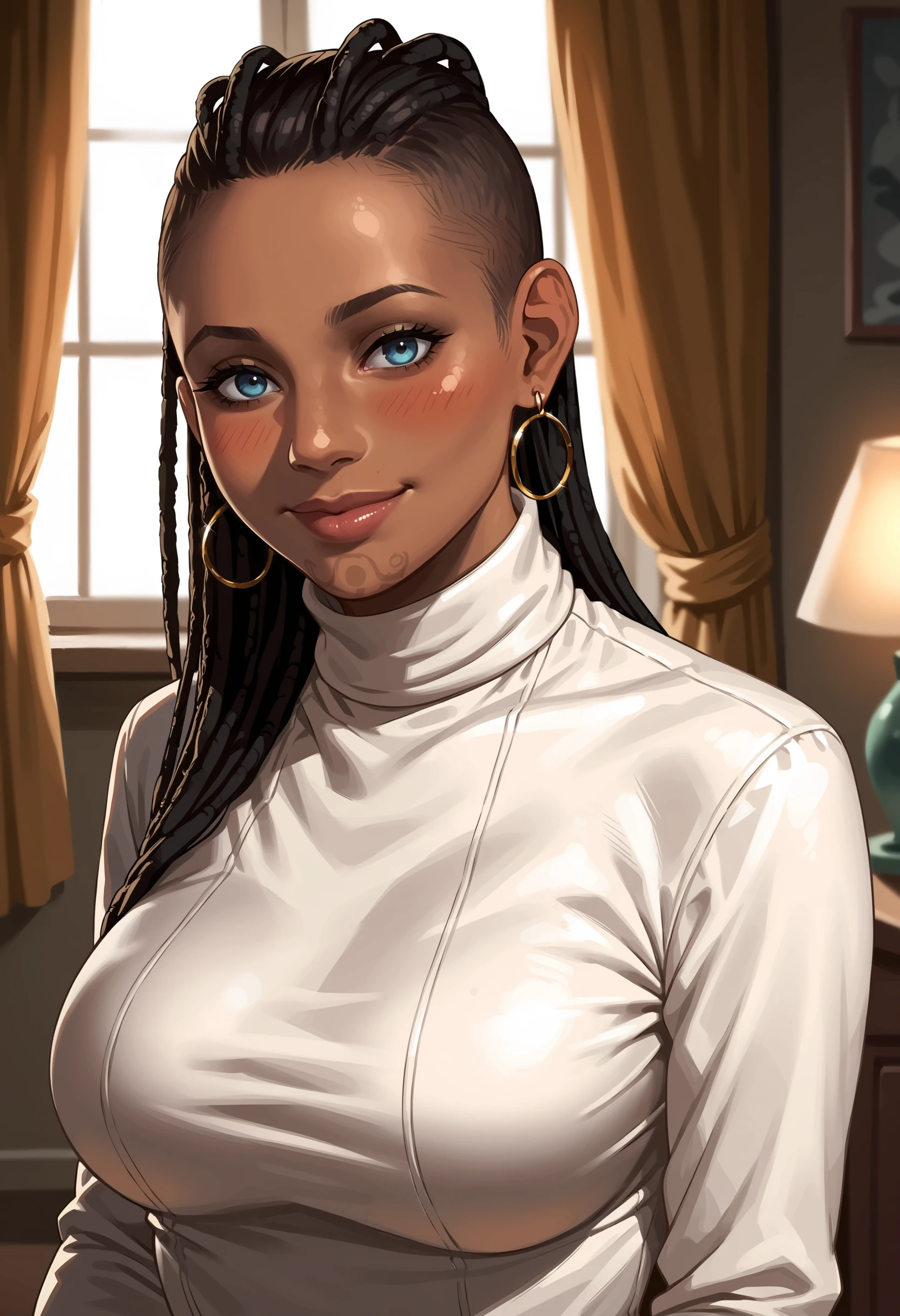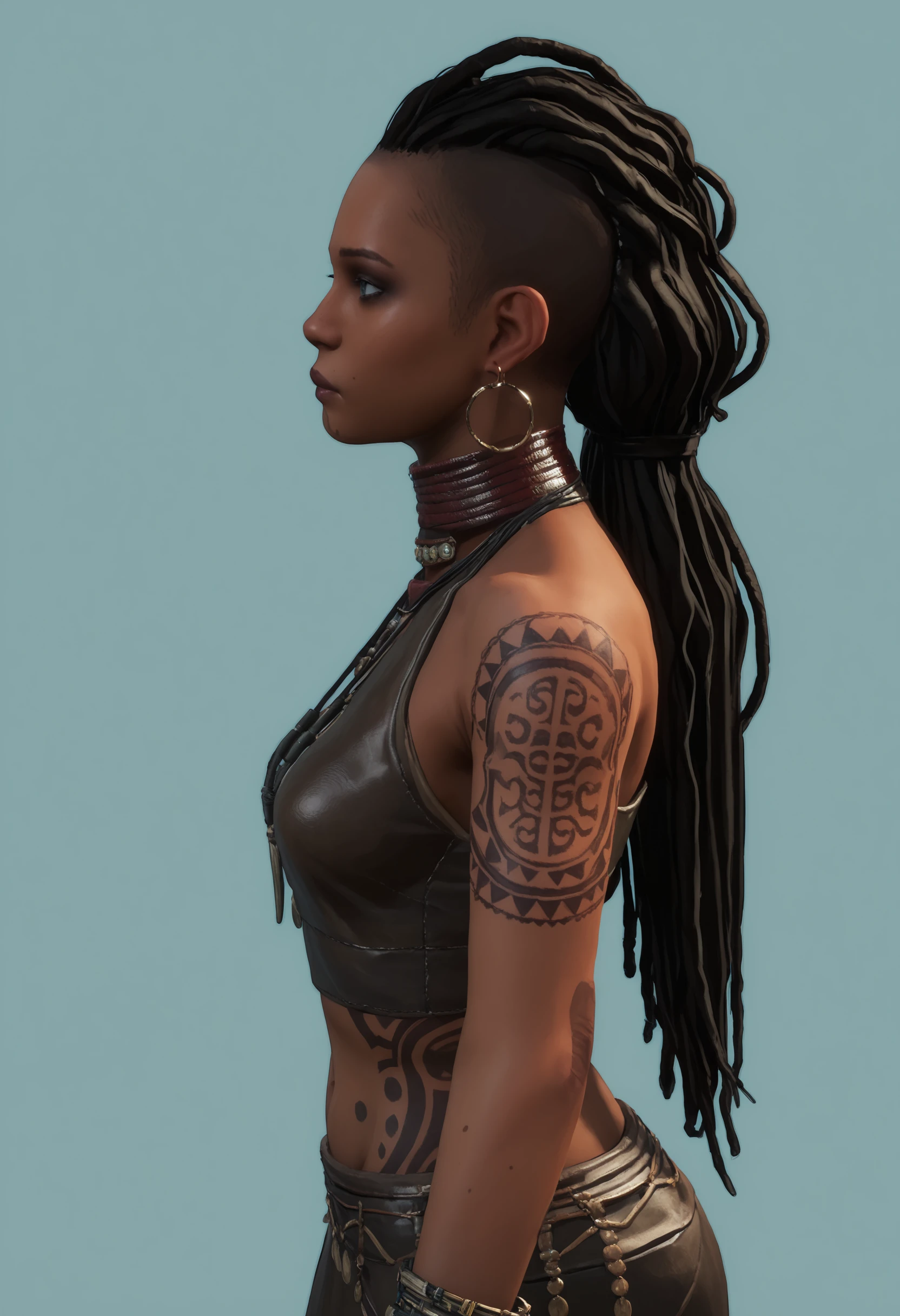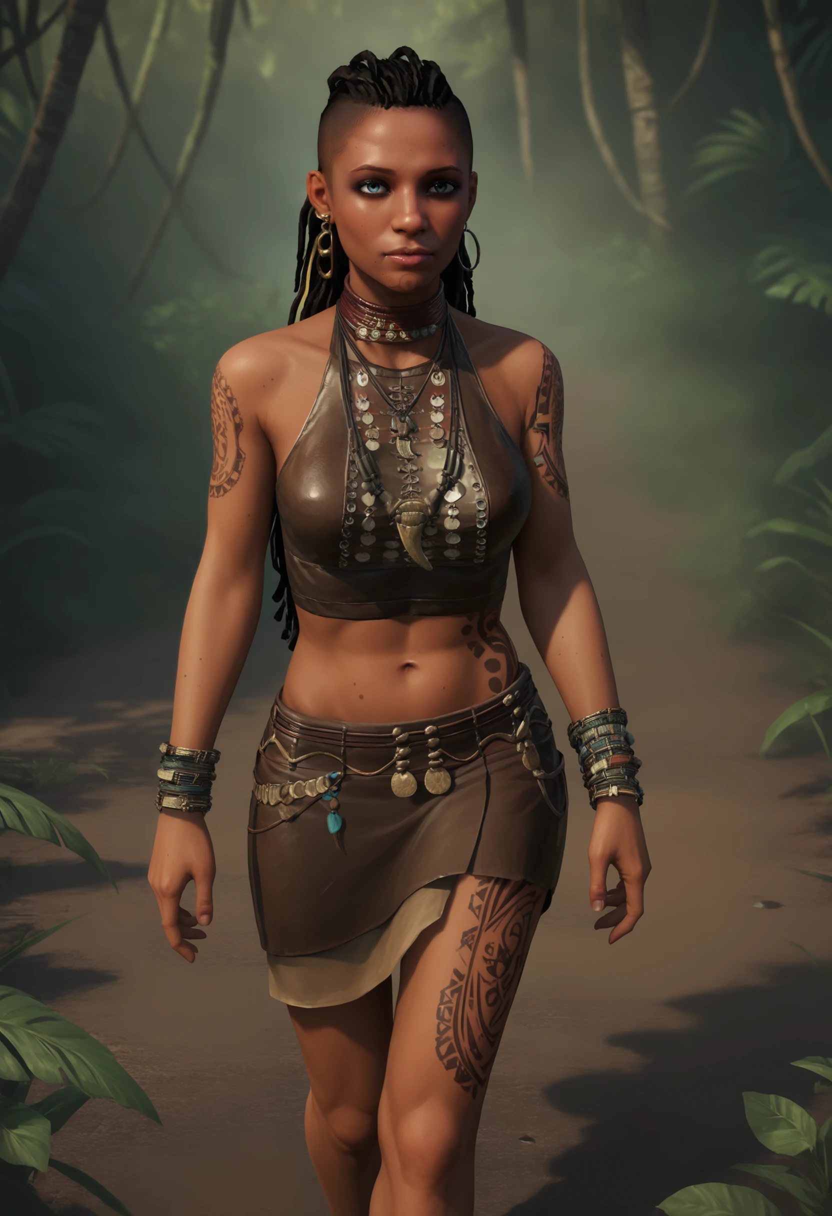 1girl, dark skin, dark-skinned female, black hair, dreadlocks, long hair, breasts, jewelry, earrings, tattoo, bracelet, necklace, midriff, blue eyes, lips, skirt, hoop earrings, tribal