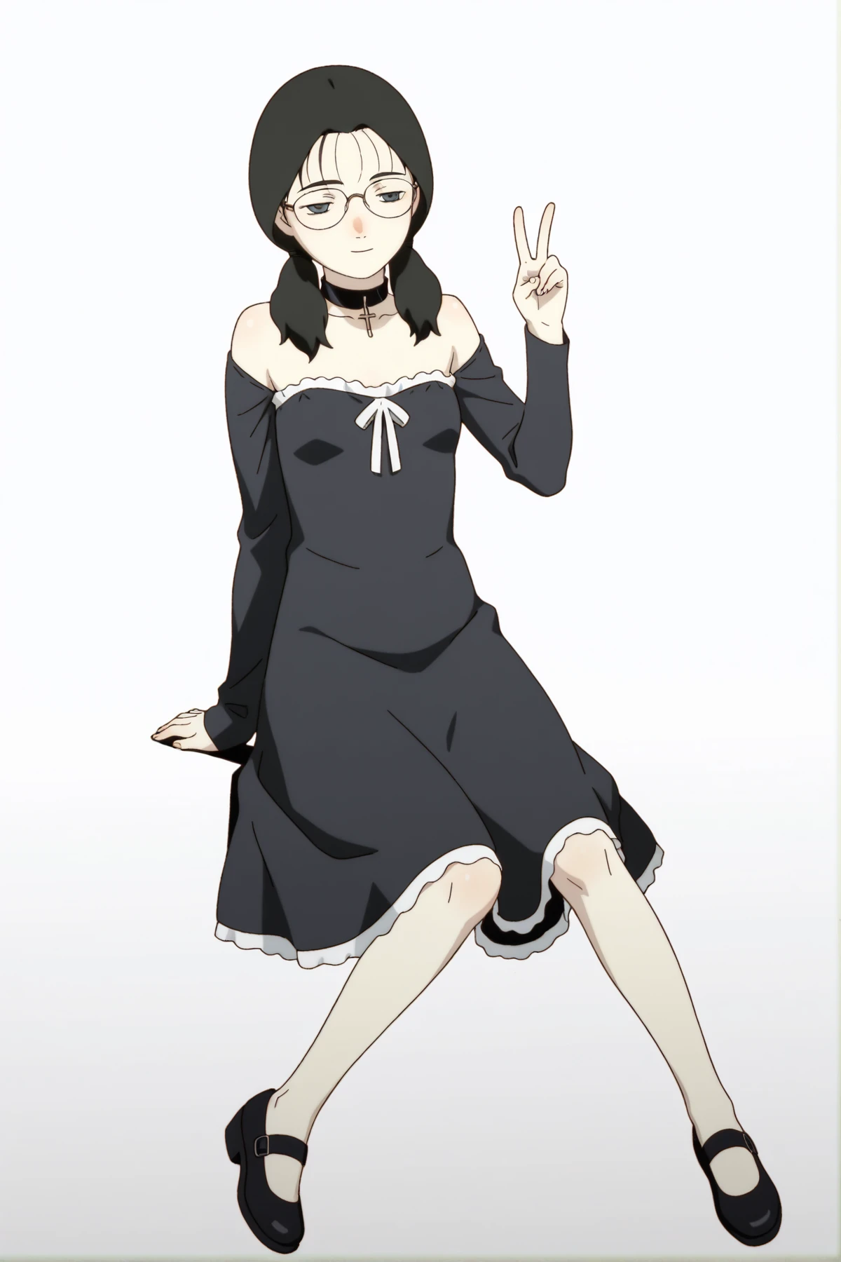 light blue dress, sleeveless, shoulders, white socks, black footwear