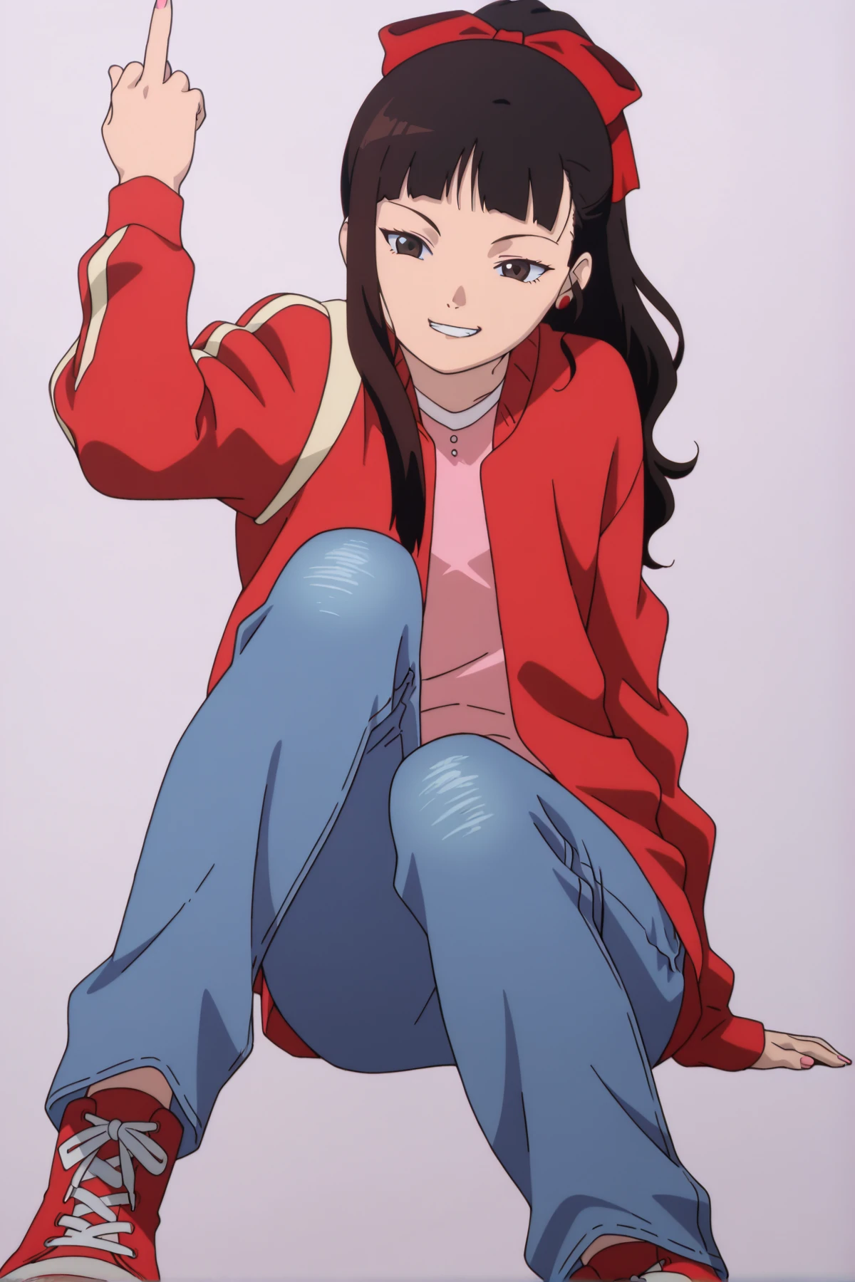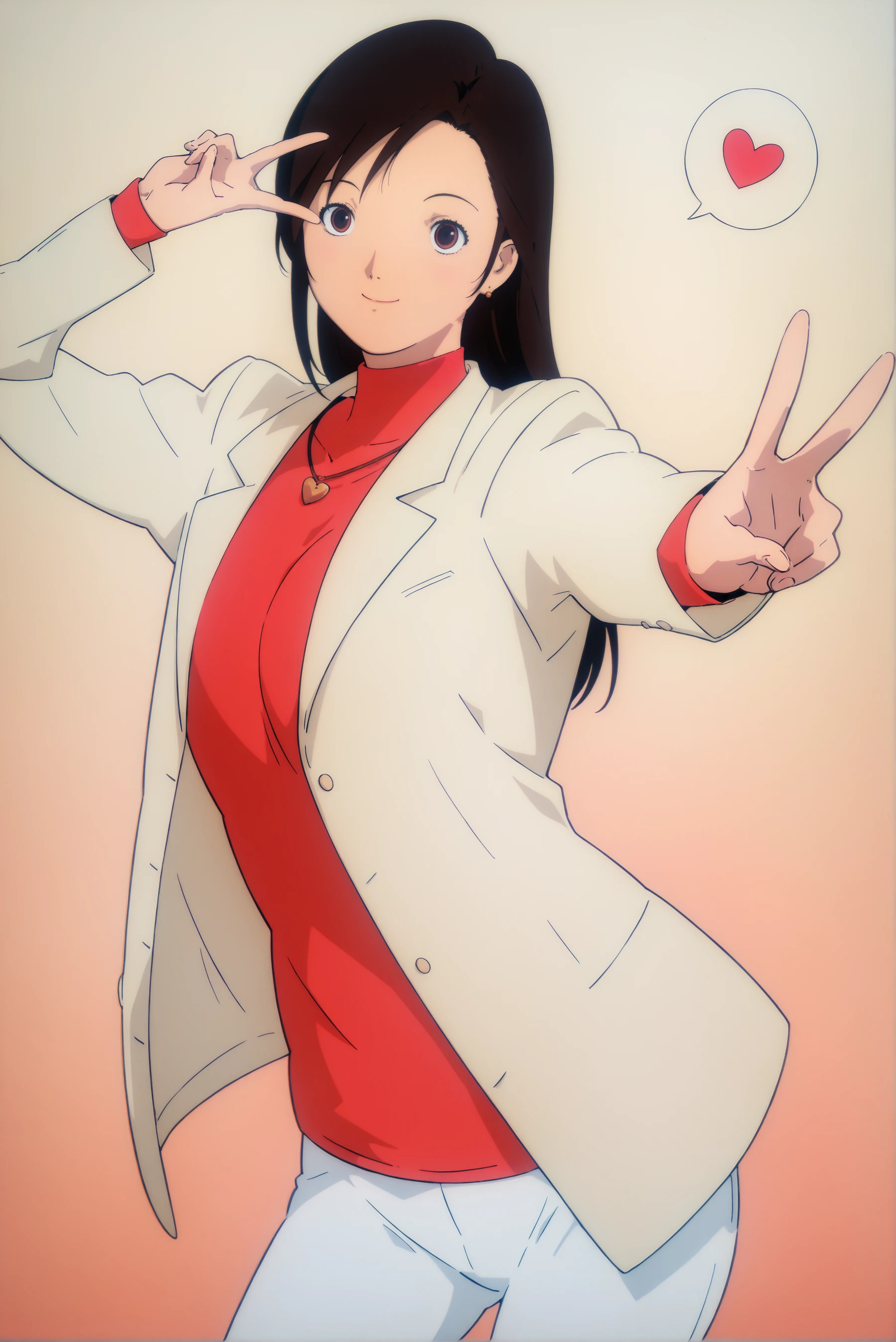 mizuki alice time-skip, tan jacket, red turtleneck shirt, heart necklace, white pants, brown footwear, handbag