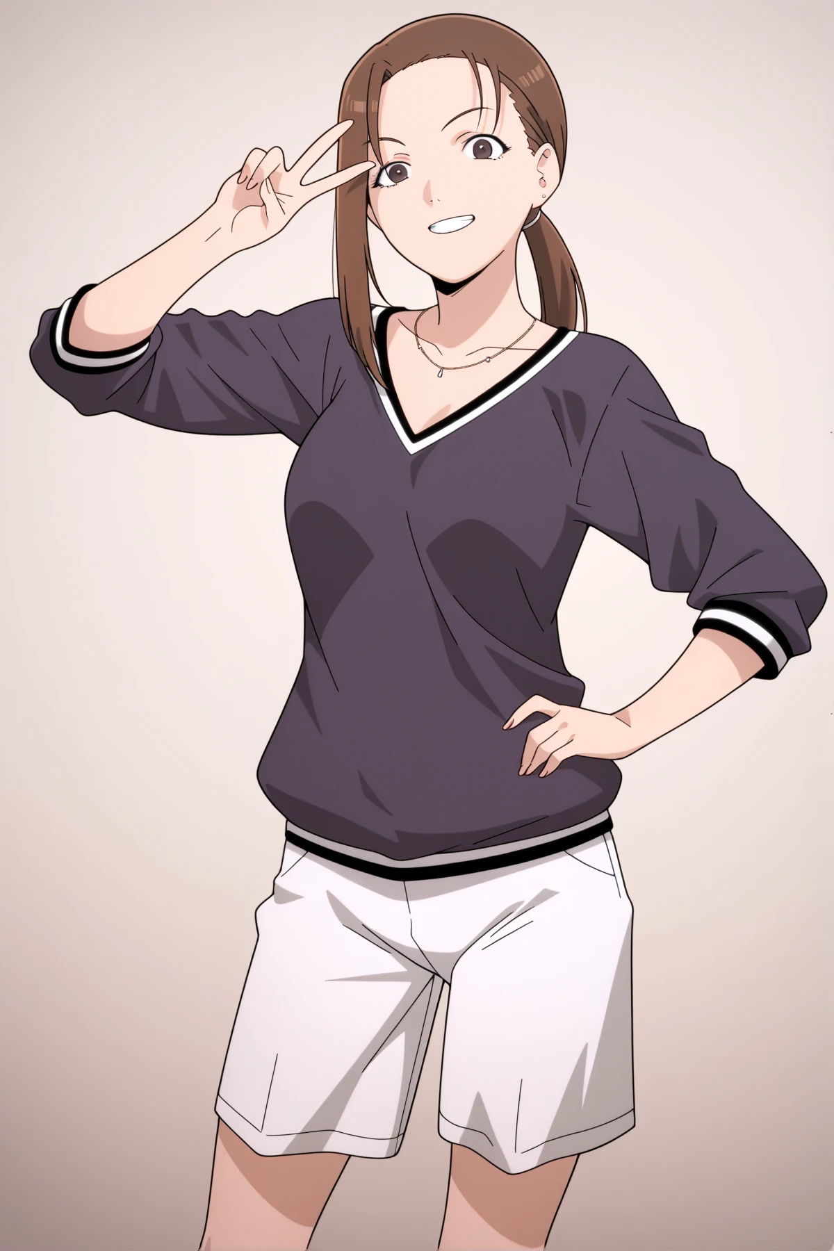 black v-neck shirt, necklace, ponytail, white shorts