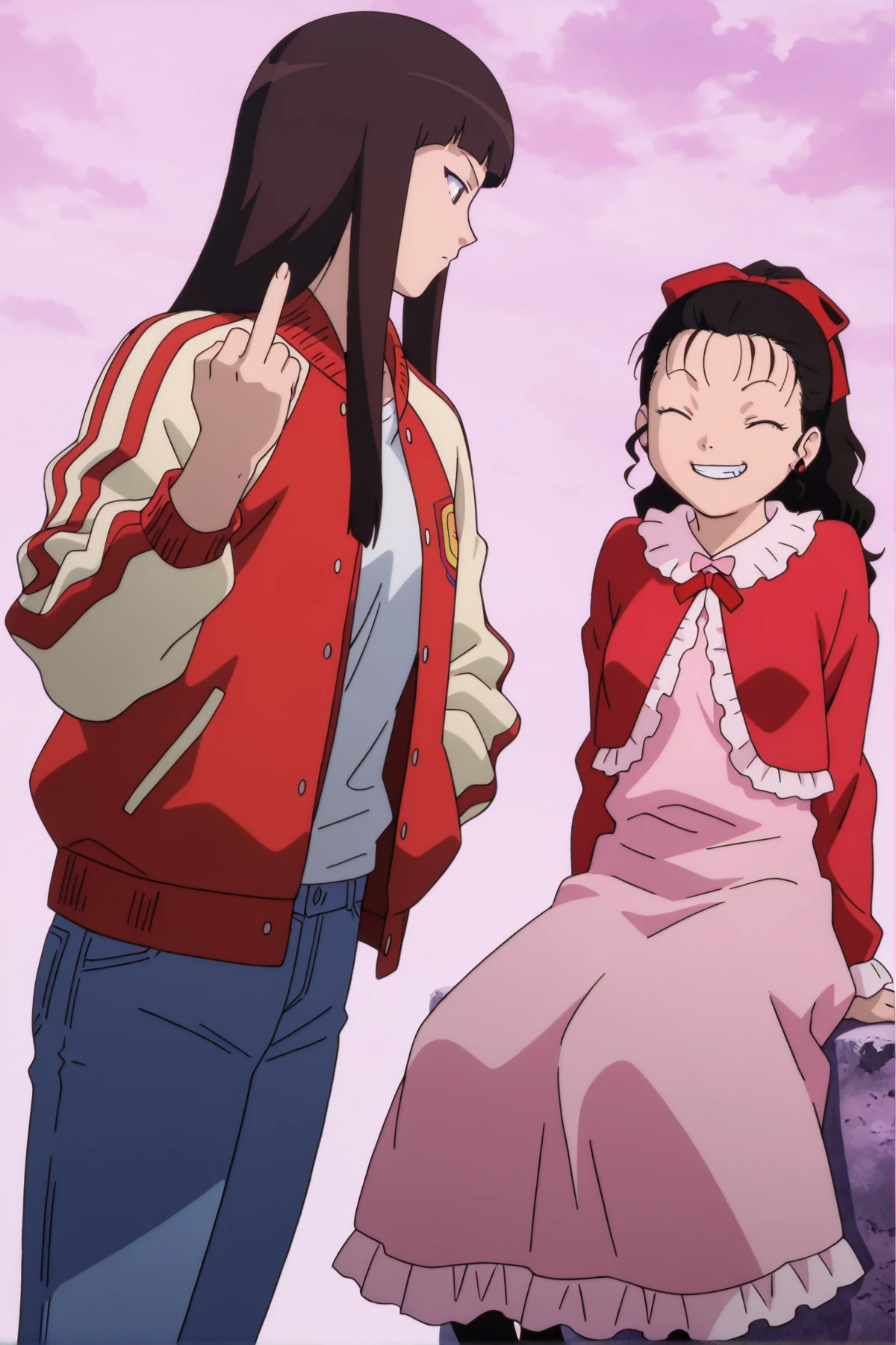 pink shirt, white bow, pink skirt, black thighhighs, red slippers