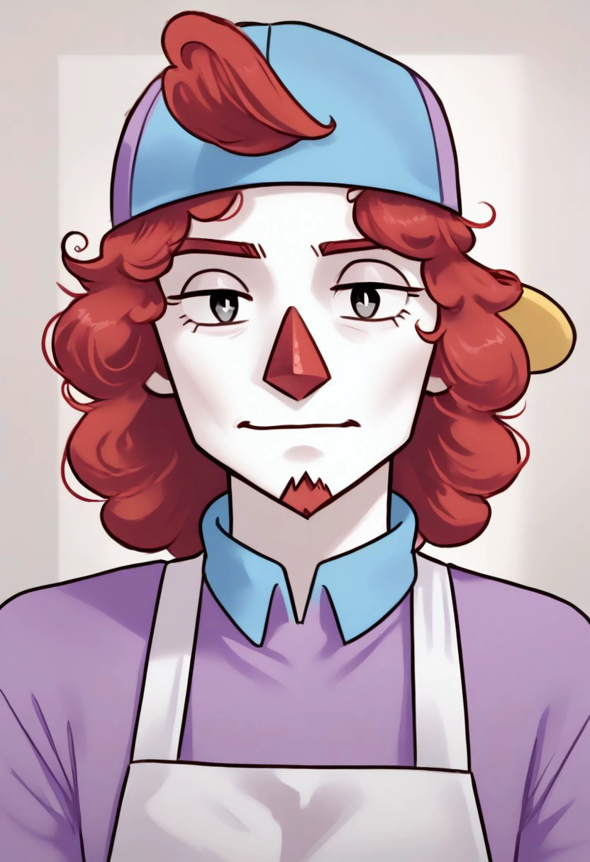 Synthz Mcwave, white skin, facial hair, red nose, red hair, curly hair, clown, cap, Male