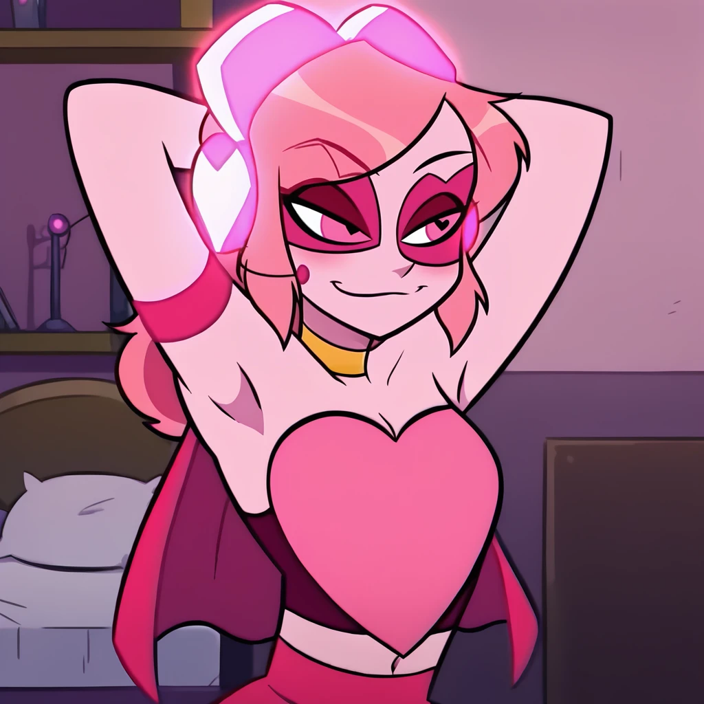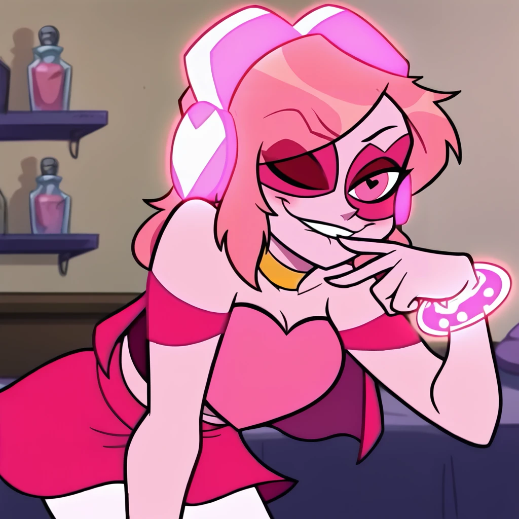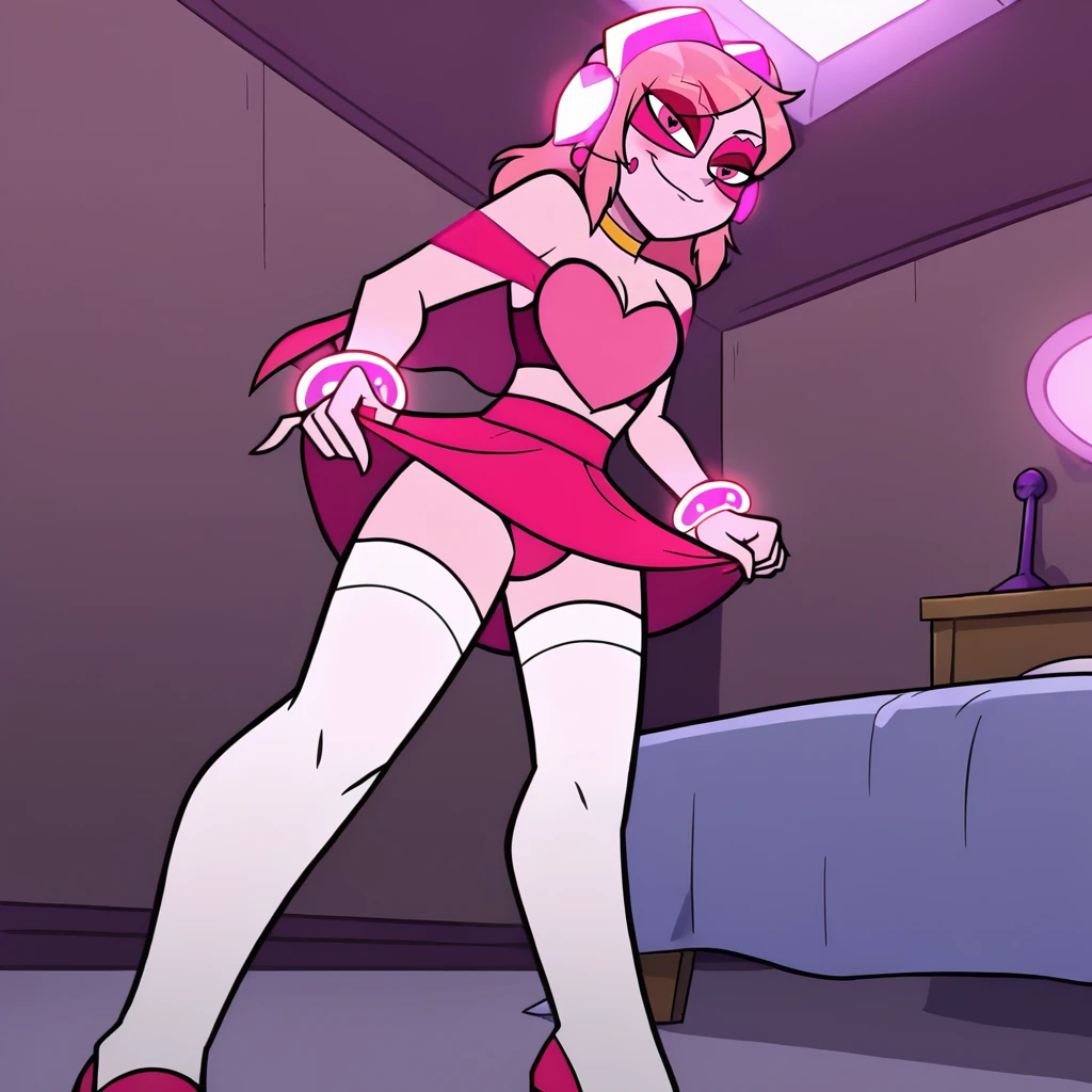 msh1, 1girl, cleavage, jewelry, medium breasts, upper body, pink hair, earrings, choker, pink eyes, bracelet, heart-shaped eyes, makeup, headphones, cape, pink skin, glowing, midriff, miniskirt, sleeveless, strapless, mask, white thighhighs, off shoulder, heels, pink skirt