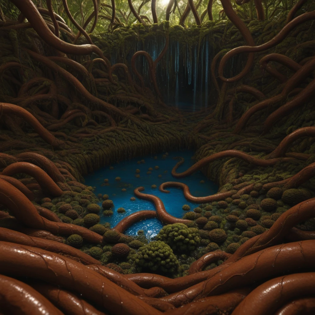 Ideal for a wide range of scenes: hidden jungle root mazes, ancient forest undergrowth, fantasy cave systems, botanical horror environments, primal nature backdrops, surreal underground adventures, or blending into lush tropical landscapes. It adds intense organic depth, texture, and mood to any composition — perfect for atmospheric world-building, environmental storytelling, or merging with other styles.