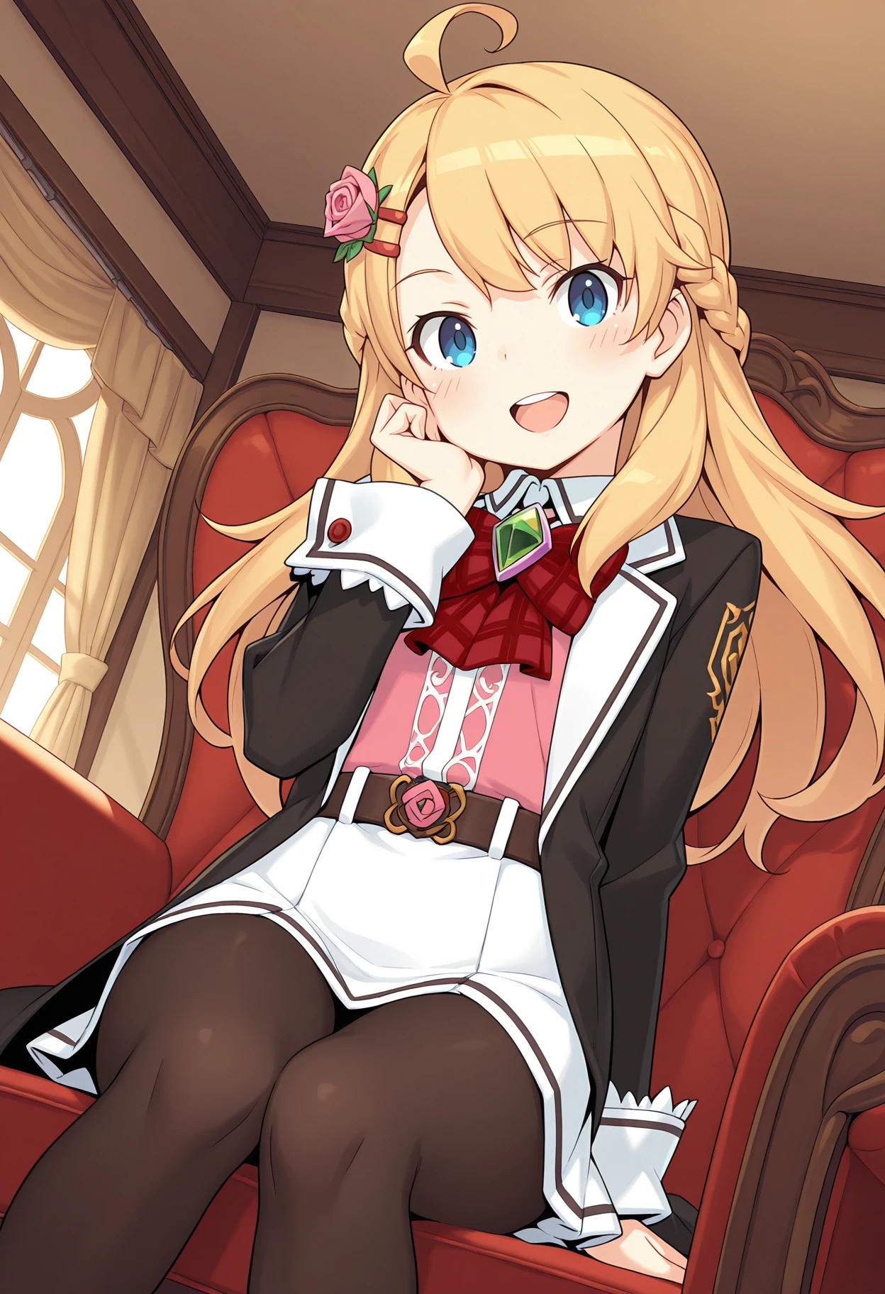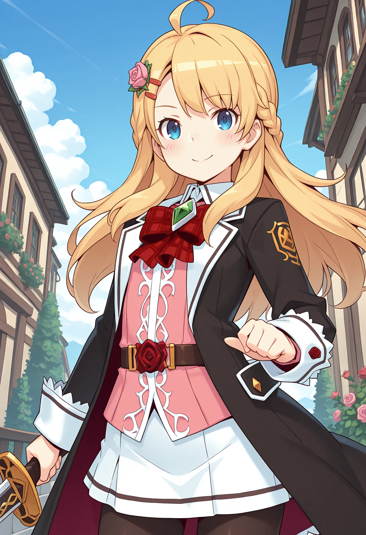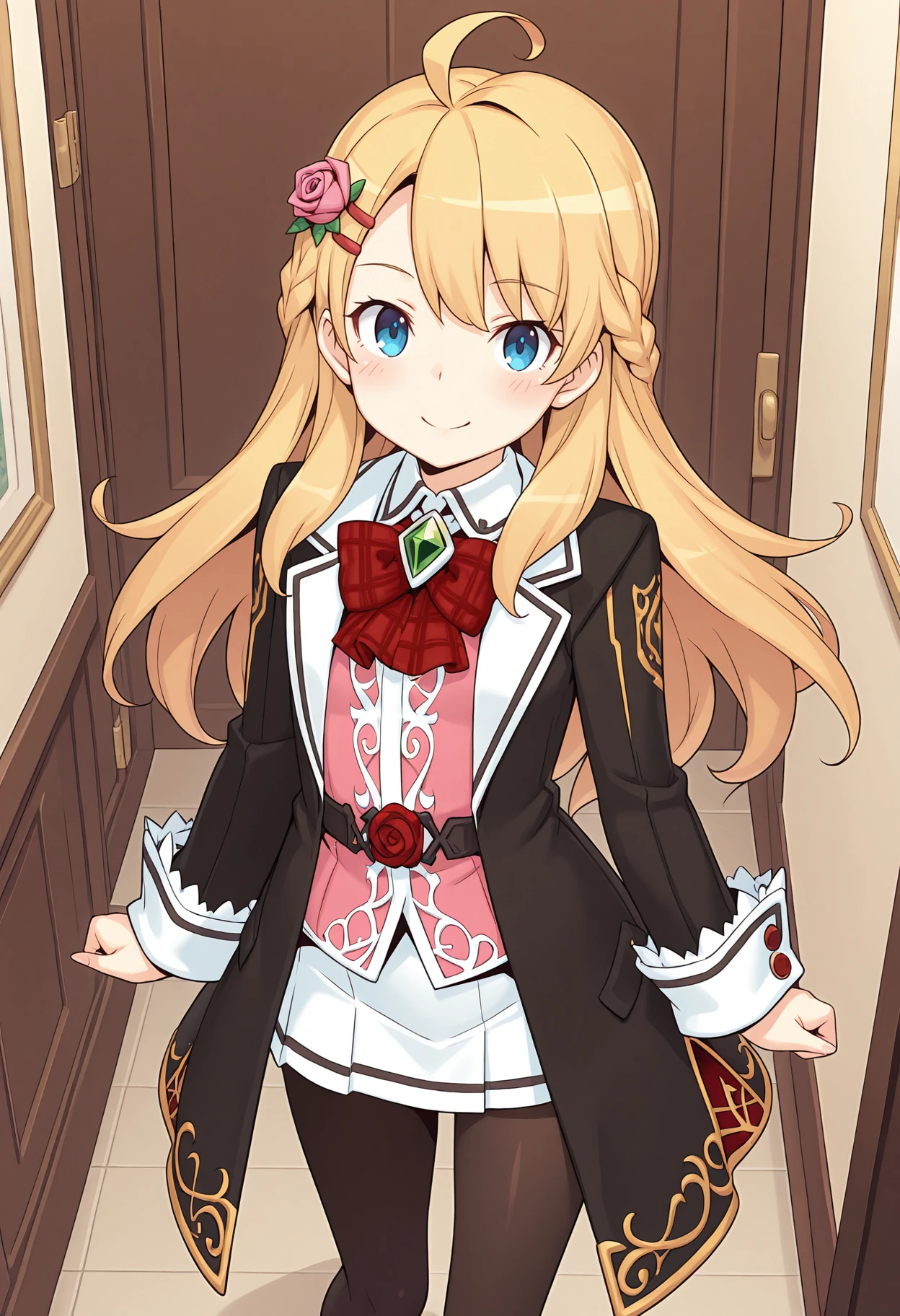 hair flower, hairclip, pink rose, black coat, open coat, white collar, collared shirt, red bowtie, plaid bowtie, gem, pink shirt, belt, red rose, white skirt, black pantyhose,