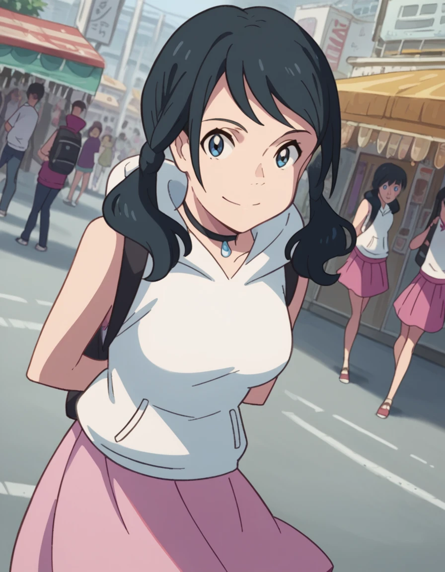 skirt, jacket, sleeveless, choker, hood, bag, hoodie, white jacket, backpack, hood down, hooded jacket, pink skirt, sleeveless jacket, sleeveless hoodie,