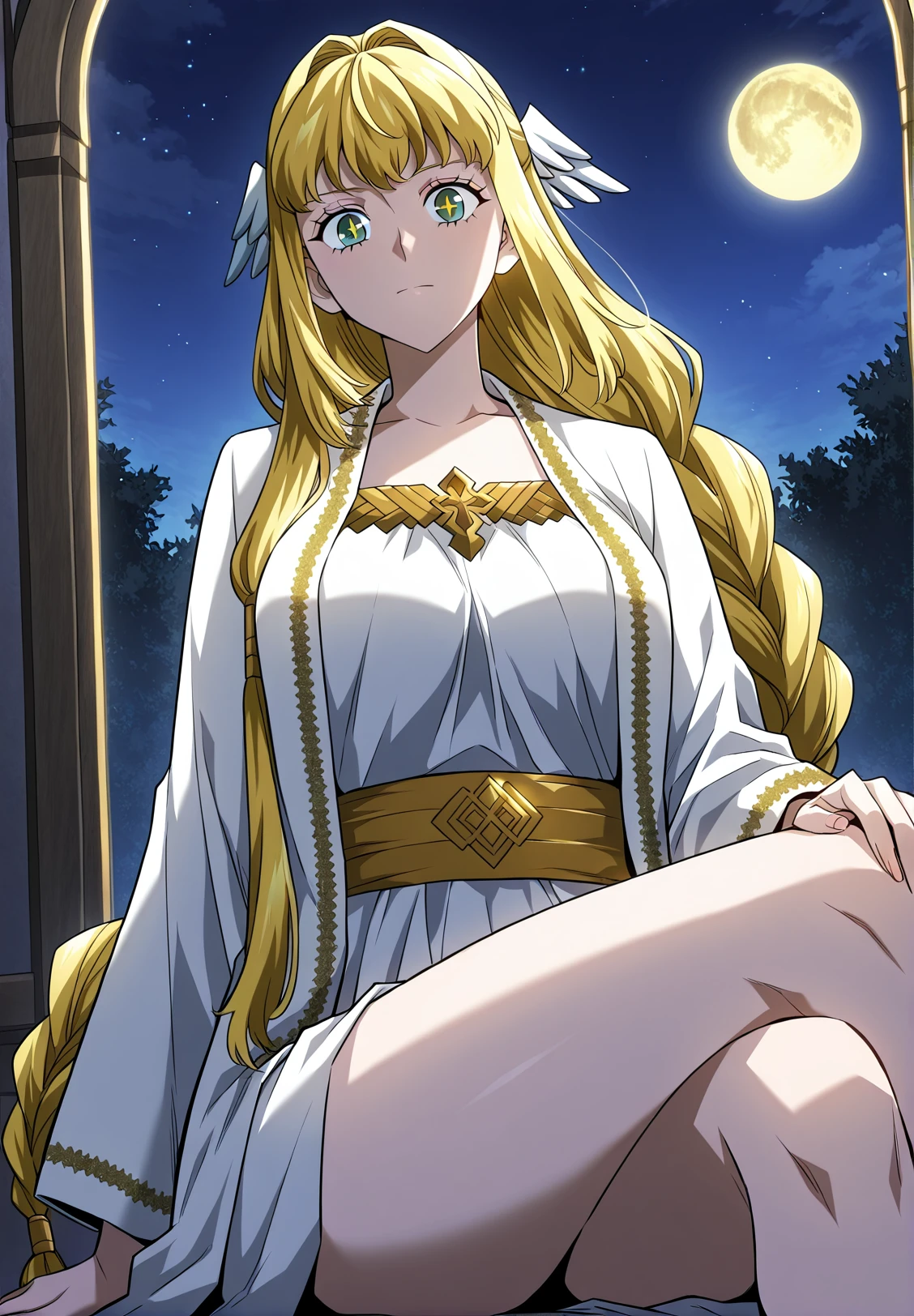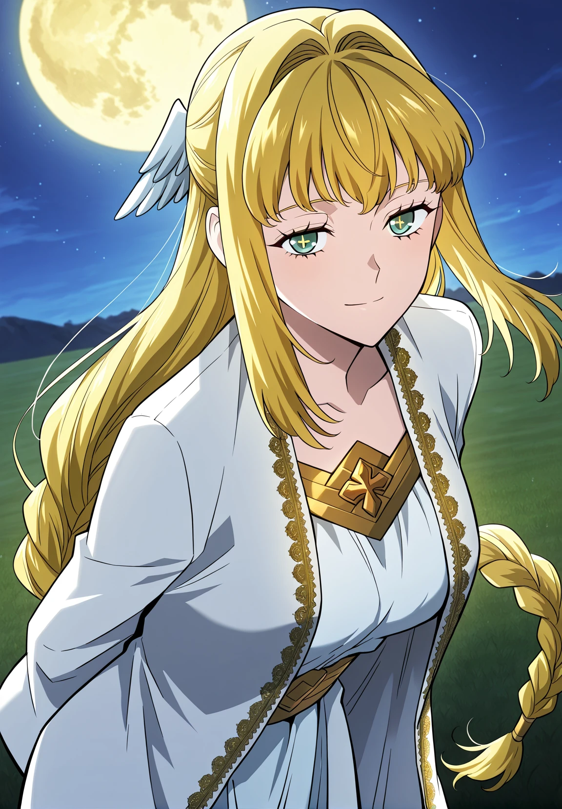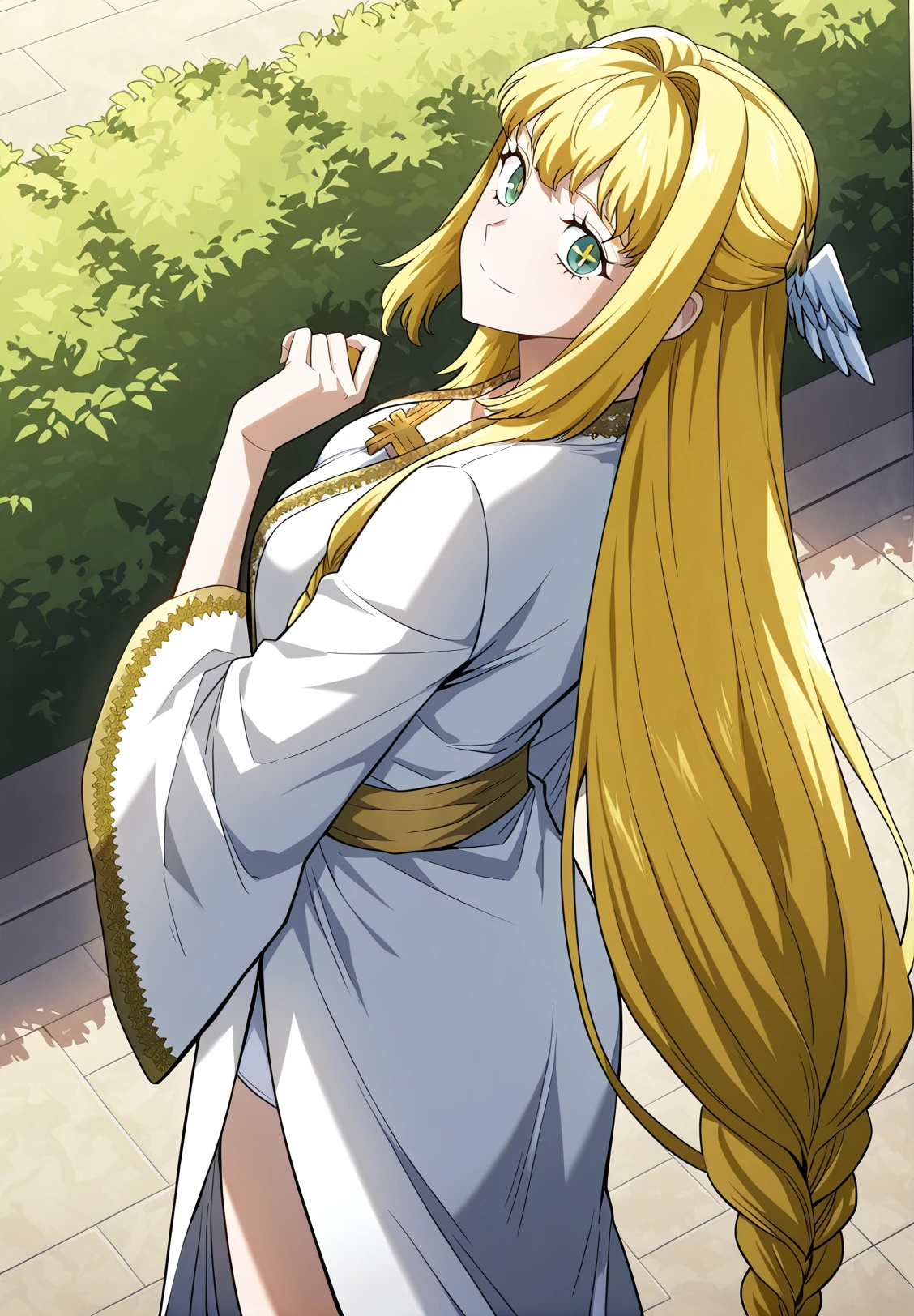 1 girl, solo, long hair straight hair, blonde hair, thick braid, long braid, straight fringe, wing hair ornament, green eyes, cross pupils