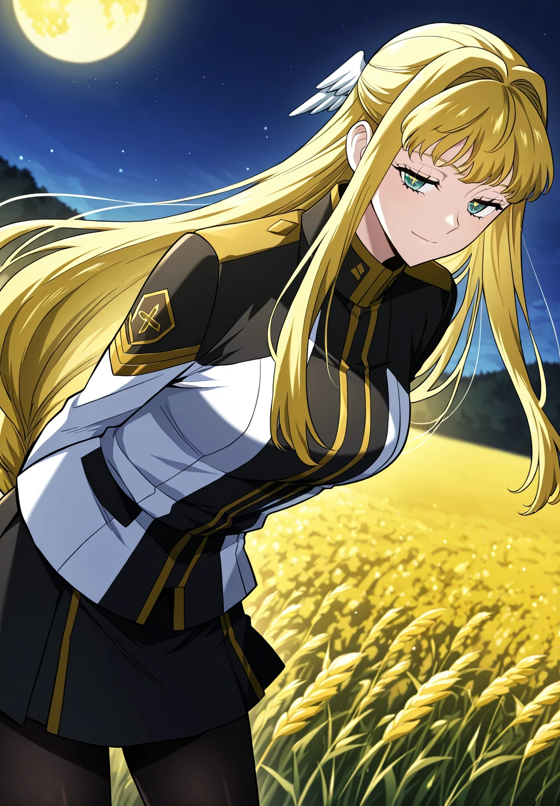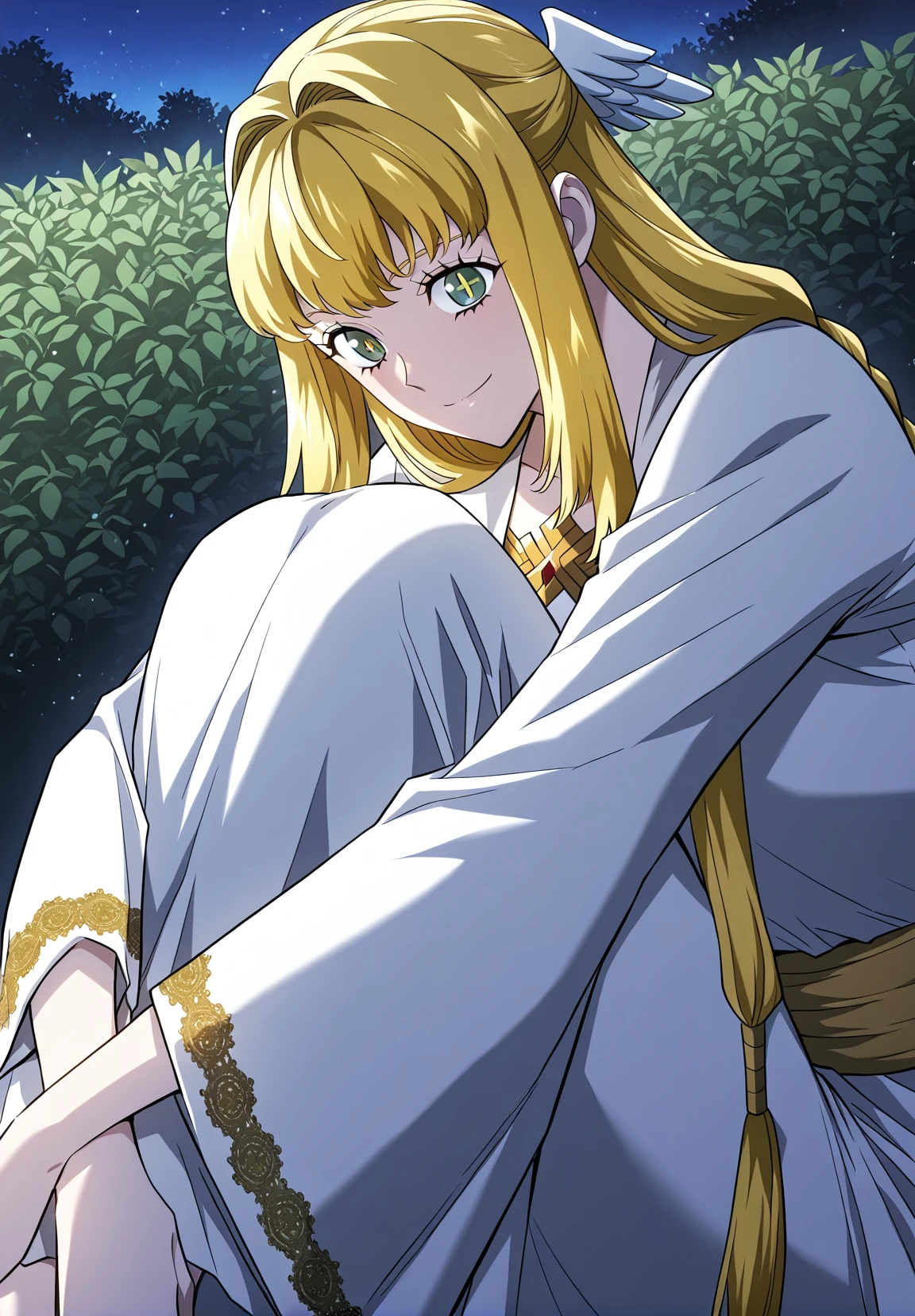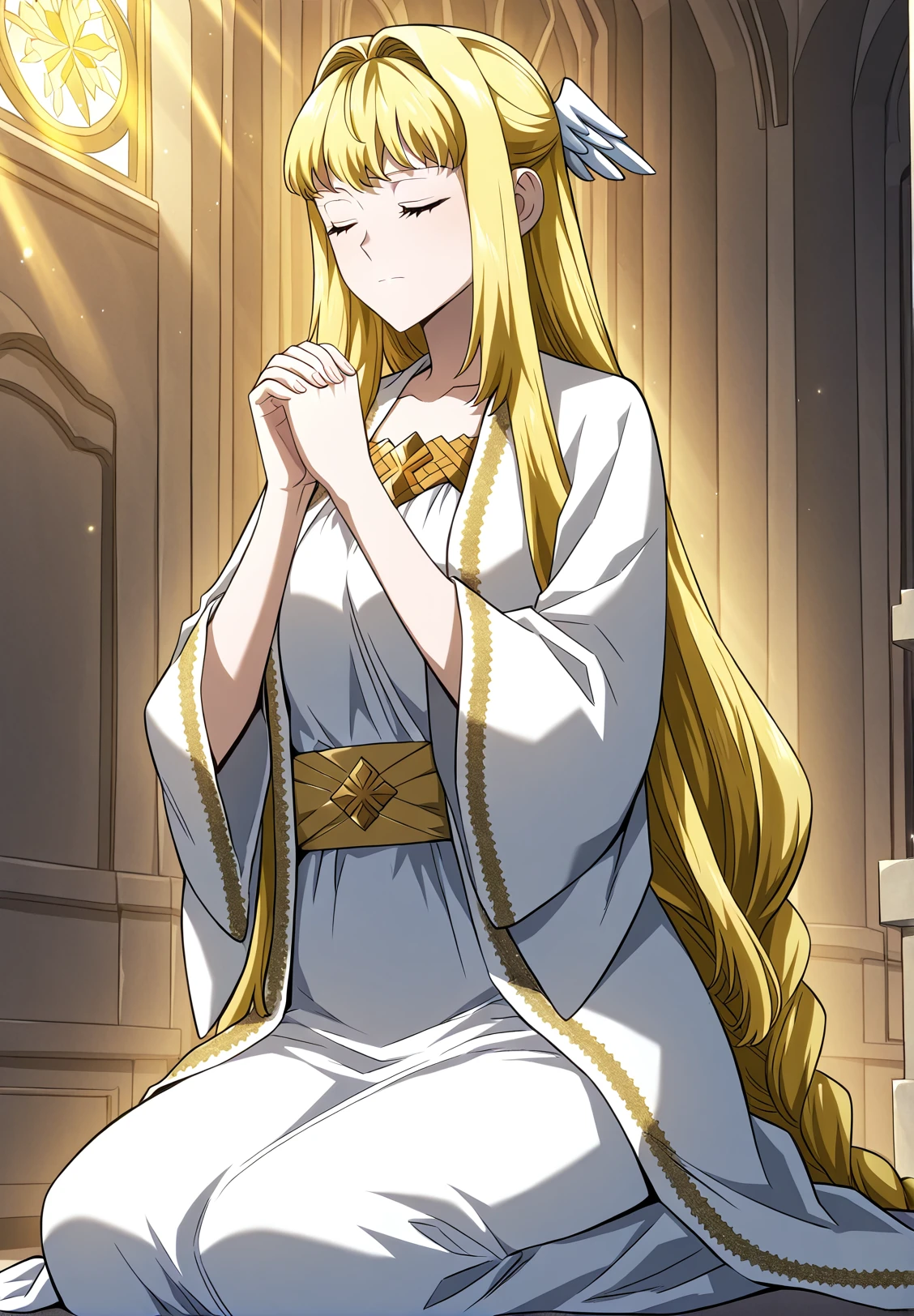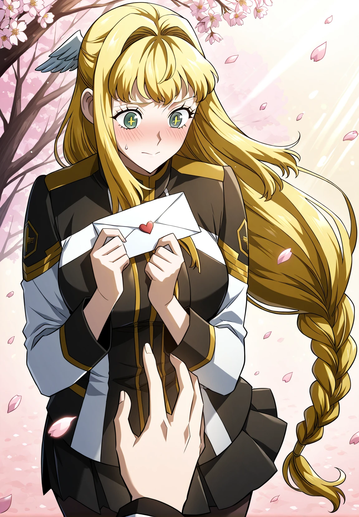 1 girl, solo, long hair straight hair, blonde hair, thick braid, long braid, straight fringe, wing hair ornament, green eyes, cross pupils