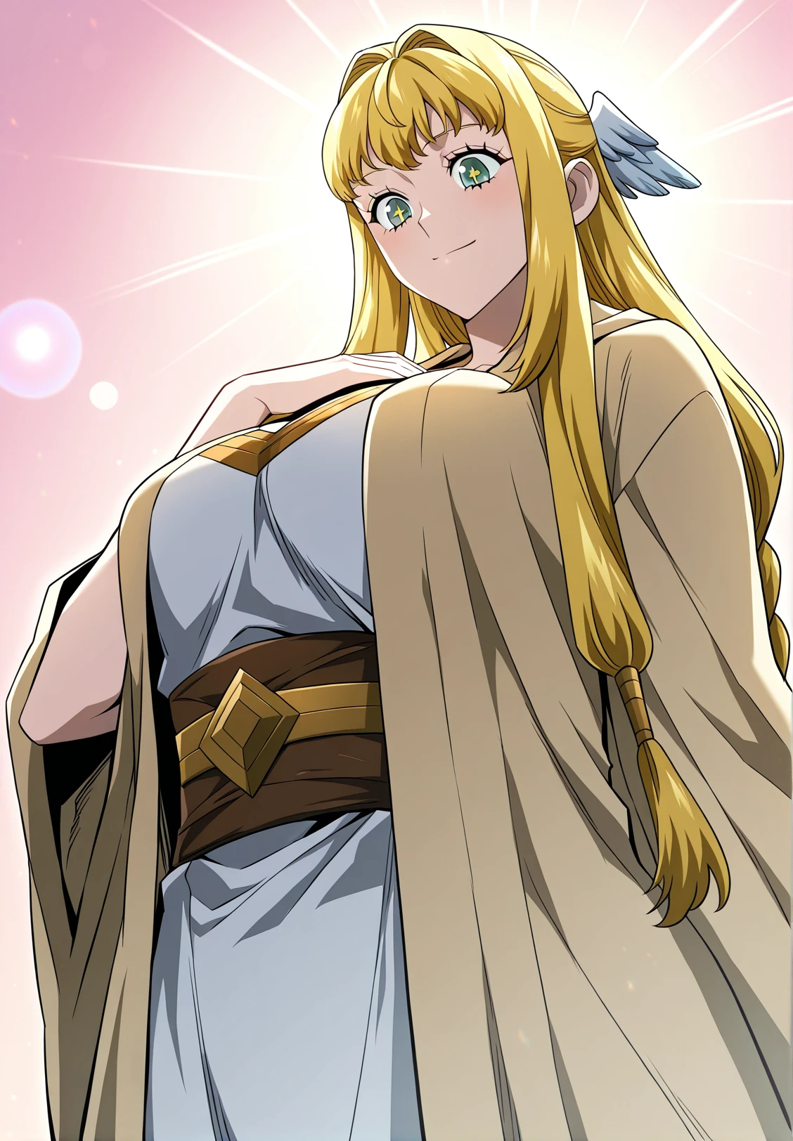Dolores_Quovadis_priest, beige outer robe, wide sleeves, brown waist sash, golden neckline detail, side braids, priestess outfit
