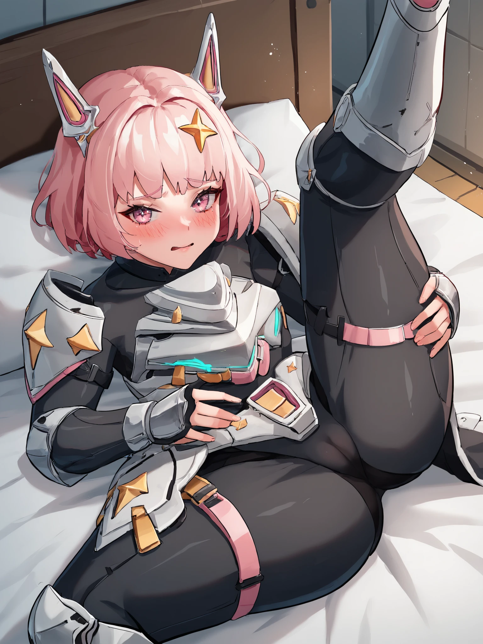 noahnikke, pink eyes, pink hair, short hair, headgear, sparkle hair ornamentblack bodysuitarmor, shoulder armor, breastplate, armored gloves, armored bodysuit, armored boots, pauldrons, shield, hip armor, leg armor, armored skirtand finally, most importantly:
