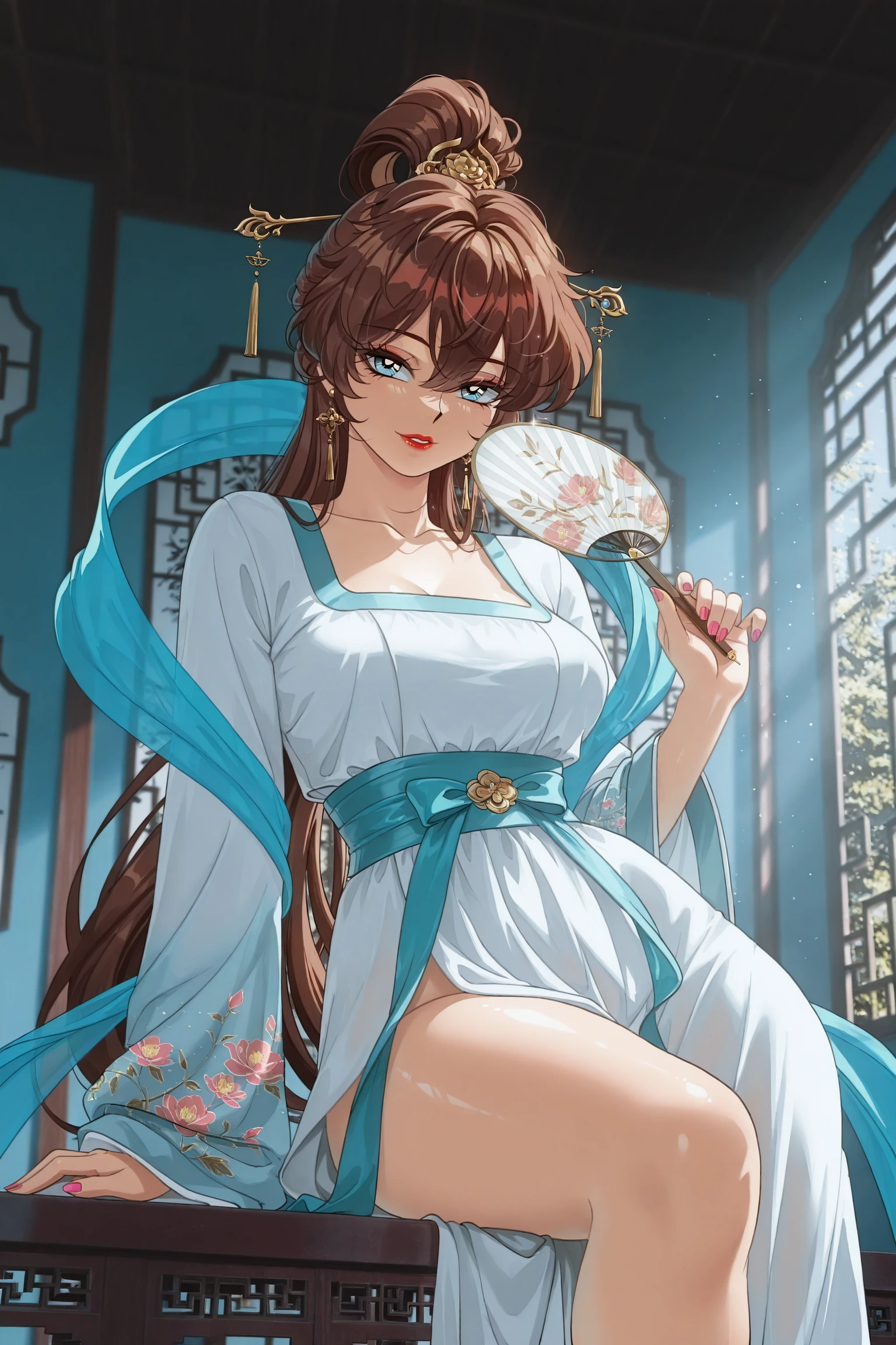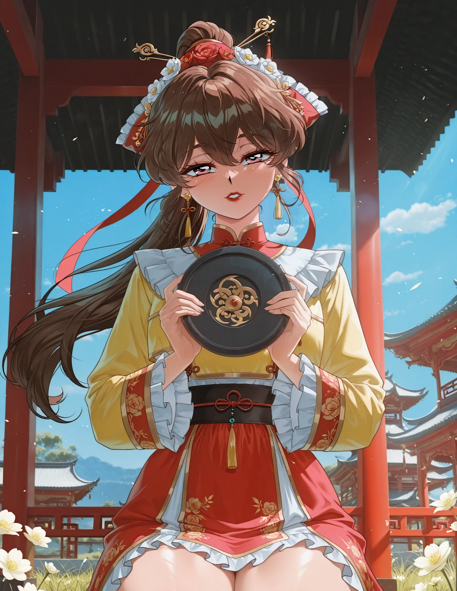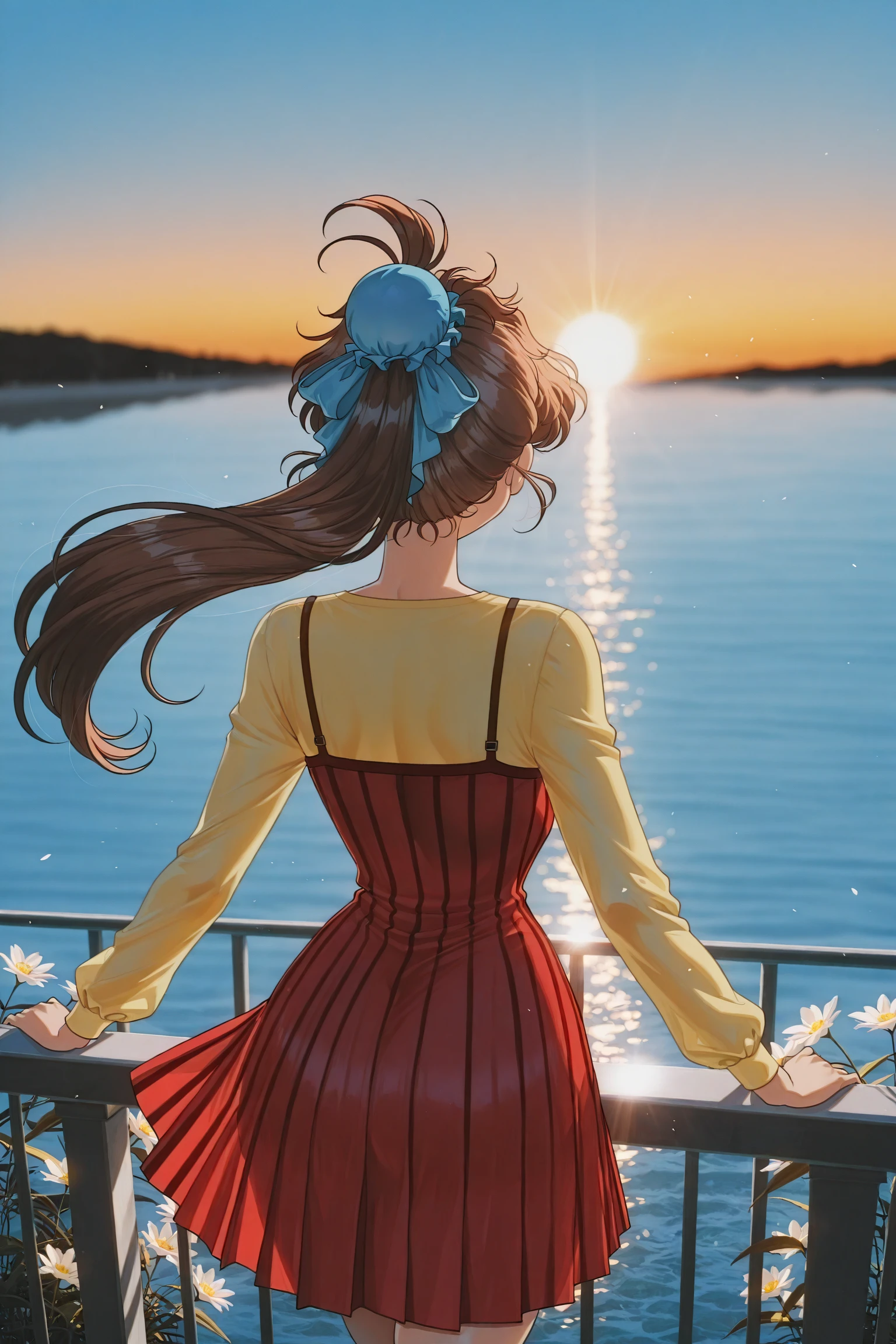 blue bow, blue bun cover, crew neck, yellow undershirt, long sleeves, spaghetti strap, red dress, striped dress, skirt under dress, yellow skirt, pleated skirt