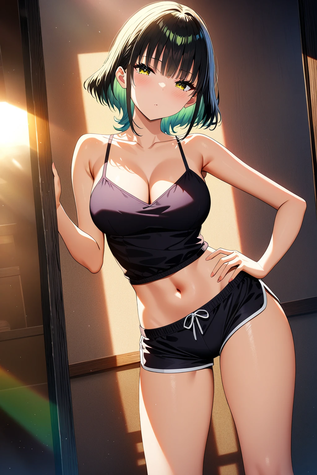 mio, yellow-green eyes, short hair, black hair, bangs, large breasts,