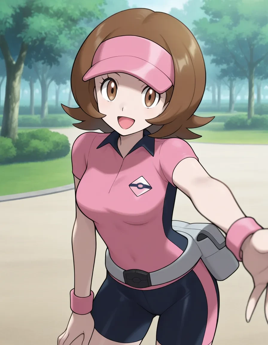 sportswear,pink visor cap,pink shirt,short sleeves,belt pouch,grey pouch,pink wristband,bike shorts,short shorts,pink footwear,