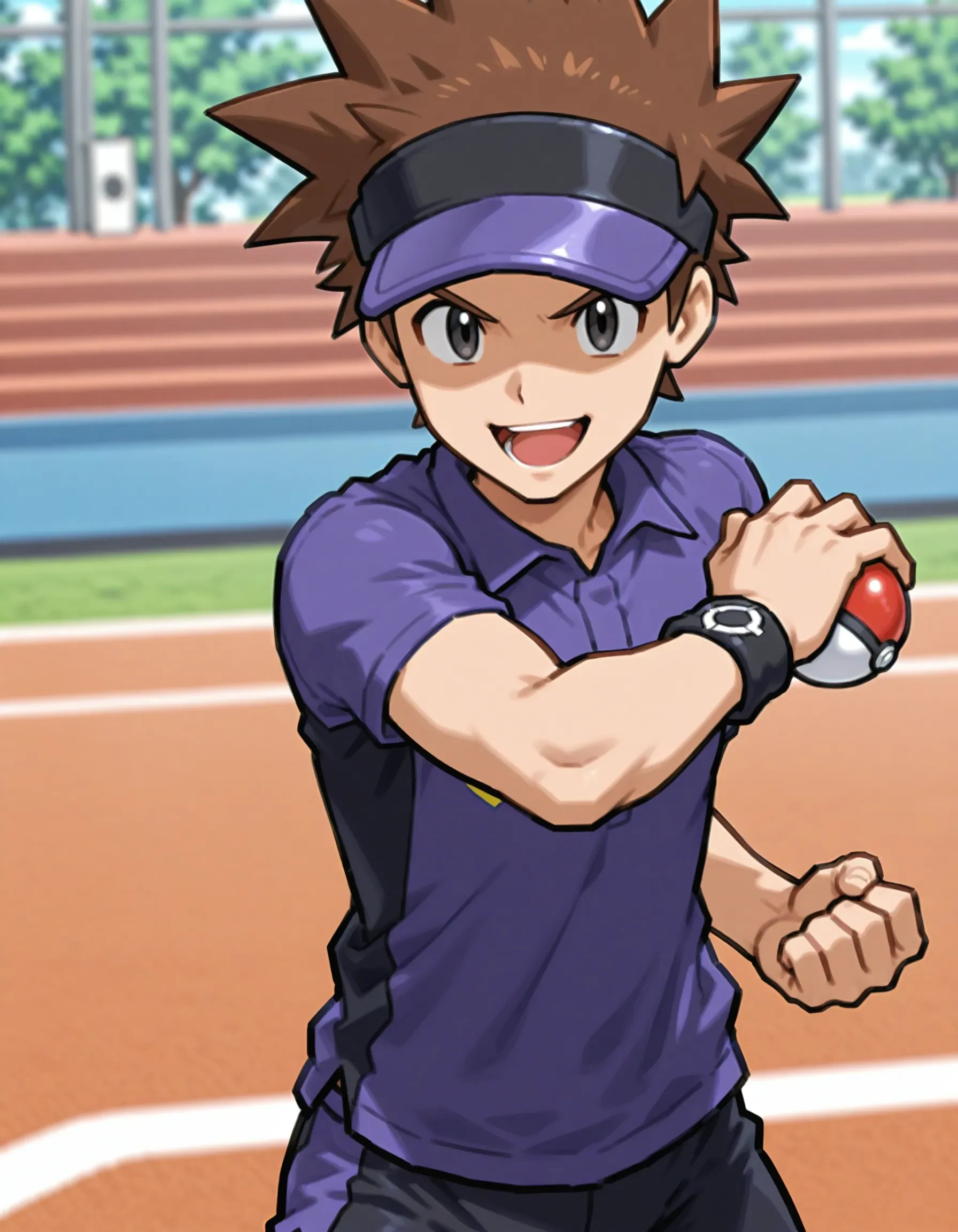 sportswear,visor cap,purple shirt,short sleeves,wristband,bike shorts,black socks,purple footwear,