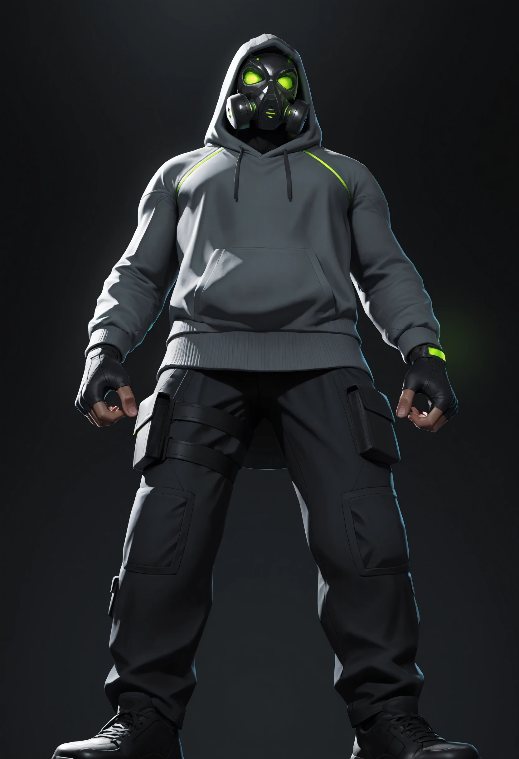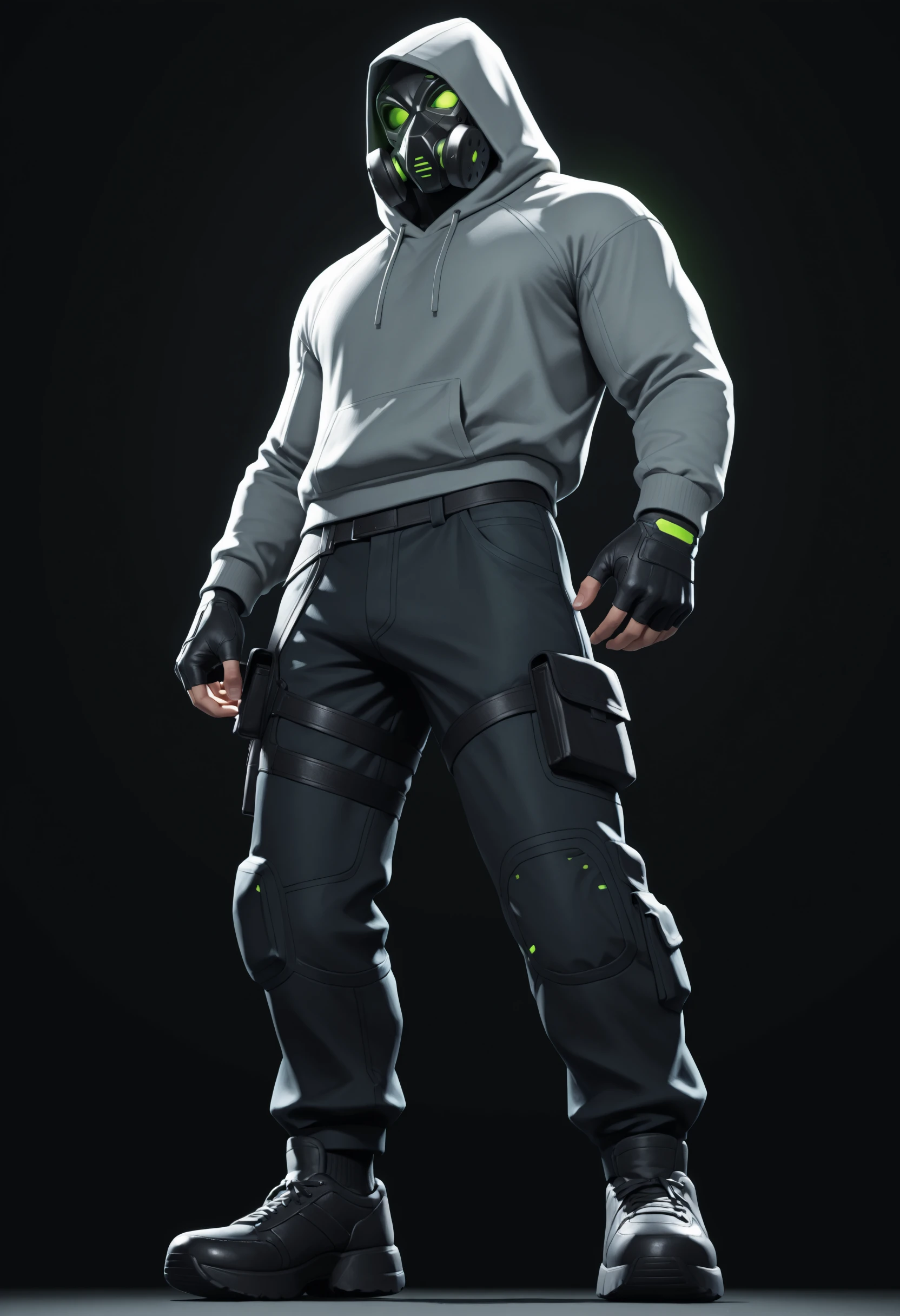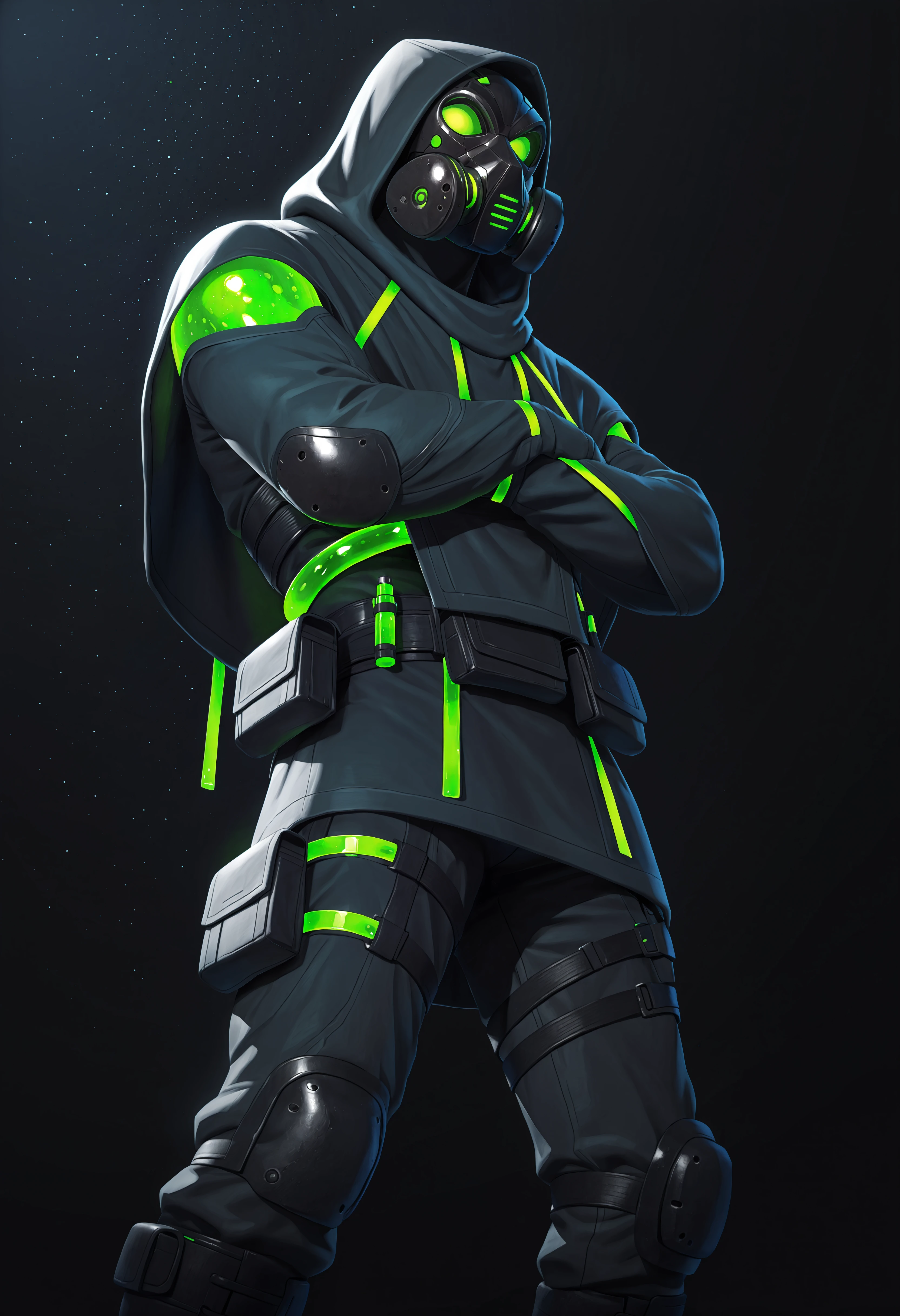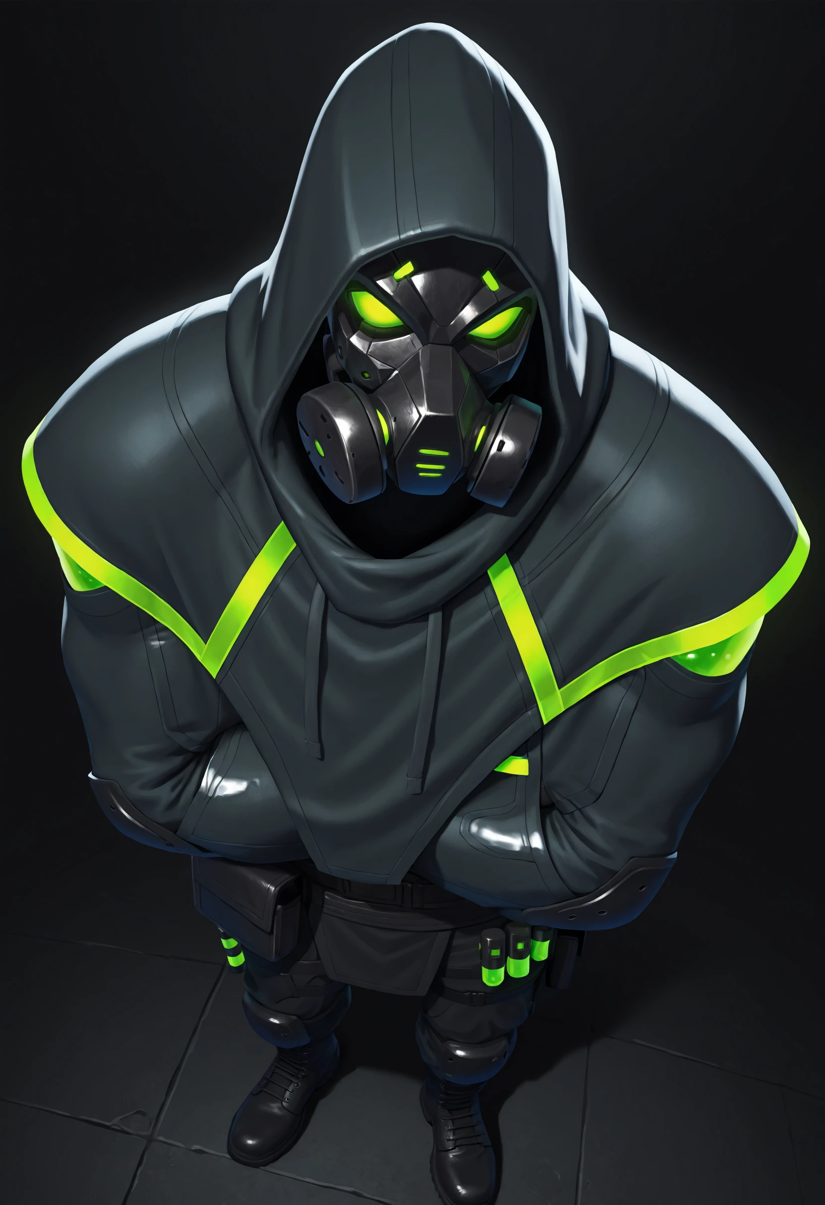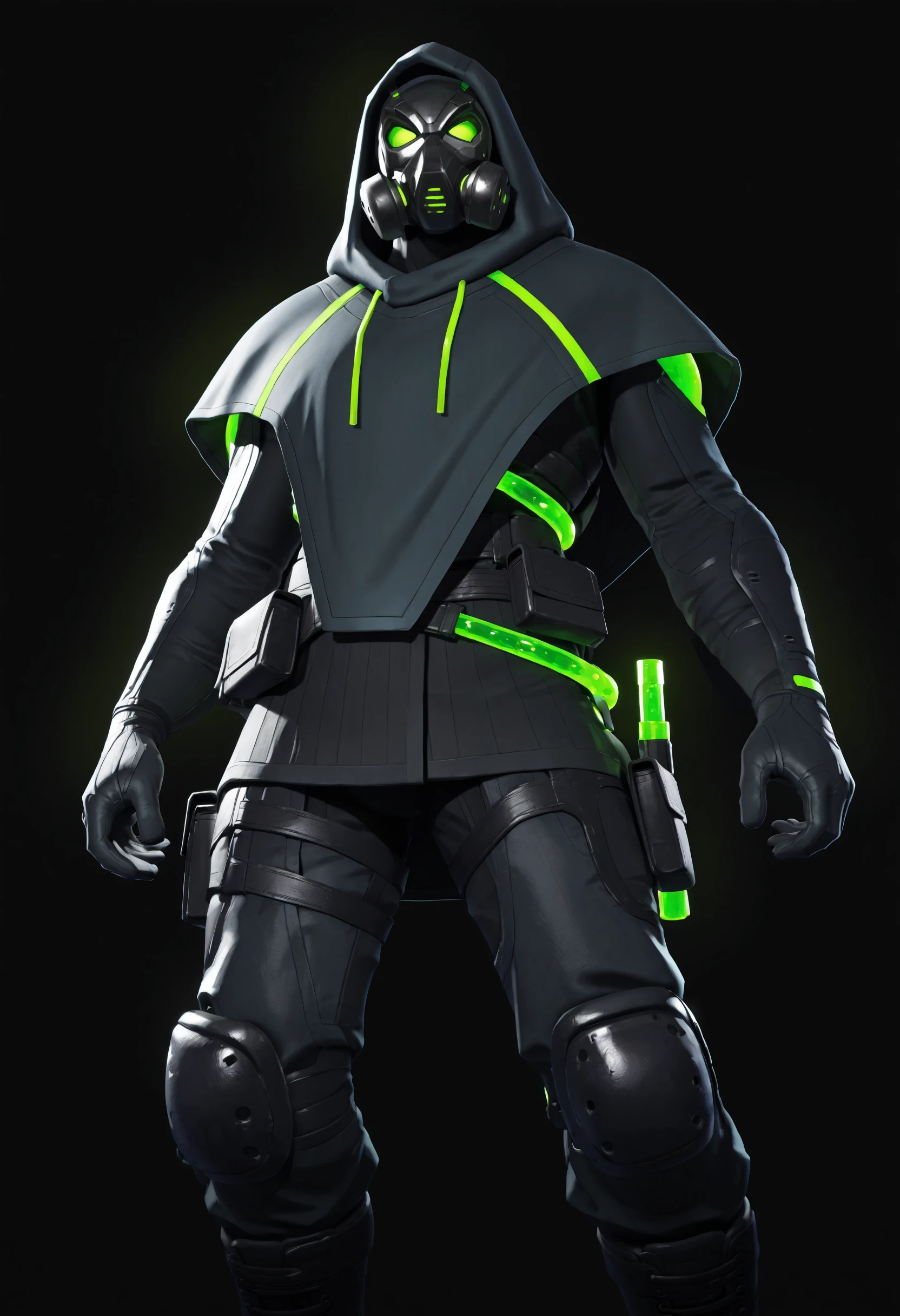 hooded poncho, tight long sleeves with neon green accents on wrists, combat boots, tactical belt, belt pouches, armored pants, thigh straps, knee pads, neon green tubes,