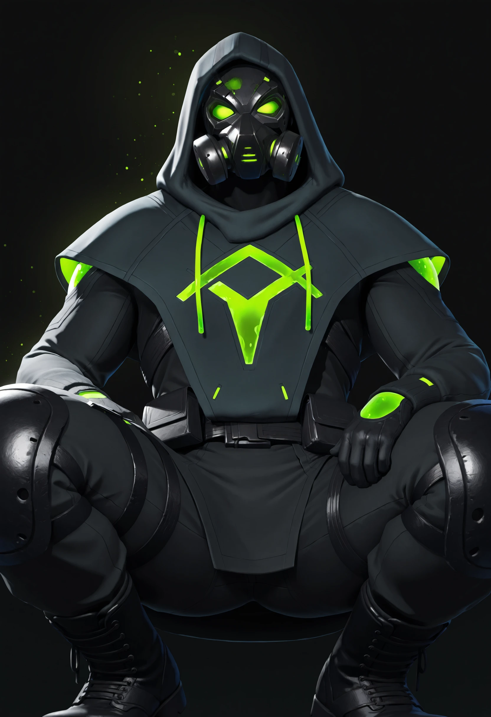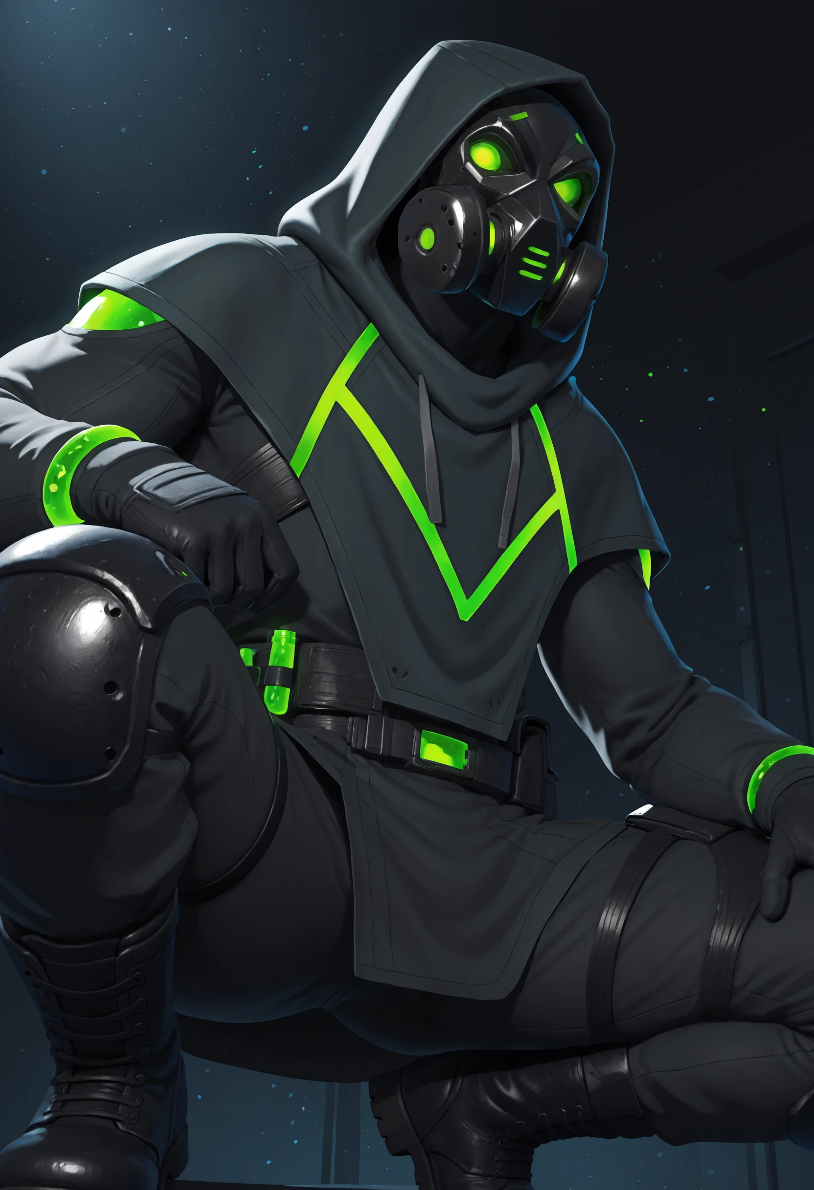 hooded, mask on, gas mask, rectangular glowing green eyes,