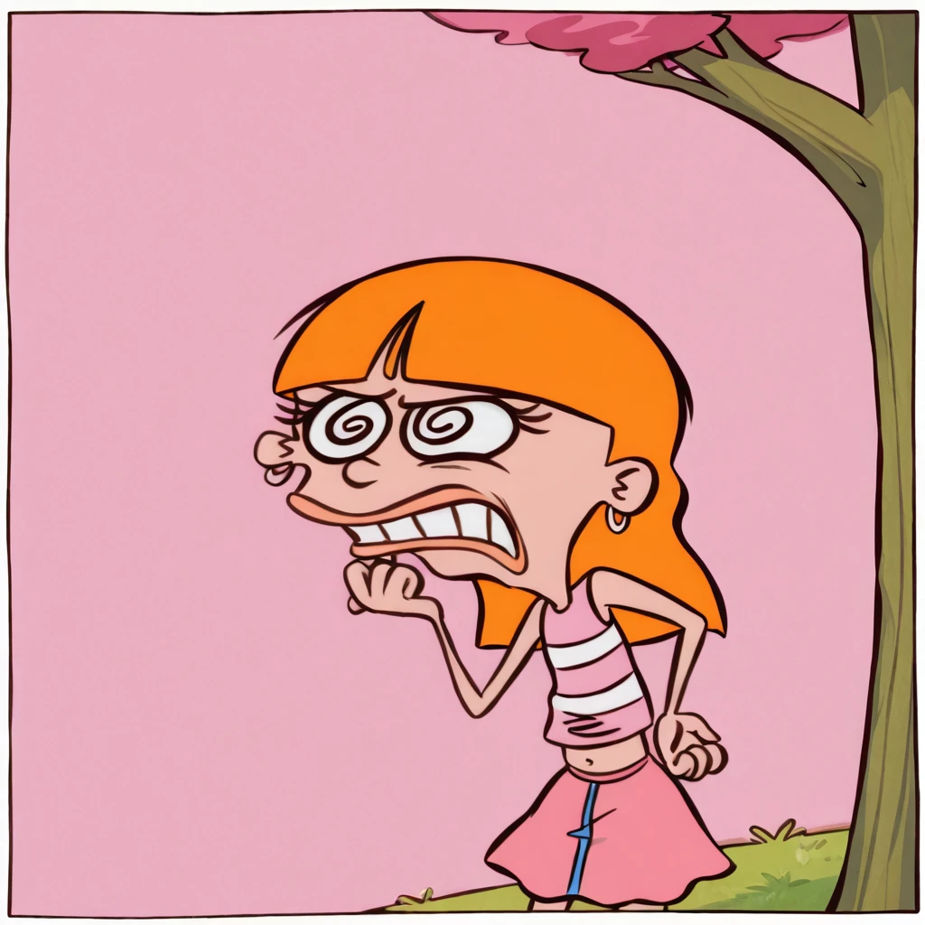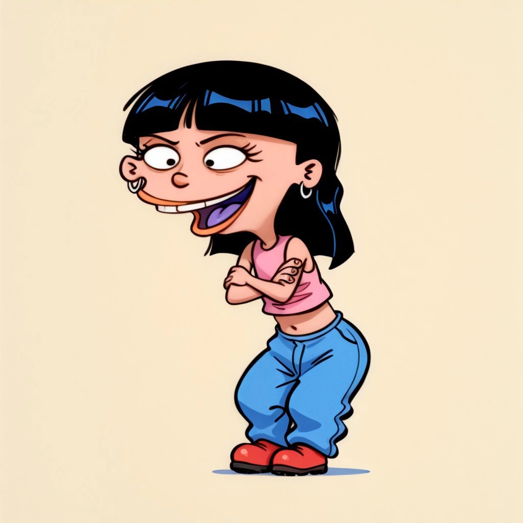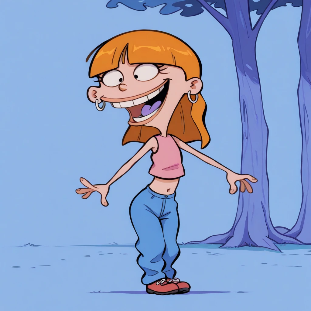 Standard Prompt: SarahHEEE, 1girl, solo, orange hair, long hair, midriff, earrings, hoop earrings, crop top, navel, pants, shoes