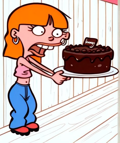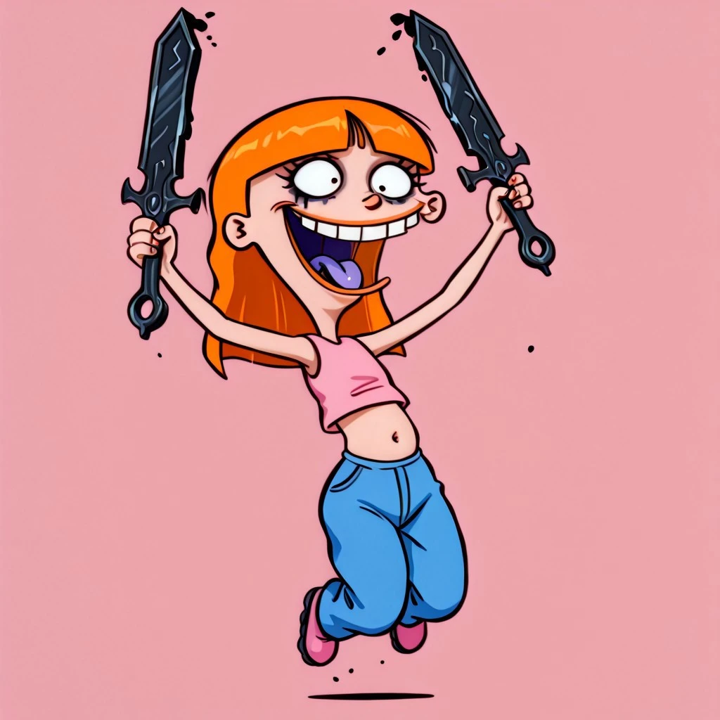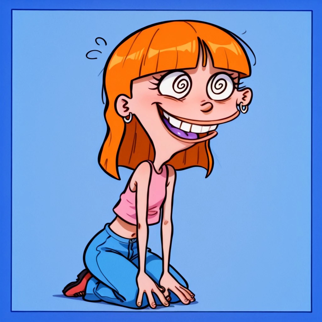 1girl, solo, chibi, orange hair, midriff, earrings, hoop earrings, crop top, navel, jeans, red shoes