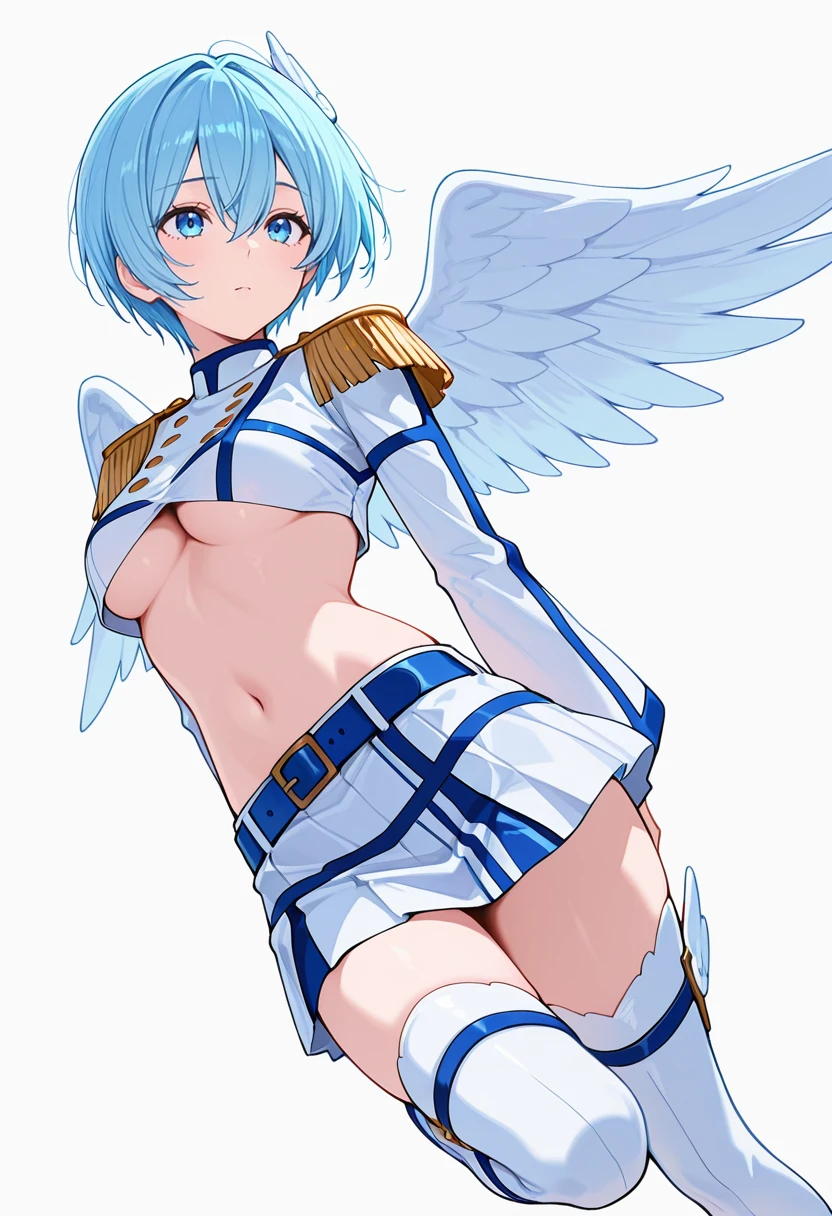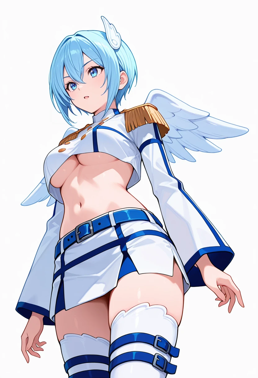 angel wings, midriff,underboob,crop top,white shirt, skirt,blue belt,white thighhighs, thigh boots,epaulettes,wing hair ornament, zettai ryouiki,Explanation and notes below👇