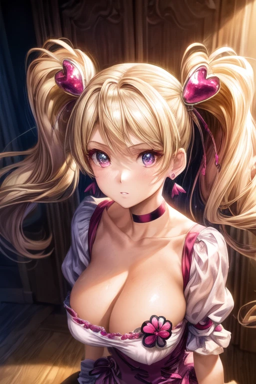 Trigger word: peach_a, pink eyes, heart hair ornament, long twintails, jewelry, heart earrings, pink choker, cure peach's costume, short sleeves, pink boots,