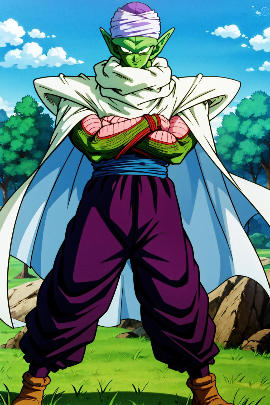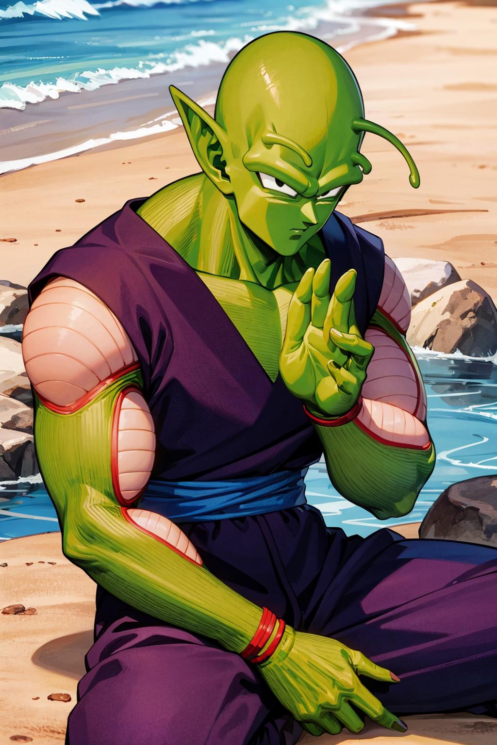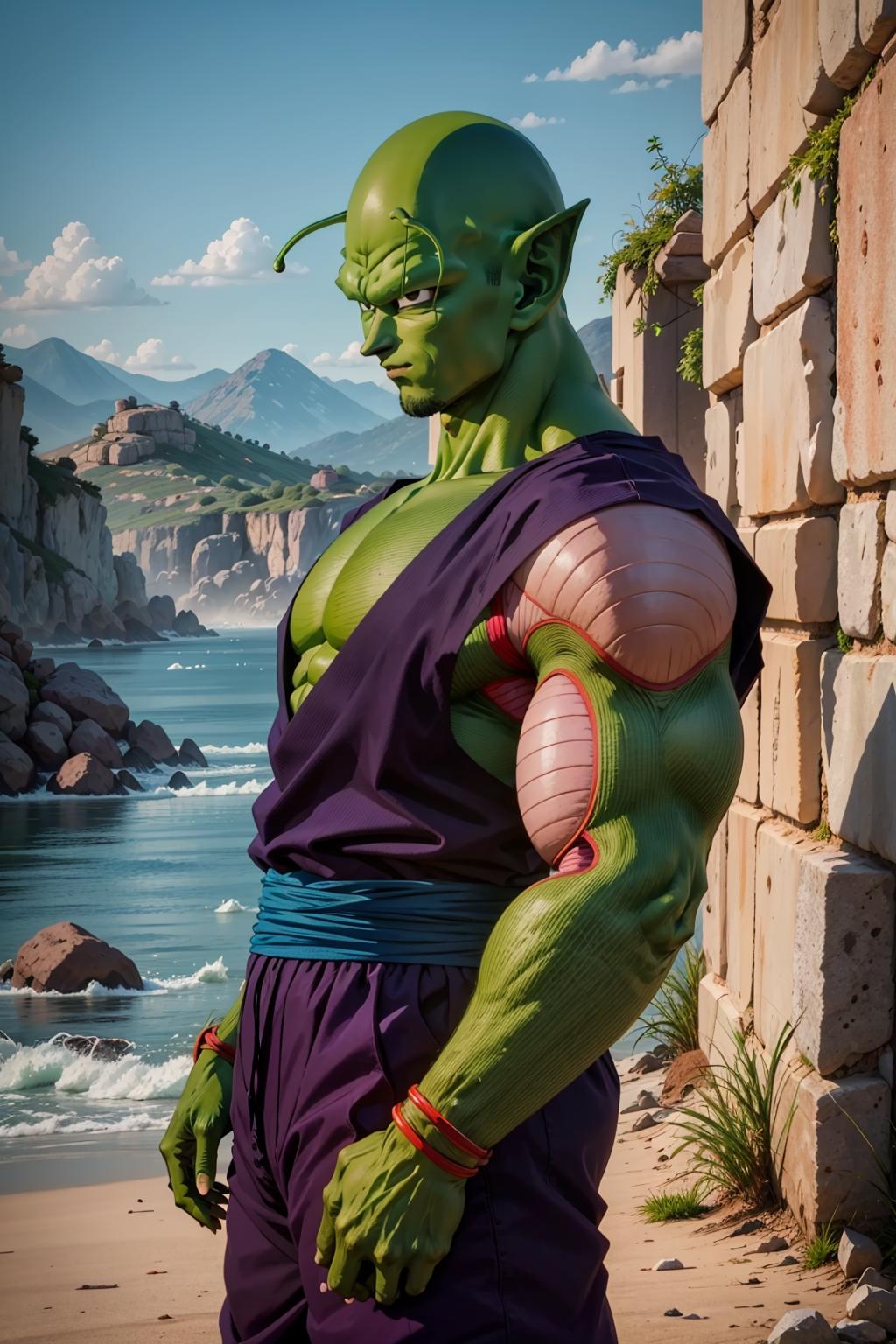 His appearance is piccolo, bald, green skin, pointy ears, black eyes, oni horns, pink patches Yes, I replaced the antennae tag for oni horns in the meantime because they tend to be two, be on the forehead and are symmetric, otherwise it ends up with a lot and the face overall is a mess. They can be inpainted the last time I tried at least, so is better to be missing one than have to remove 4. Also, he can have his manga/super heroyellow patches. The source is mostly old, so I recommend using hires with 0.3-0.5 denoise depending on the model.