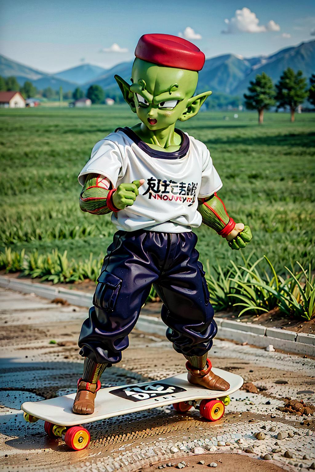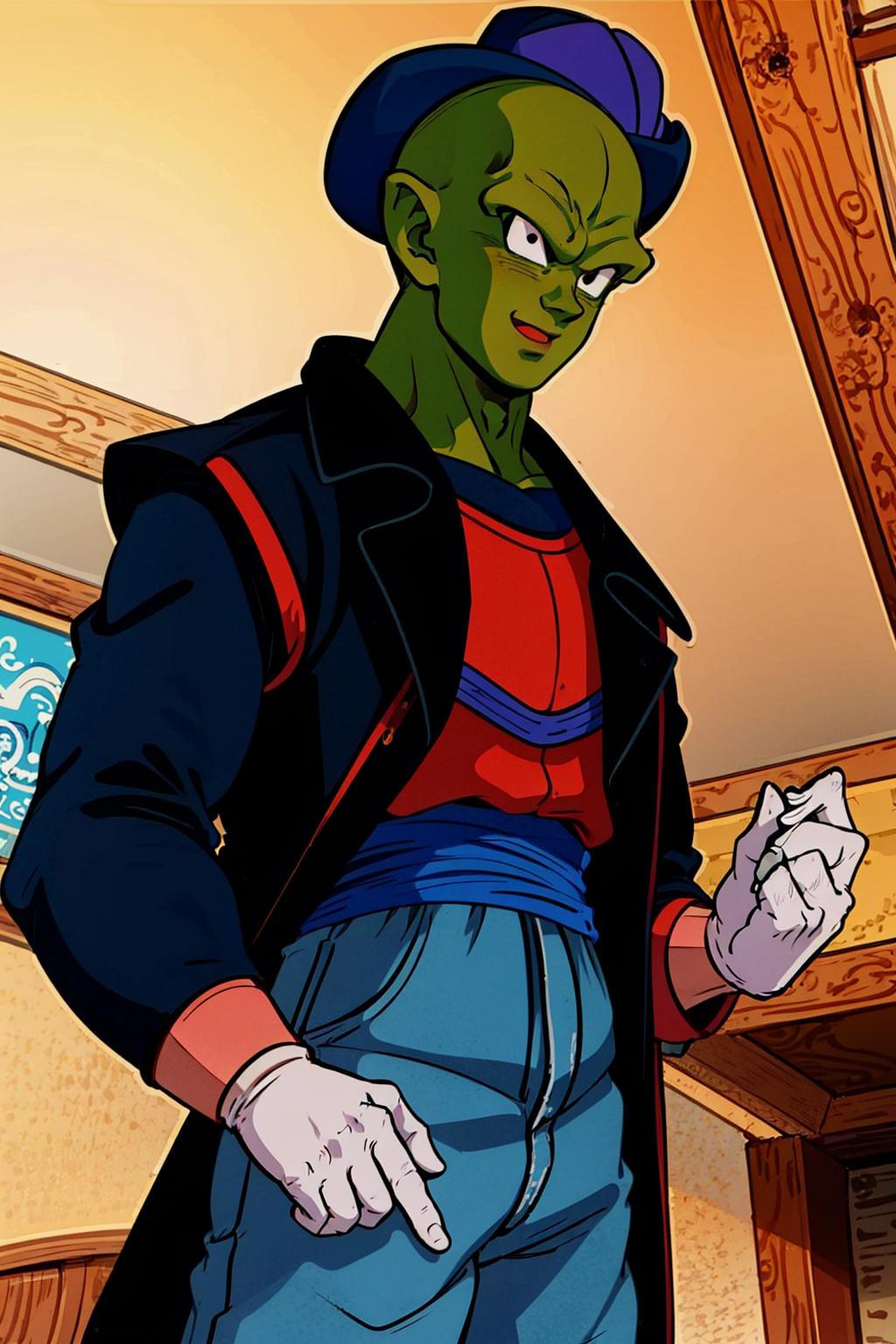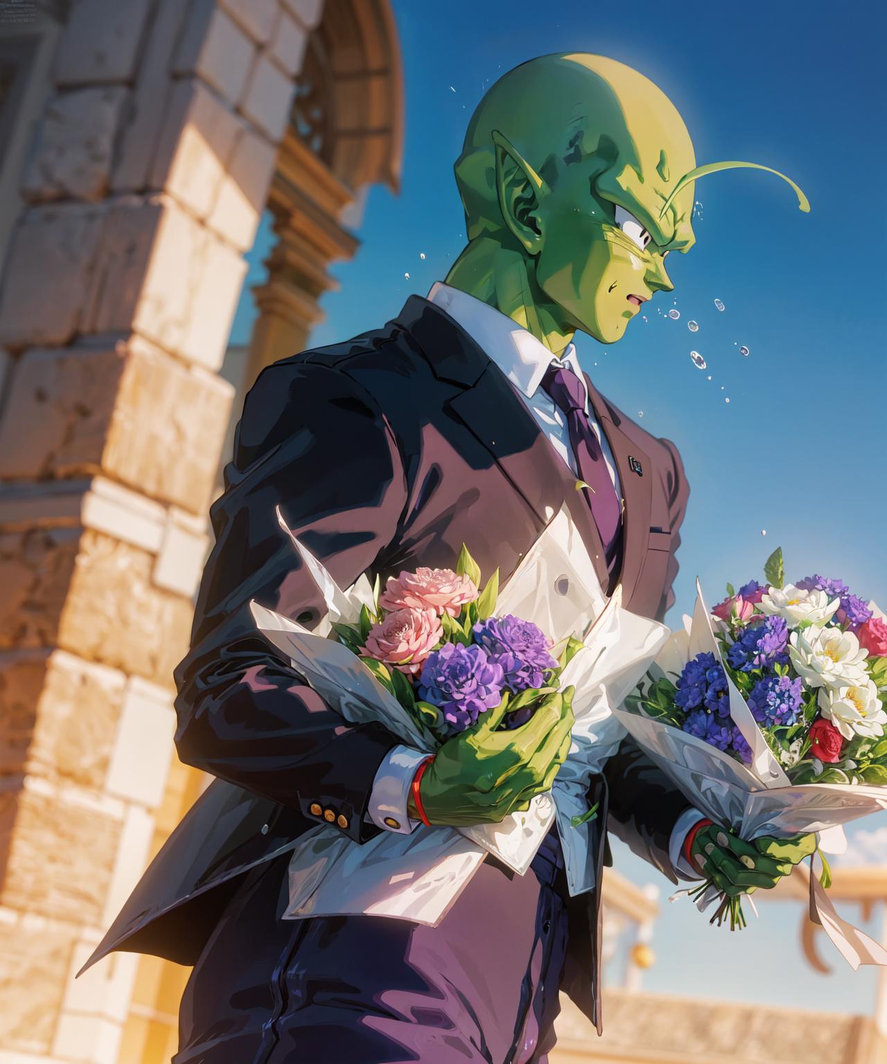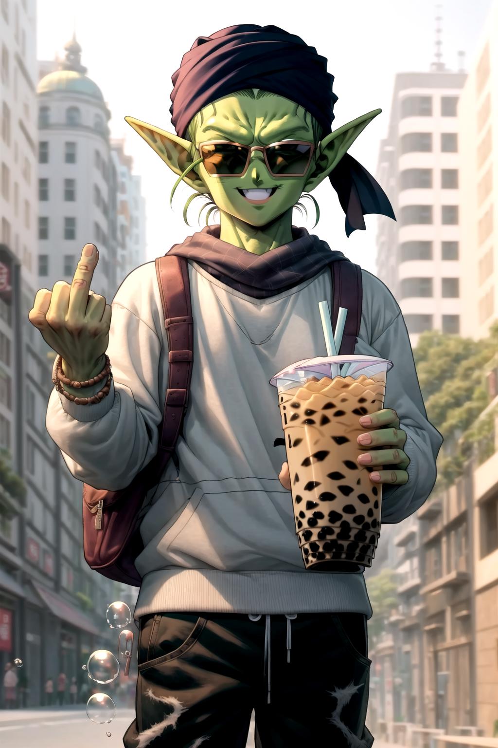His appearance is piccolo, bald, green skin, pointy ears, black eyes, oni horns, pink patches Yes, I replaced the antennae tag for oni horns in the meantime because they tend to be two, be on the forehead and are symmetric, otherwise it ends up with a lot and the face overall is a mess. They can be inpainted the last time I tried at least, so is better to be missing one than have to remove 4. Also, he can have his manga/super heroyellow patches. The source is mostly old, so I recommend using hires with 0.3-0.5 denoise depending on the model.