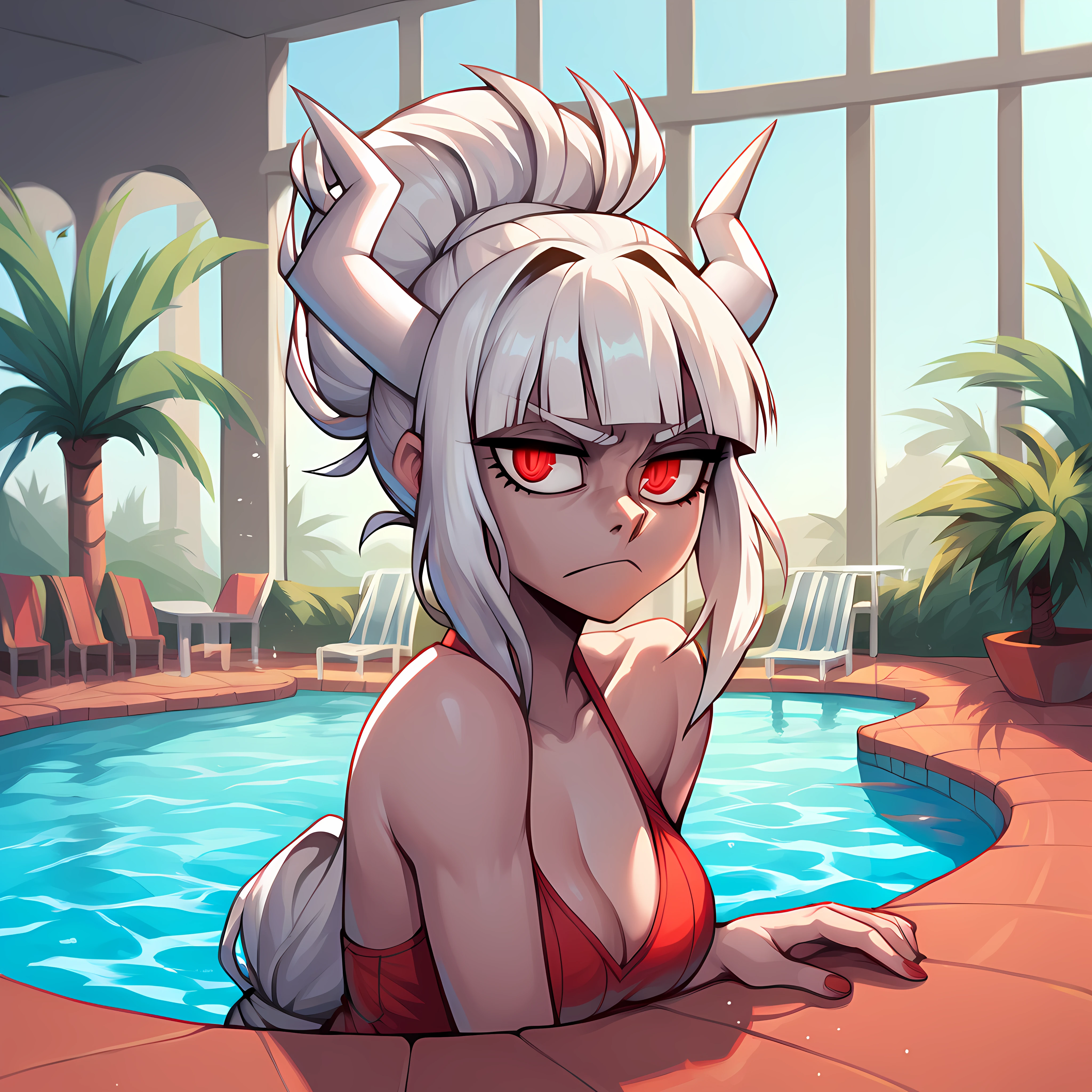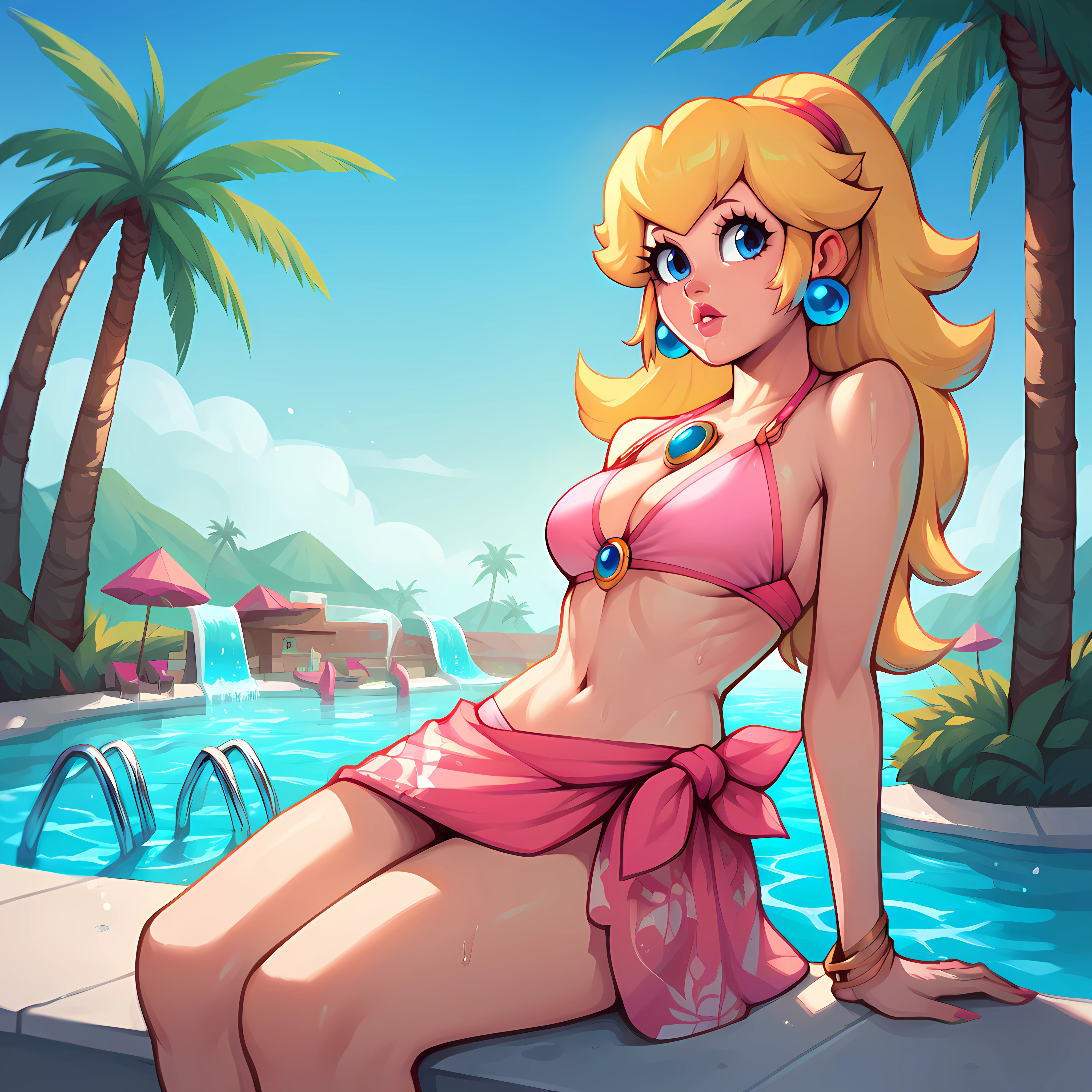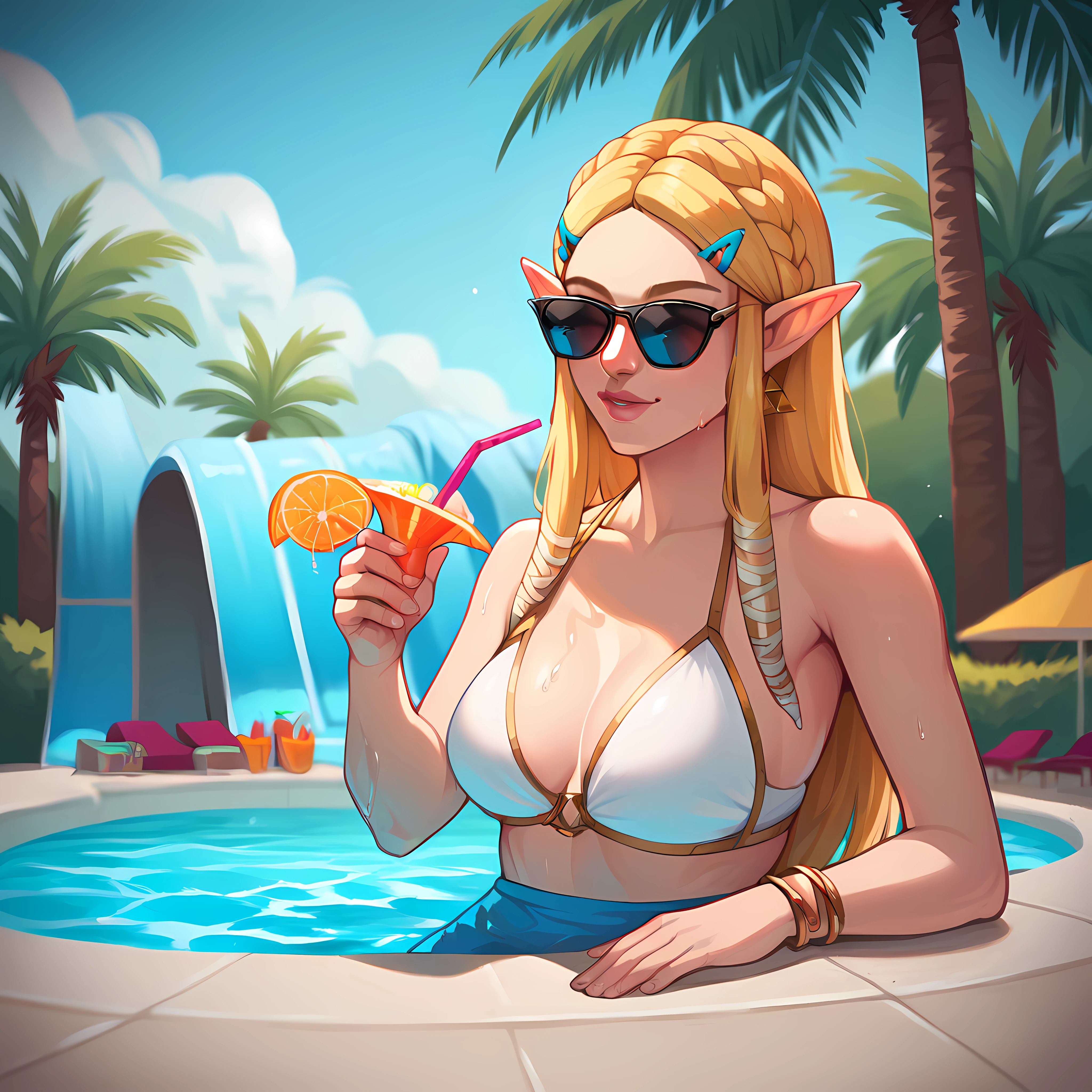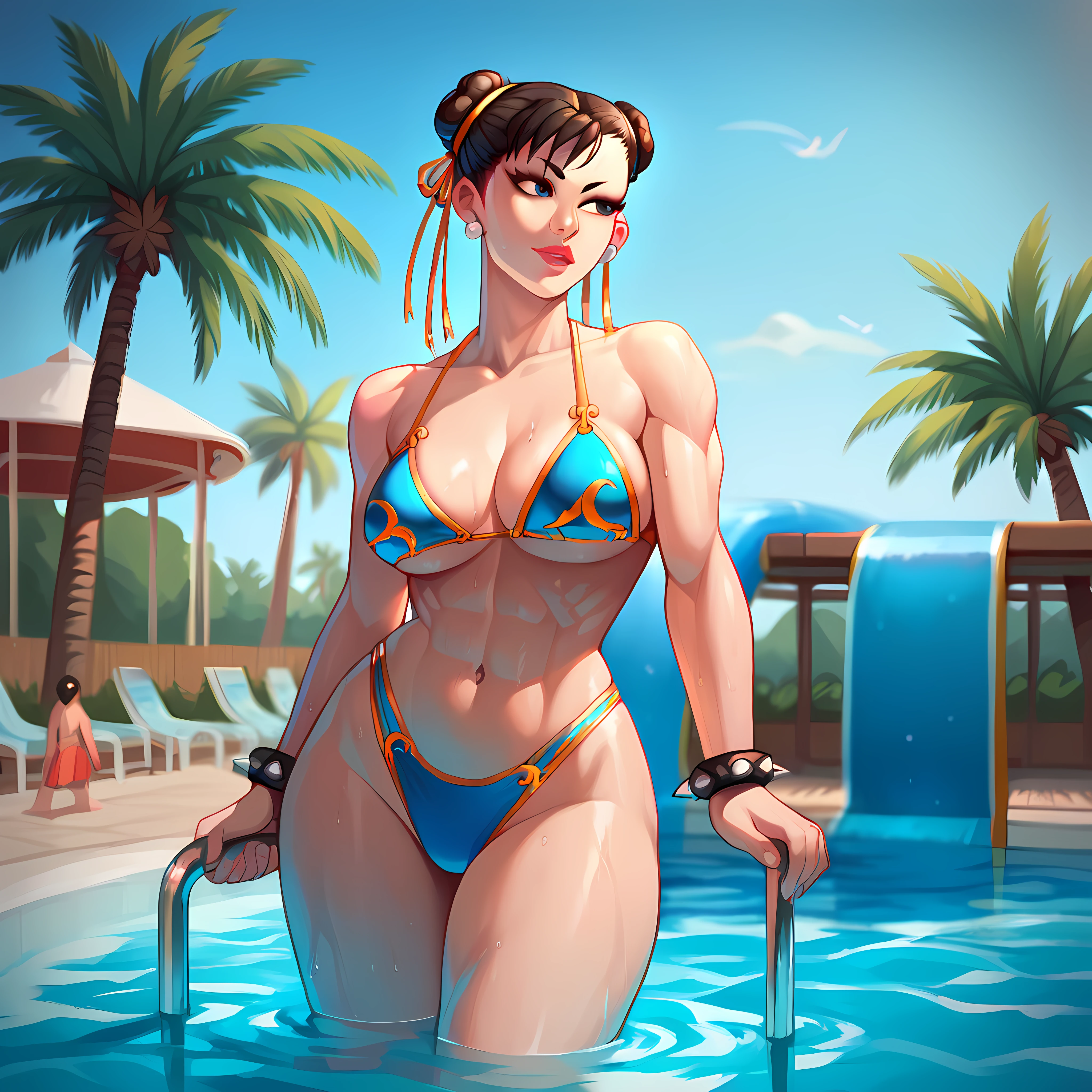 outdoors, pool, blue sky, water slides, palm tree